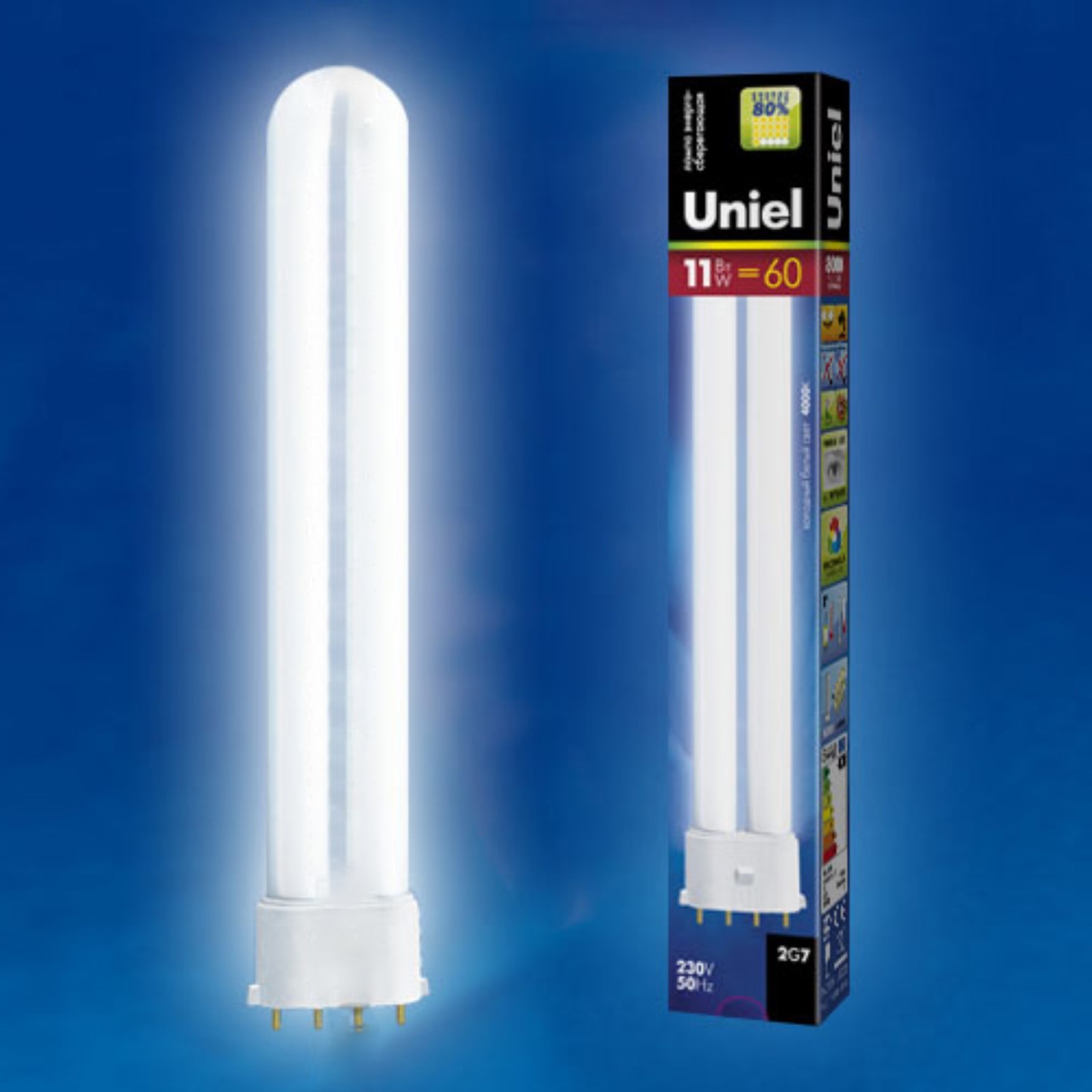 Лампа люминесцентная uniel, 2g7, 11 вт, 4000к, свечение белое. Цвет свечения: Белый Цоколь: 2G7 Диаметр, мм: 27 Длина, мм: 27 Ширина, мм: 27 Высота, мм: 222 Мощность, Вт: 11 Гарантийный срок, мес.: 12 Напряжение, В: 230 Световой поток, лм: 655 Срок службы лампы, час: 10000 Класс энергопотребления: A Цветовая температура: 4000К  развернуть описание ▼