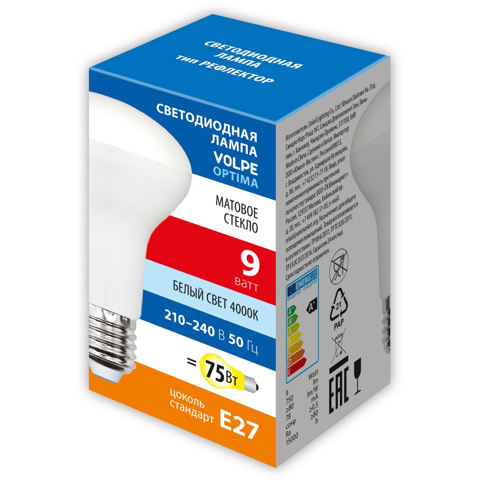 Лампа светодиодная uniel, e27, 9 вт, 4000к, свечение белое. Цвет свечения: Белый Вид лампы: Светодиодная Вид лампы: Энергосберегающая Вид лампы: Накаливания Цоколь: E27 Ширина, мм: 63 Высота, мм: 100 Мощность, Вт: 9 Коэффициент мощности: 0.5 Гарантийный срок, мес.: 24 Угол рассеивания, °: 120 Напряжение, В: 210 Напряжение, В: 240 Световой поток, лм: 750 Срок службы лампы, час: 15000 Материал: Термопластик Класс энергопотребления: A+ Цветовая температура: 4000К Форма лампы: Рефлектор Индекс цветопередачи: RA > 80 Диммируемая: Нет Рабочая температура, С°: от -20 до +40 °С Класс энергоэффективности: A+  развернуть описание ▼