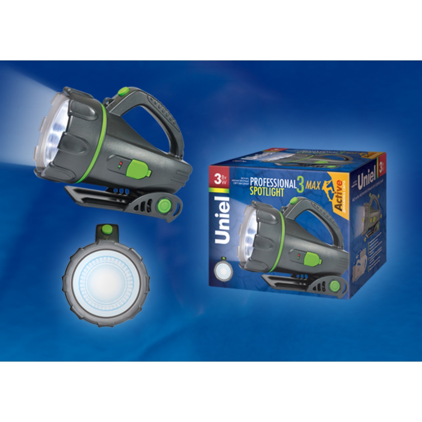 Фонарь uniel серии «стандарт» professional spotlight - 3 max uniel, луч 100 м, цвет чёрный. Вид лампы: Светодиодная Цвет: Чёрный Цоколь: Встроенные LED Длина, мм: 195 Ширина, мм: 120 Высота, мм: 150 Количество светодиодов: 1 Гарантийный срок, мес.: 12 Материал корпуса: Пластик Материал: Пластик Тип питания: От аккумулятора  развернуть описание ▼