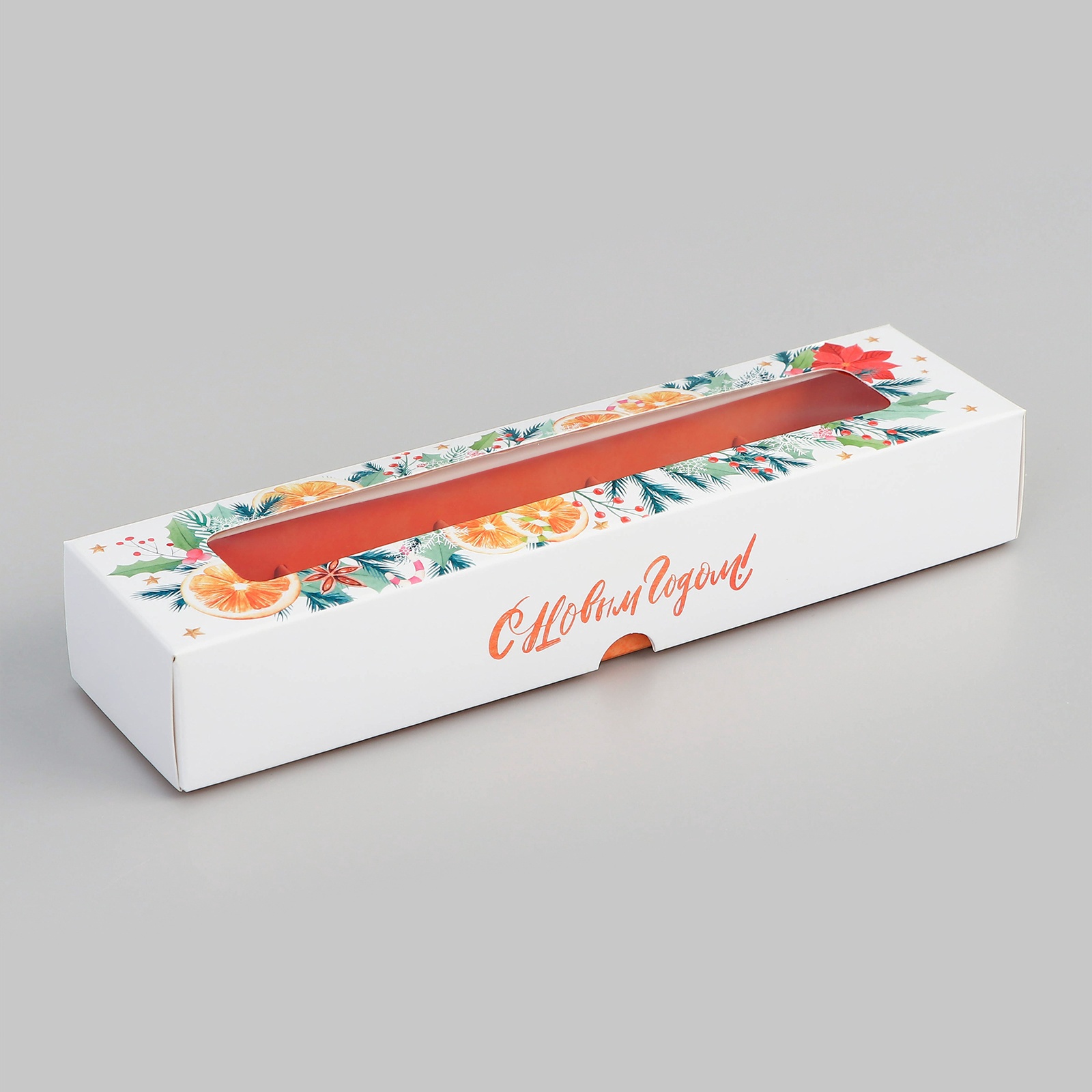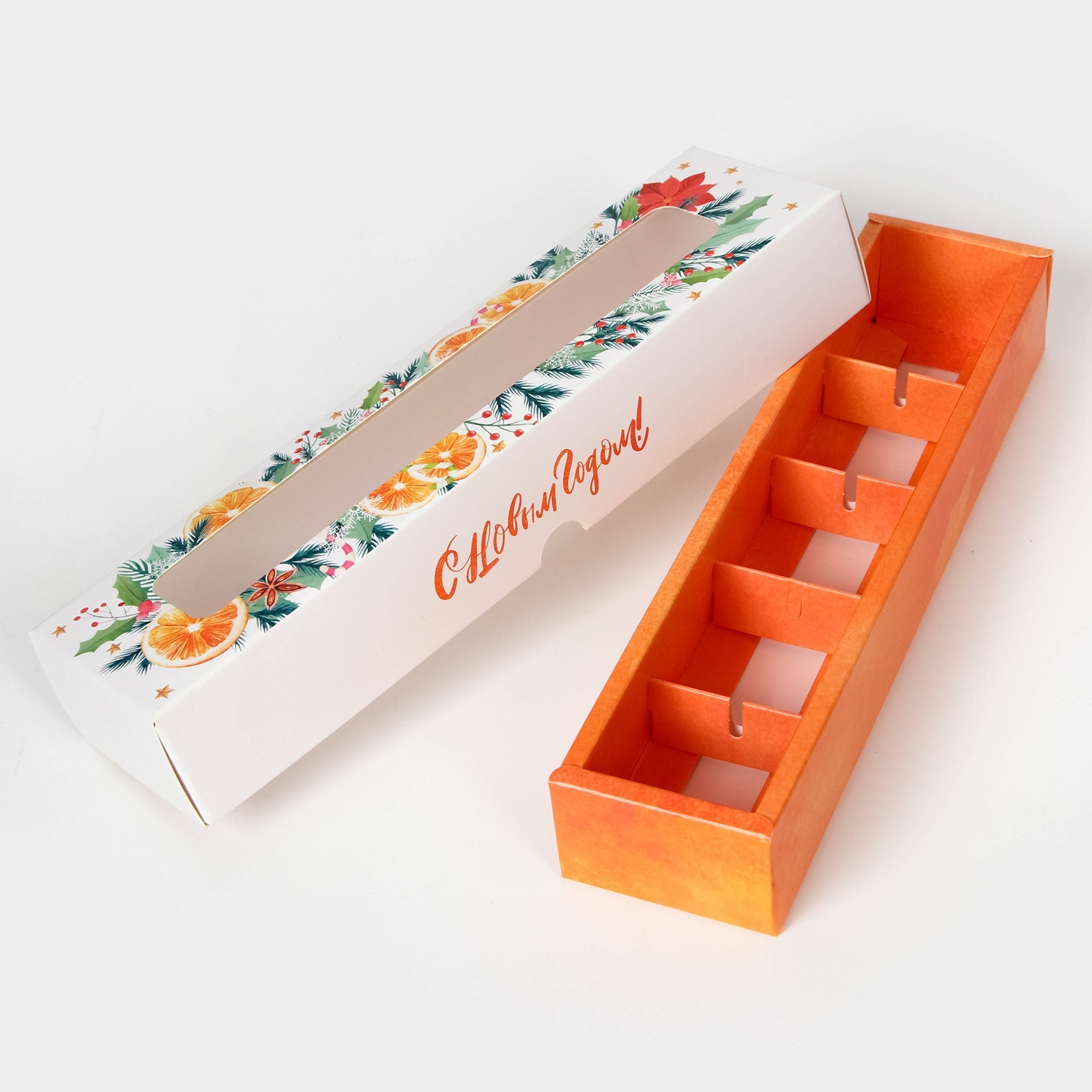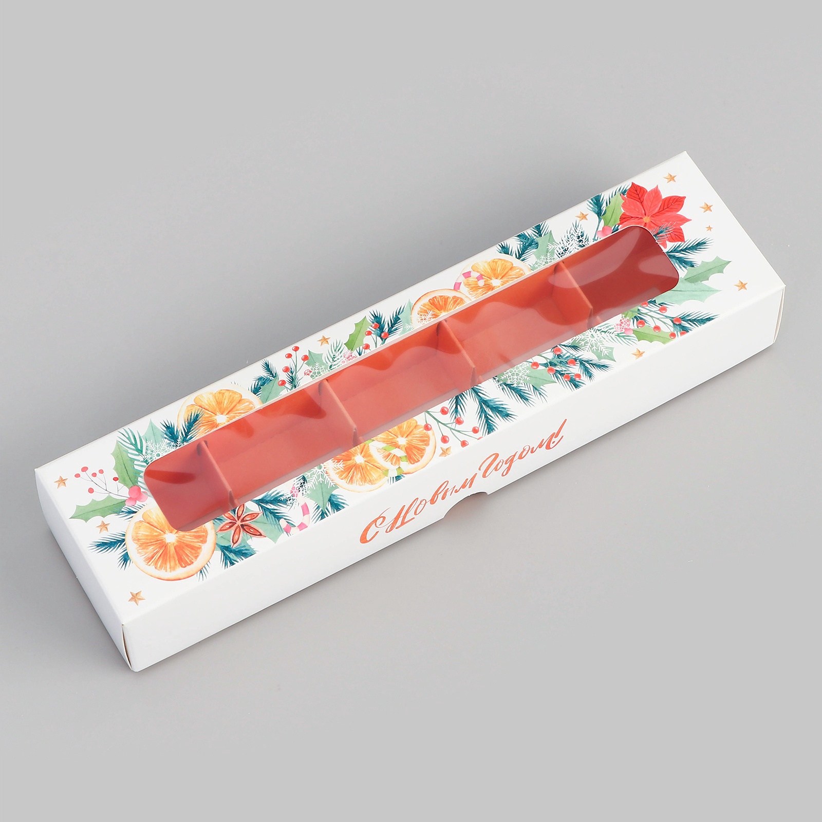 Коробка под 5 конфет новогодняя «с новым годом», 21 5 3 см. Коробка под 5 конфет Новогодняя размером 21х5х3,3 см - это прекрасный выбор для упаковки сладостей к празднику. Она выполнена в ярких новогодних цветах, что создает атмосферу праздника и волшебства. Коробка имеет прямоугольную форму и состоит из двух частей: верхней крышки и нижней части. Верхняя крышка украшена красивым рисунком, который подчеркивает новогоднюю тематику. Нижняя часть коробки предназначена для размещения конфет. Размеры коробки позволяют упаковать 5 штук конфет, что делает ее удобной для использования в качестве подарка или для домашнего использования. Коробка изготовлена из качественного картона, который обеспечивает надежную защиту содержимого от внешних воздействий. Эта коробка для конфет станет прекрасным дополнением к новогоднему столу или подарком для близких и друзей. Она создаст праздничное настроение и подарит радость всем, кто получит такой подарок. Вид упаковки:Универсальная|Вид упаковки:Для шоколада|Вид упаковки:Для конфет|Цвет:Оранжевый|Цвет:Белый|Форма:Прямоугольная|Плотность, г/м :270|Длина, см:21|Ширина, см:5|Высота, см:3.3|Количество ячеек:5|Вместимость, шт.:5|Тематика:Рождественская|Тематика:Новогодняя|Рисунок:Да|Символ года:Нет|Тематика праздника:Рождество|Тематика праздника:Новый год|Материал:Картон|Вид:Кондитерские коробки|Вид еды:Для шоколада|Вид еды:Для десертов|Вид еды:Для конфет|Вид:Складные коробки|Вид:Квадратные|Вид:Коробки-пеналы|Вид:Крафт коробки|Размер:Средний (18-24 см)|Страна:Китай  развернуть описание ▼