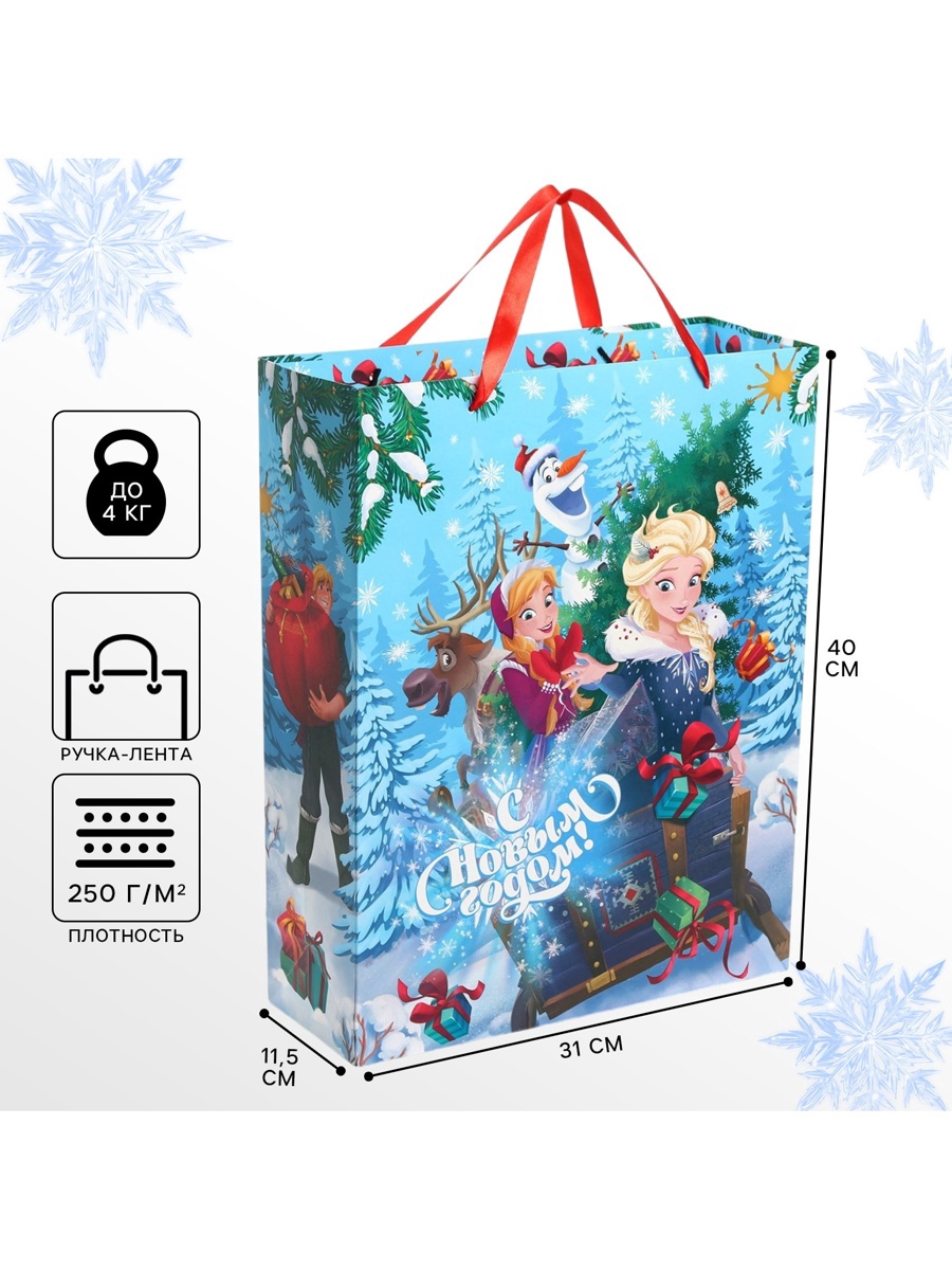 Пакет подарочный новогодний «с новым годом», 31 х 40 х 11.5 см, упаковка, холодное сердце. Цвет:Голубой|Для кого:Для девочки|Плотность, г/м :210|Допустимый вес вложения, г:3000|Тематика:Новогодняя|Символ года:Нет|Тематика праздника:Новый год|Материал:Картон|Отделка пакета:Ламинация|Вид ручки:Ручка-лента|Страна:Китай  развернуть описание ▼