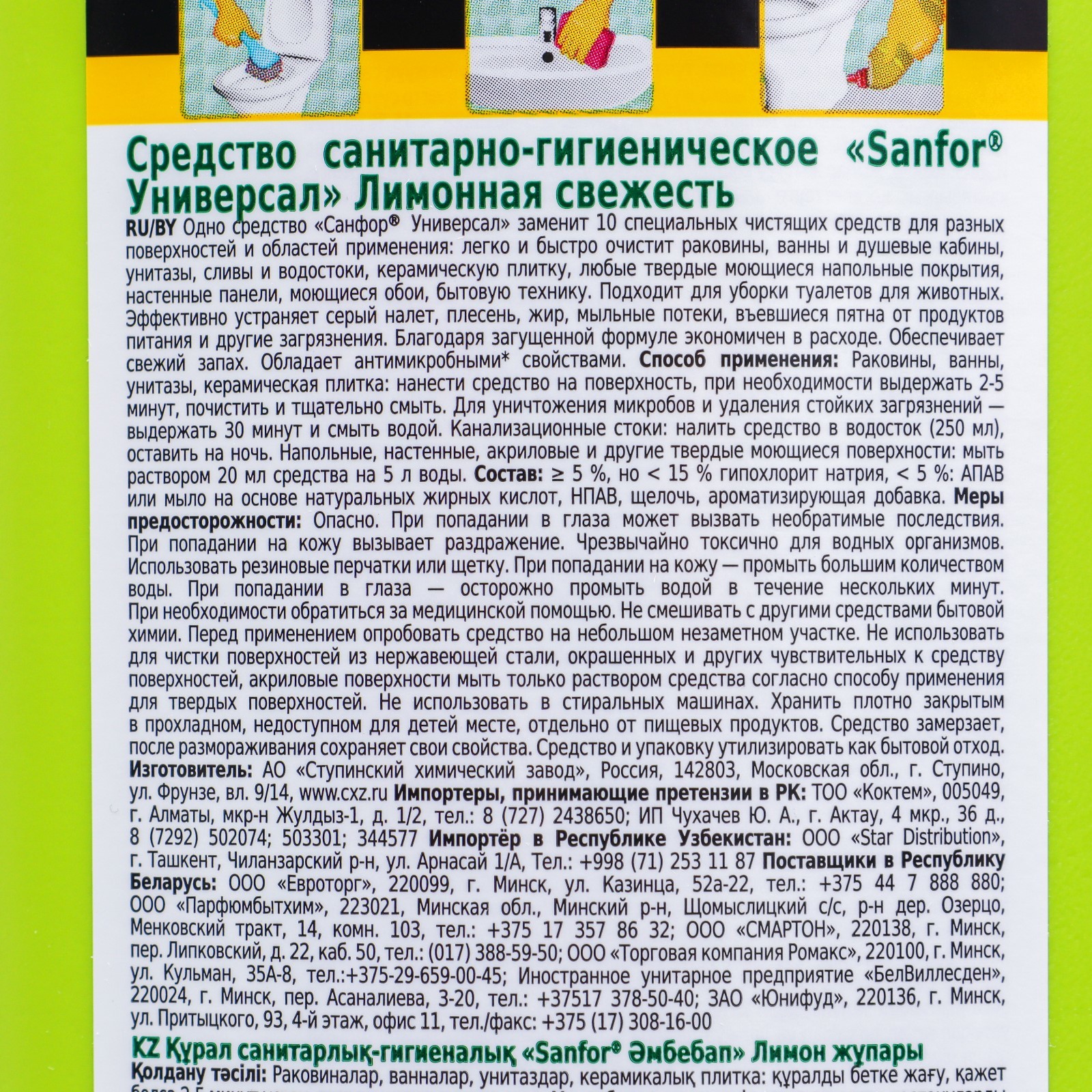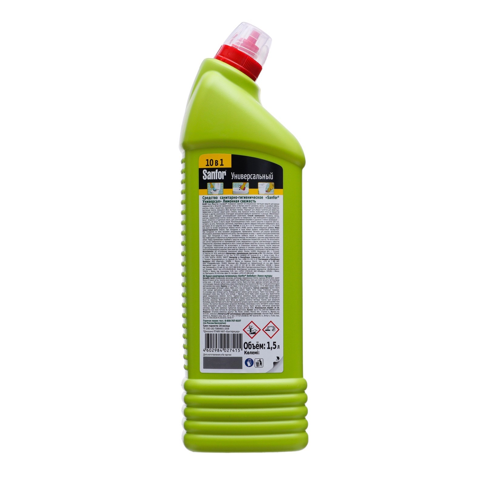 Чистящее универсальное средство sanfor, лимонная свежесть, 1,5 л. Гель для унитаза WC "Антиналет" от Sanfor - это идеальное средство для чистки, защиты и освежения вашего унитаза. Борьба с известковым налетом, ржавчиной, мочевым камнем и неприятными запахами становится проще благодаря этому чистящему гелю. Он универсальный и подходит для эффективного использования в унитазе, биде, писсуаре и других элементах сантехники (кроме мрамора, акрила, эмали и хрома). Очиститель обладает улучшенной мощной формулой, которая позволяет справиться с самыми упрямыми загрязнениями в туалете. Он проникает в каждый уголок поверхности унитаза и мгновенно удаляет солевые отложения и грязь. Благодаря этому средству ваш унитаз станет идеально чистым и свежим. Гель имеет приятный аромат лимона, который надолго оставляет ощущение свежести после каждого мытья. Кроме того, он дезинфицирует поверхность унитаза, уничтожая бактерии и микробы, и обеспечивает безопасность для вашей семьи. Этот гель является безопасным бытовым химическим средством (не содержит хлор), которое не только чистит, но и дезинфицирует поверхность. Его уникальная формула, основанная на щавелевой и лимонной кислоте, делает его идеальным для устранения загрязнений, грязи и налета, обеспечивая максимальную чистоту и гигиену. Бытовая химия от Санфор - это надежные моющие средства для уборки и поддержания чистоты и блеска вашего дома. Объём, мл: 1500 Температурное ограничение: Нет  развернуть описание ▼