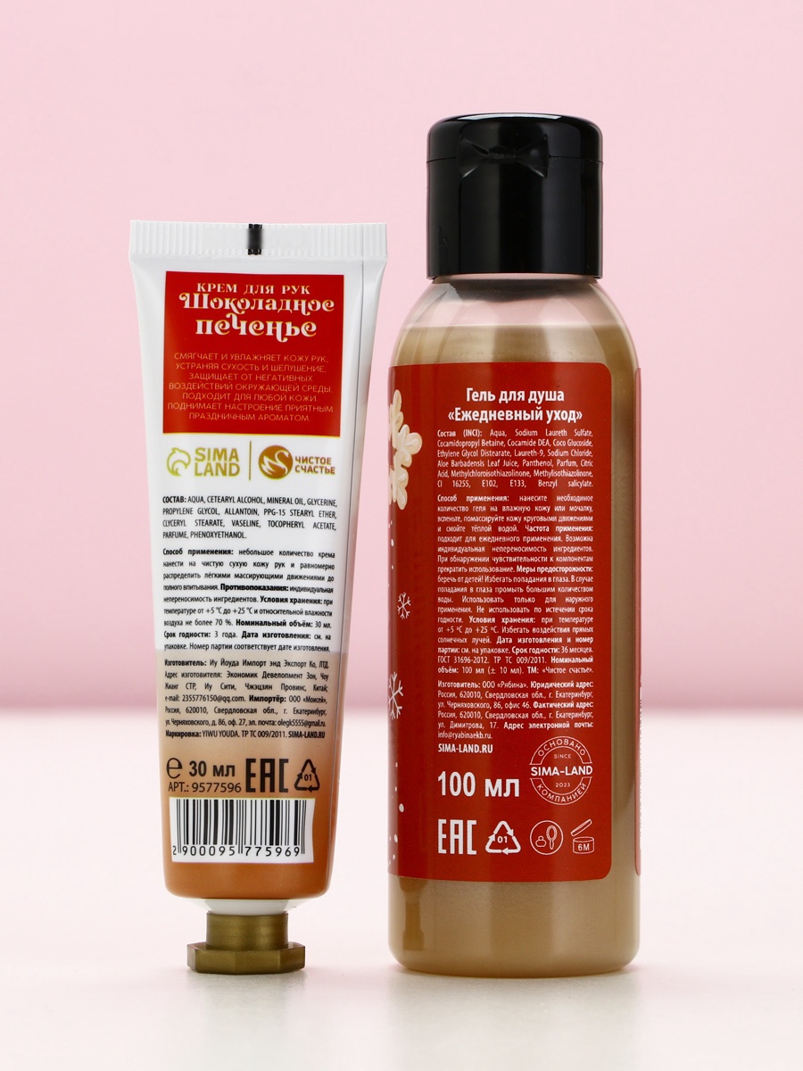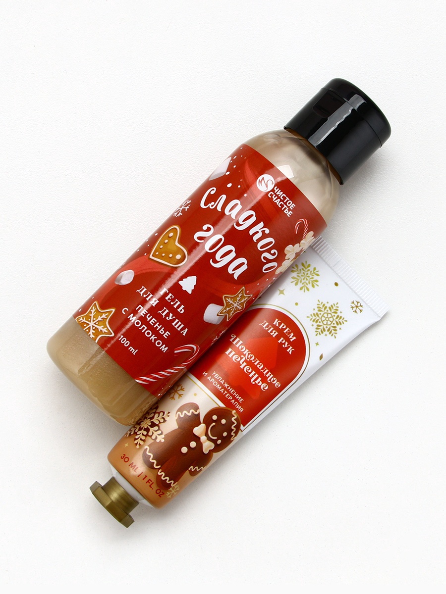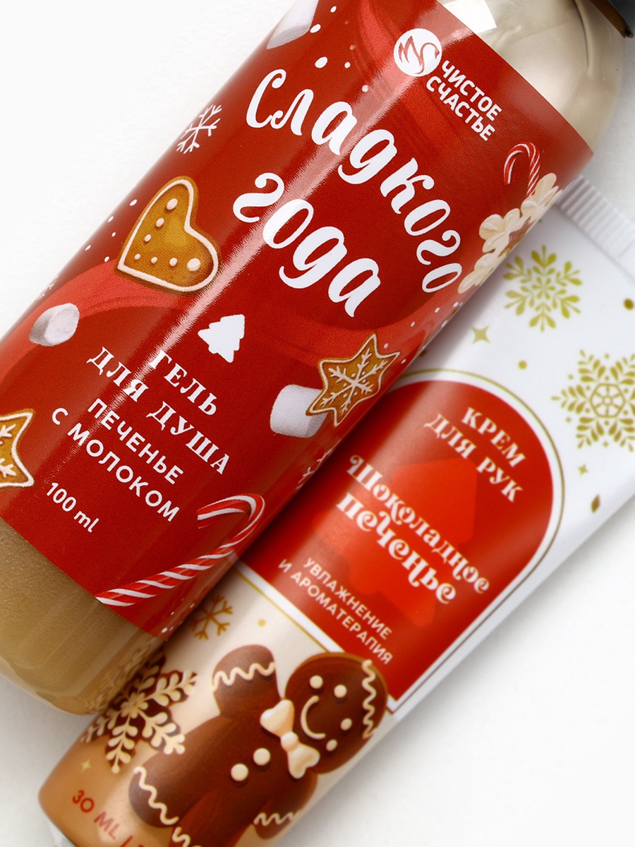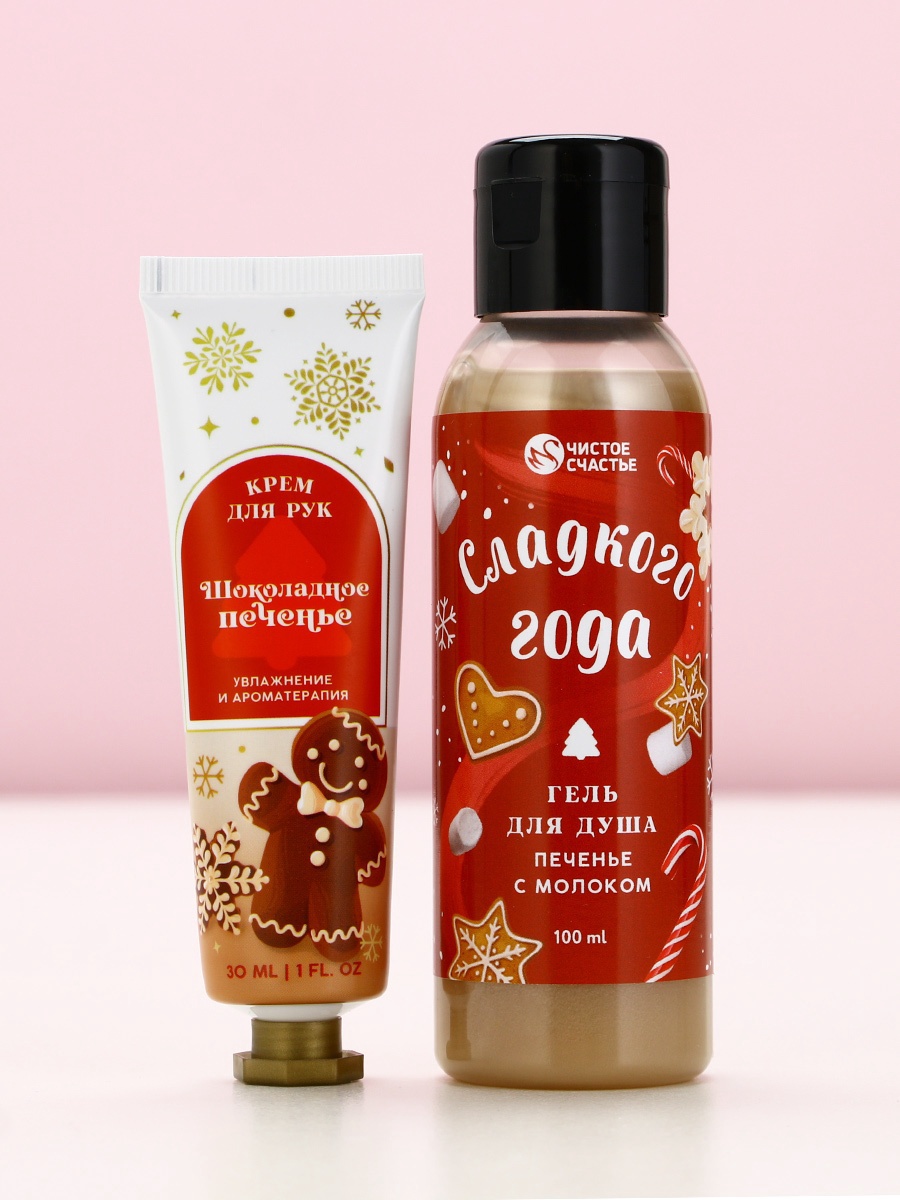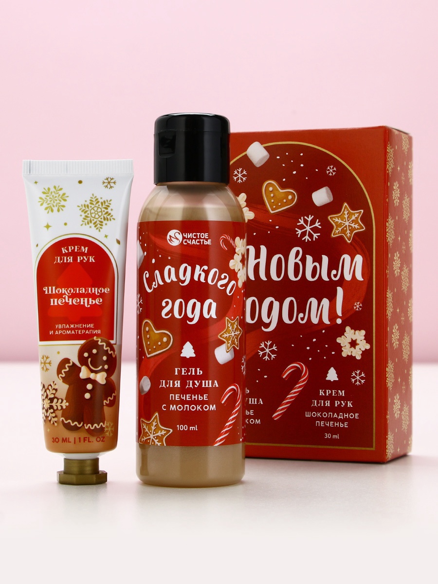 Подарочный набор женский «с новым годом», гель для душа 100 мл и крем для рук 30 мл, чистое счастье. Набор:Да|Цвет:Красный|Для кого:Для женщины|В наборе, шт.:2|Объём, мл:30|Объём, мл:100|Тематика:Новогодняя|Вид упаковки:Подарочная коробка|Символ года:Нет|Тематика праздника:Новый год|Адресат:Без адресата|Возраст:Взрослый|Аромат:Шоколадное печенье|Аромат:Печенье с молоком|Составляющие набора:Крем для рук|Составляющие набора:Гель для душа|Темпер. ограничение НЕ НИЖЕ :+5|Темпер. ограничение НЕ ВЫШЕ :+25|Возраст:Для взрослых|Назначение:Очищение, детокс|Назначение:Увлажнение|Форма выпуска:Флакон без дозатора|Страна:Россия  развернуть описание ▼