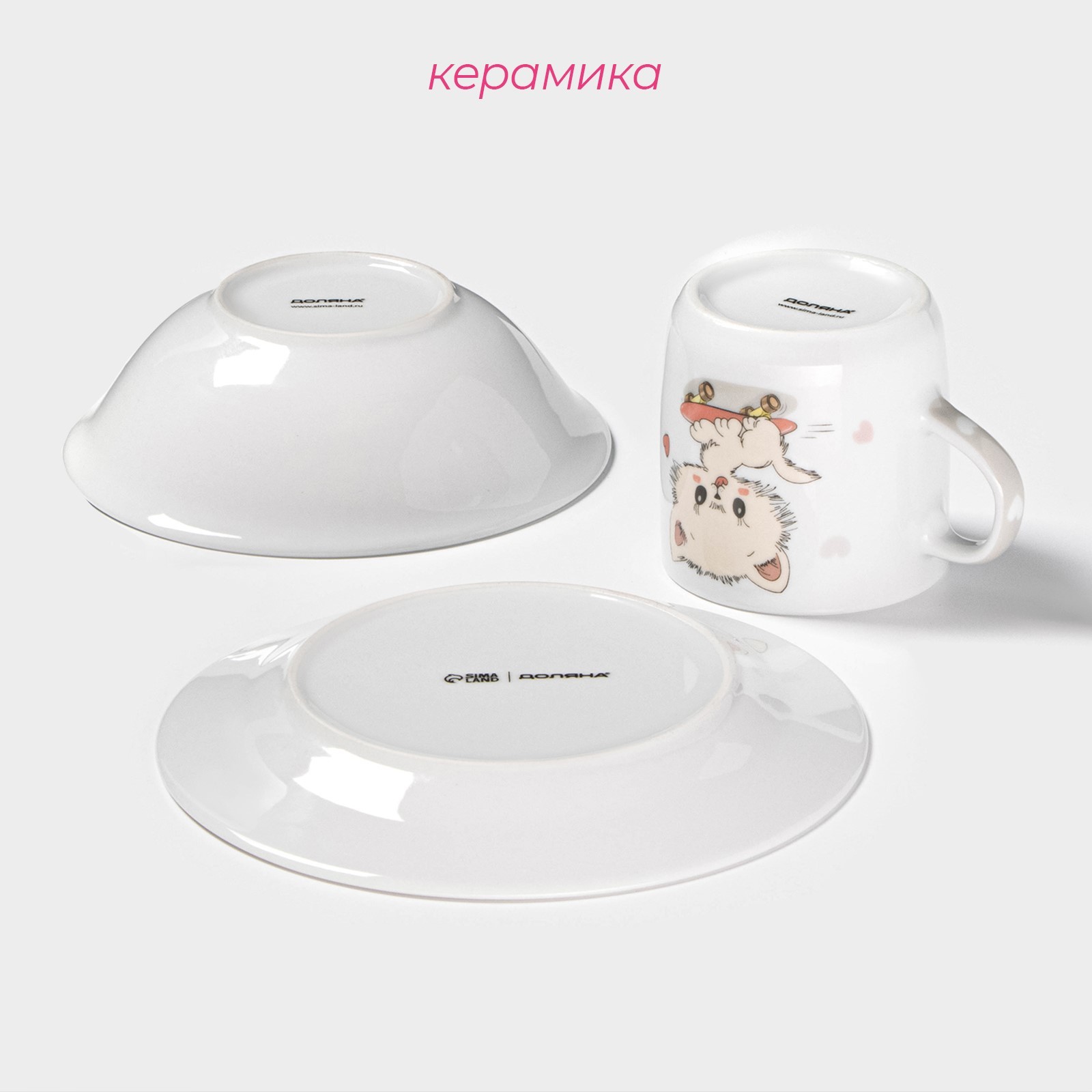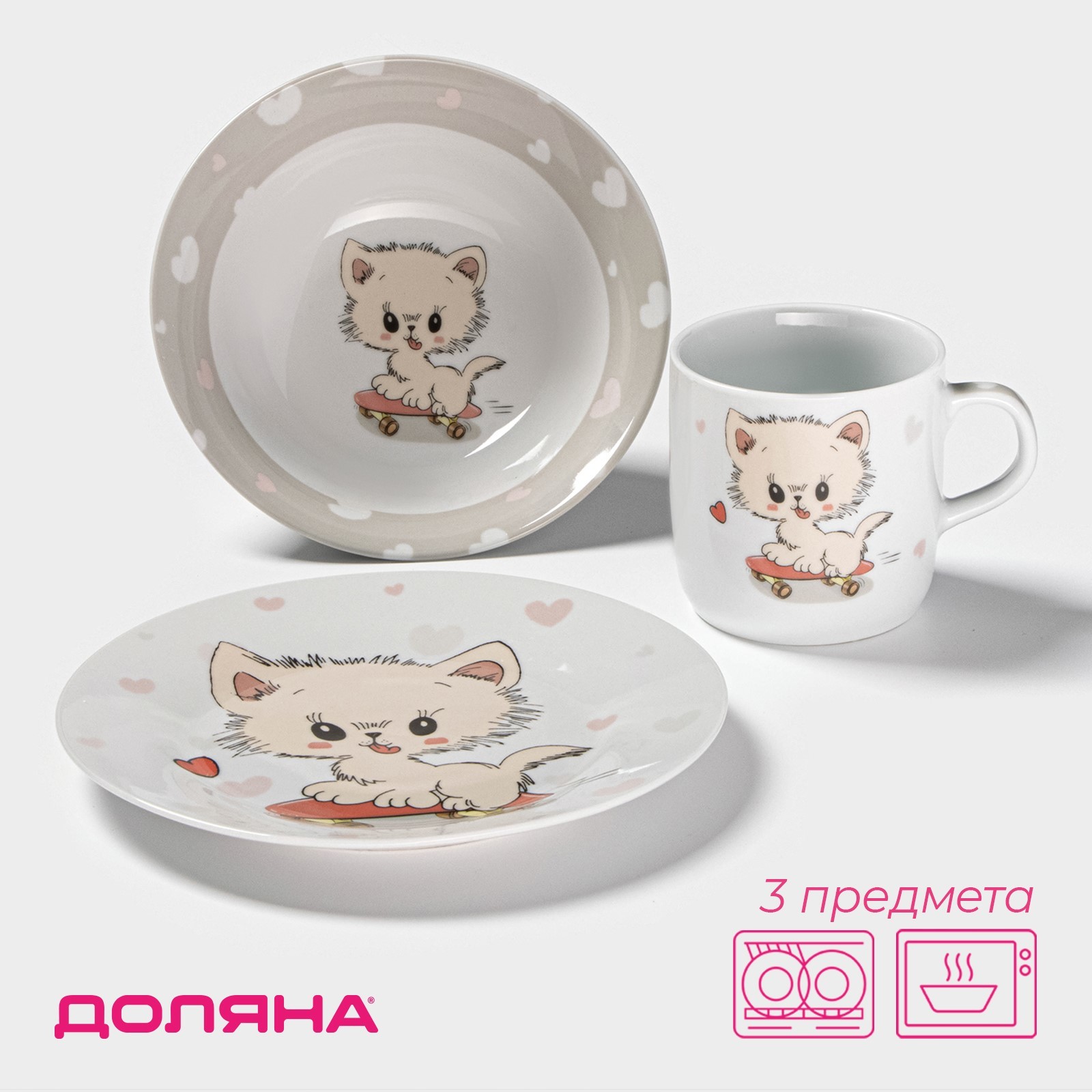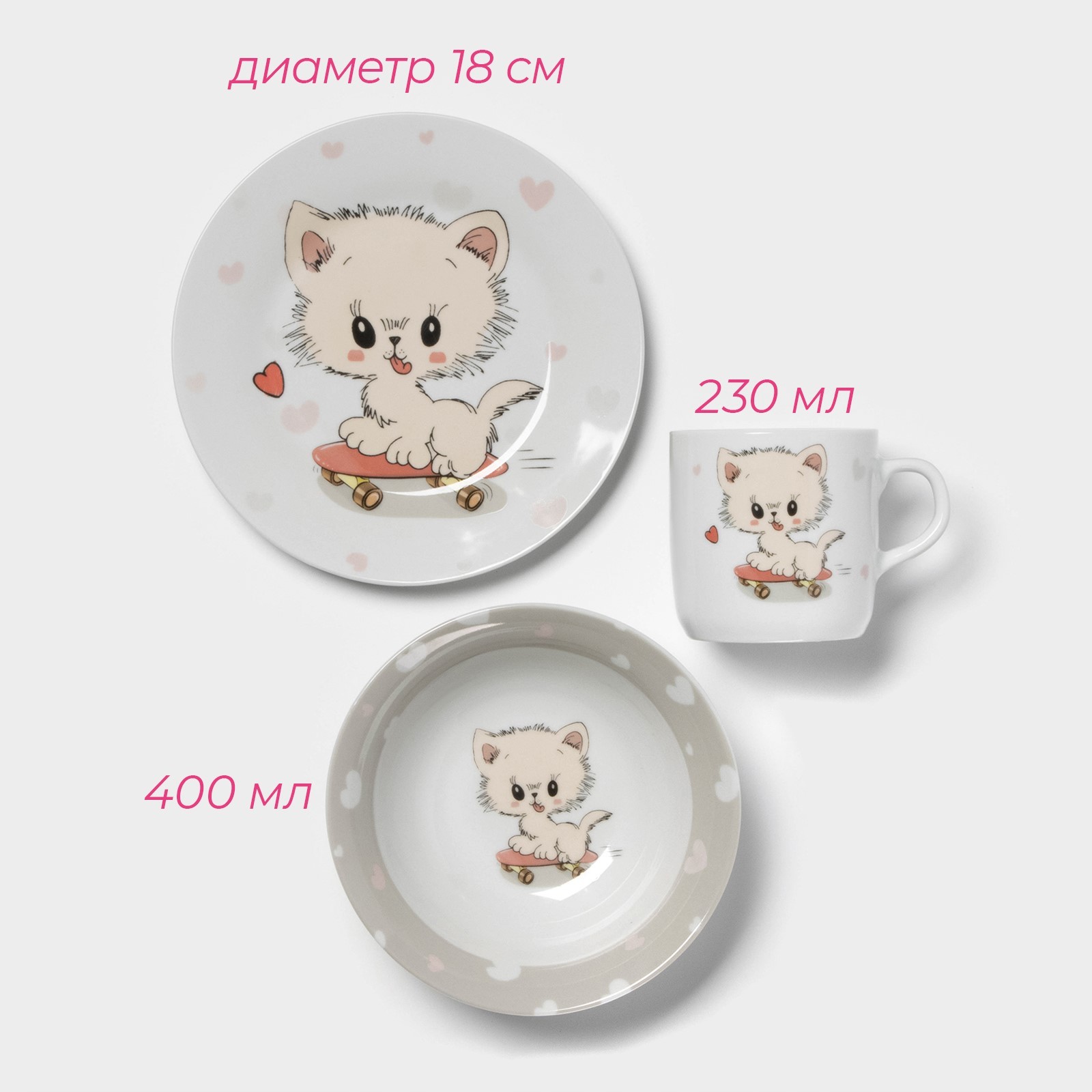 Набор детской посуды доляна «котёнок на скейте», 3 предмета: кружка 230 мл, миска 400 мл, тарелка D=18 см, цвет белый