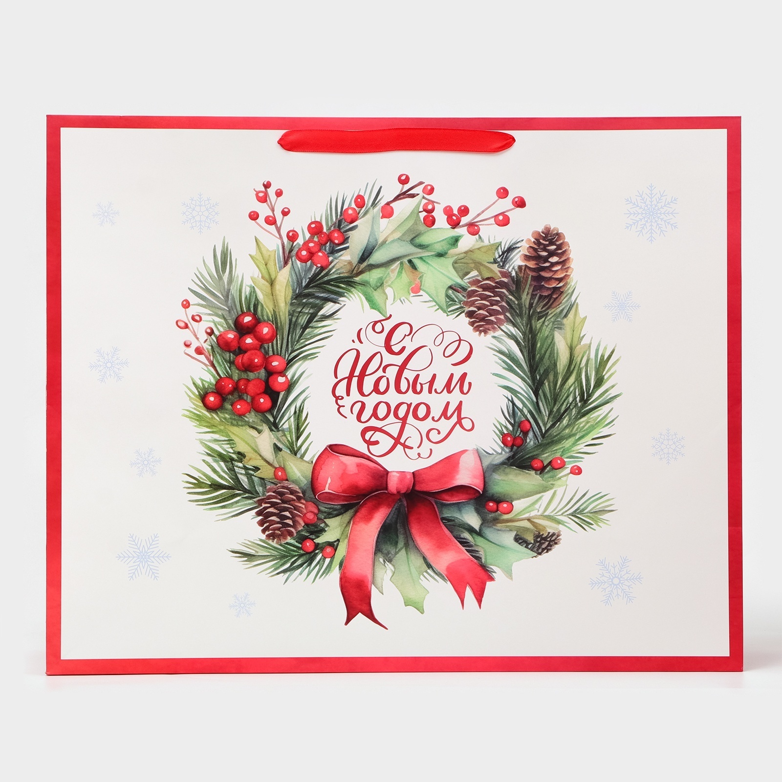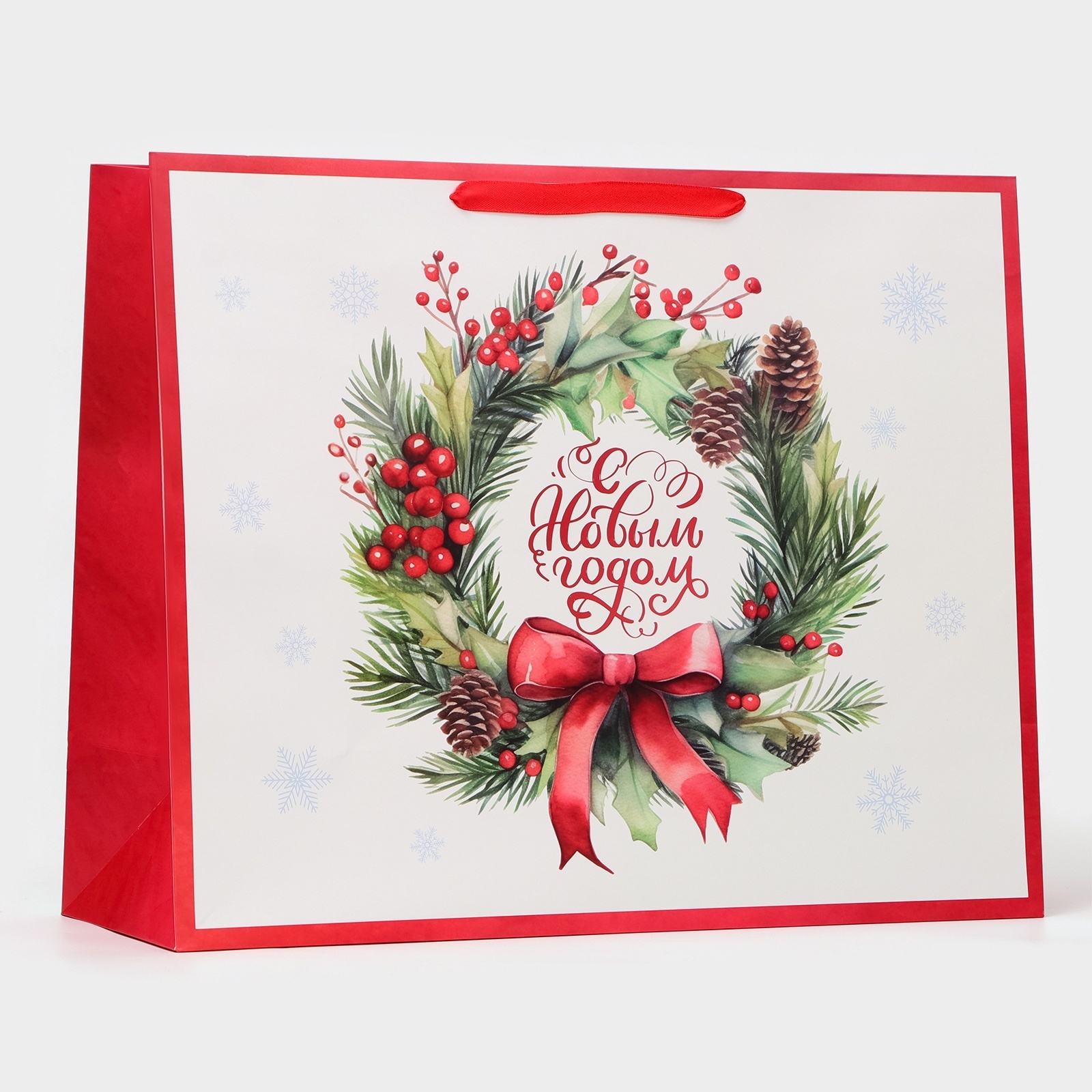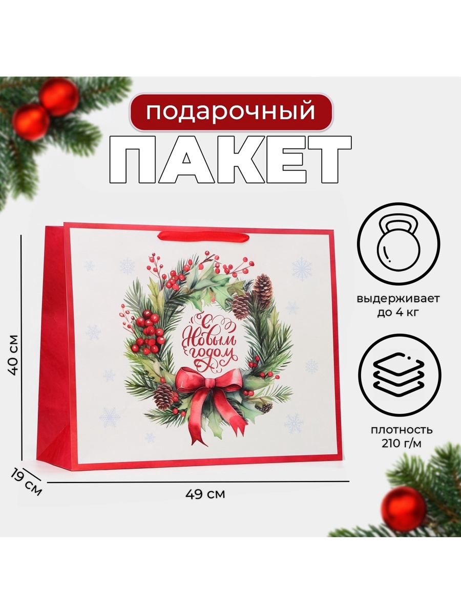 Пакет ламинированный горизонтальный «венок», xl 49 40 19 см. Пакет новогодний ламинированный горизонтальный имеет размеры XL: 49 см в длину, 40 см в ширину и 19 см в высоту. Он выполнен из высококачественного материала, который обеспечивает его прочность и долговечность. Пакет предназначен для упаковки и транспортировки различных товаров, включая одежду, аксессуары и подарки. Он имеет достаточно вместимости для того, чтобы защитить продукты от повреждений и сохранить их свежесть. Ламинирование придает пакету дополнительную прочность и защиту от влаги, что делает его идеальным выбором для использования в любых погодных условиях. Горизонтальная форма пакета позволяет удобно размещать в нем предметы, которые требуют больше места, такие как книги, игрушки или крупные подарки. Яркий и красочный дизайн с новогодними мотивами придает пакету праздничный и жизнерадостный вид. Это делает его идеальным выбором для использования в качестве подарочной упаковки на различные зимние праздники, такие как Новый год или Рождество. Цвет:Белый|Цвет:Красный|Для кого:Унисекс|Плотность, г/м :210|Тематика:Рождественская|Тематика:Новогодняя|Символ года:Нет|Тематика праздника:Рождество|Тематика праздника:Новый год|Отделка пакета:Декор|Отделка пакета:Ламинация|Вид ручки:Ручка-лента|Страна:Китай  развернуть описание ▼
