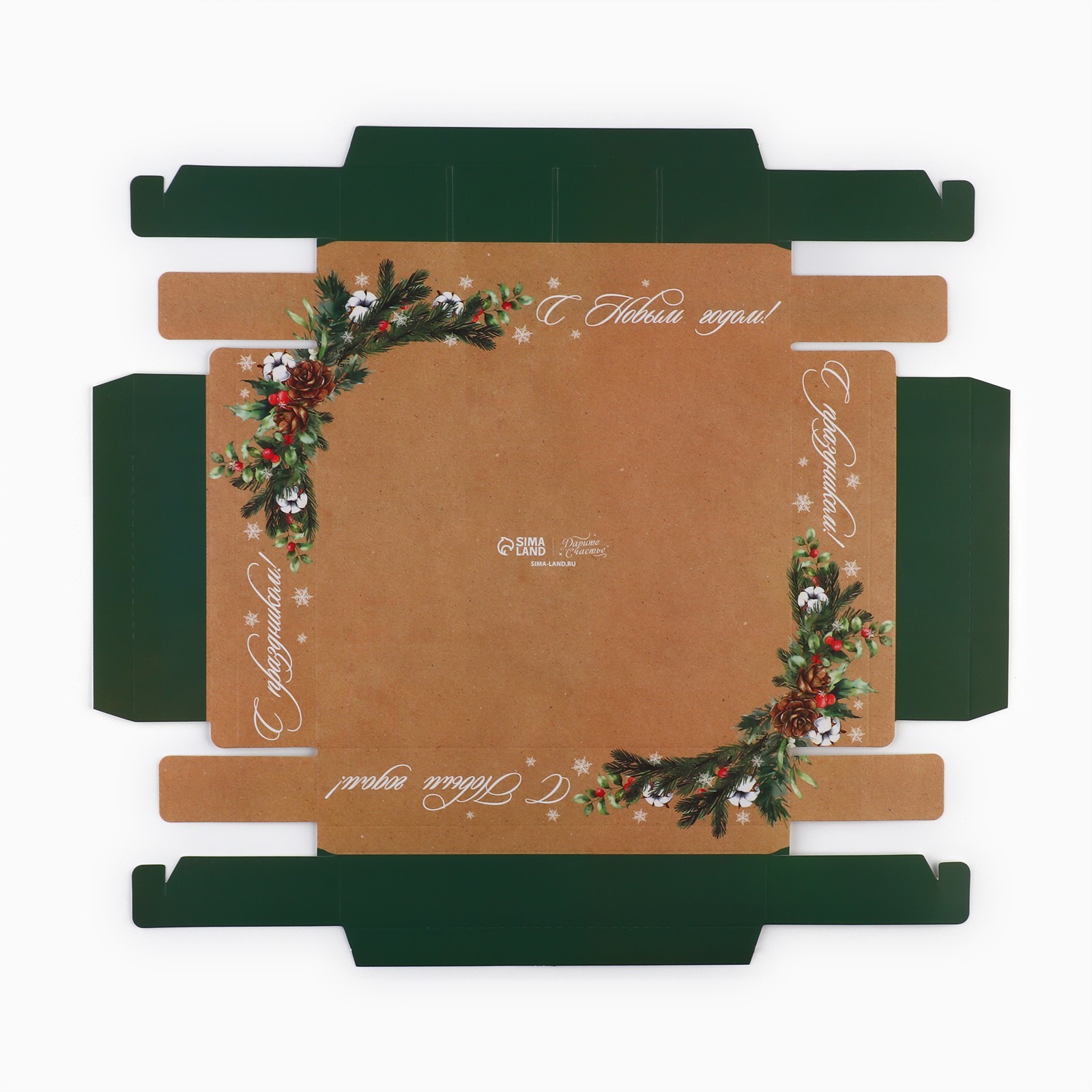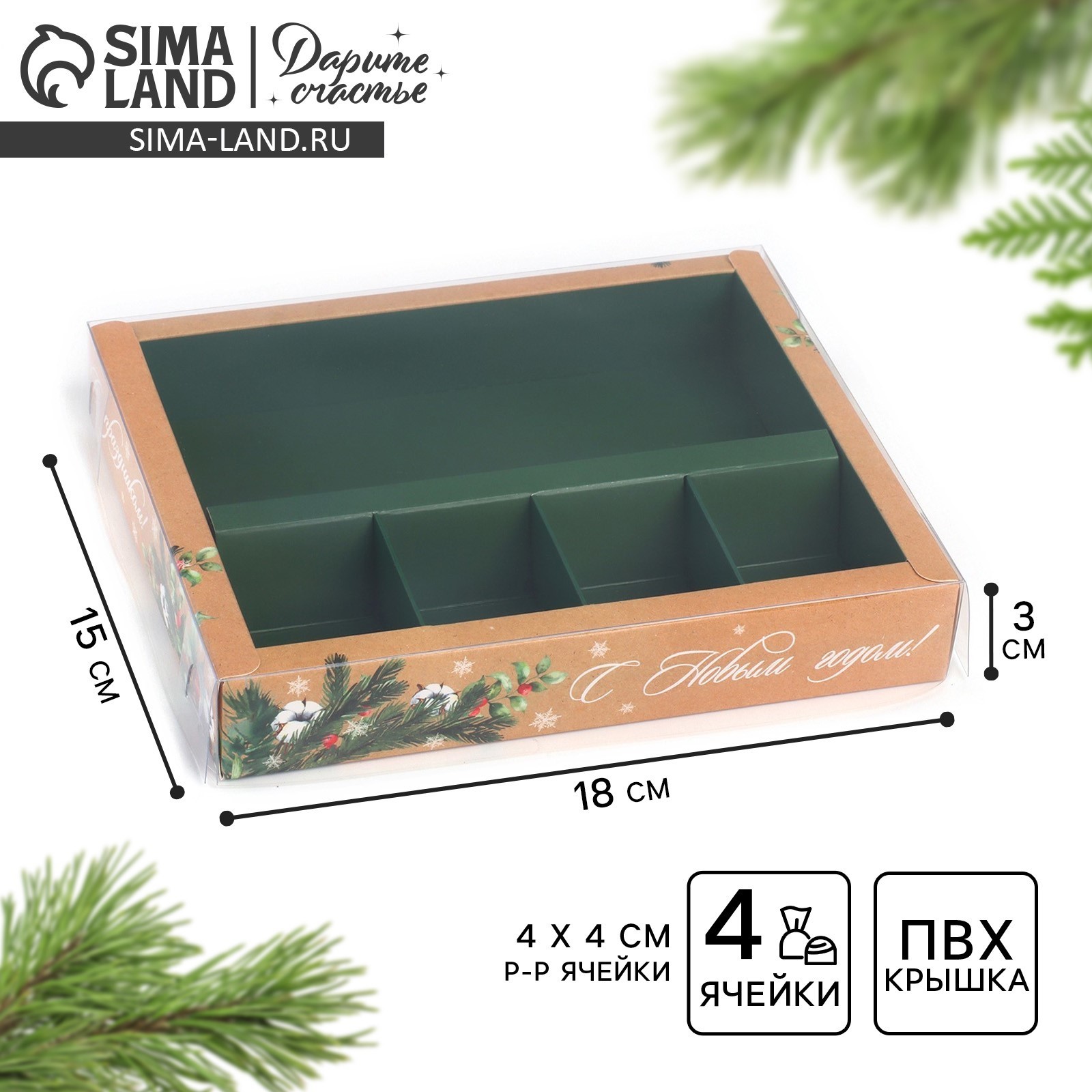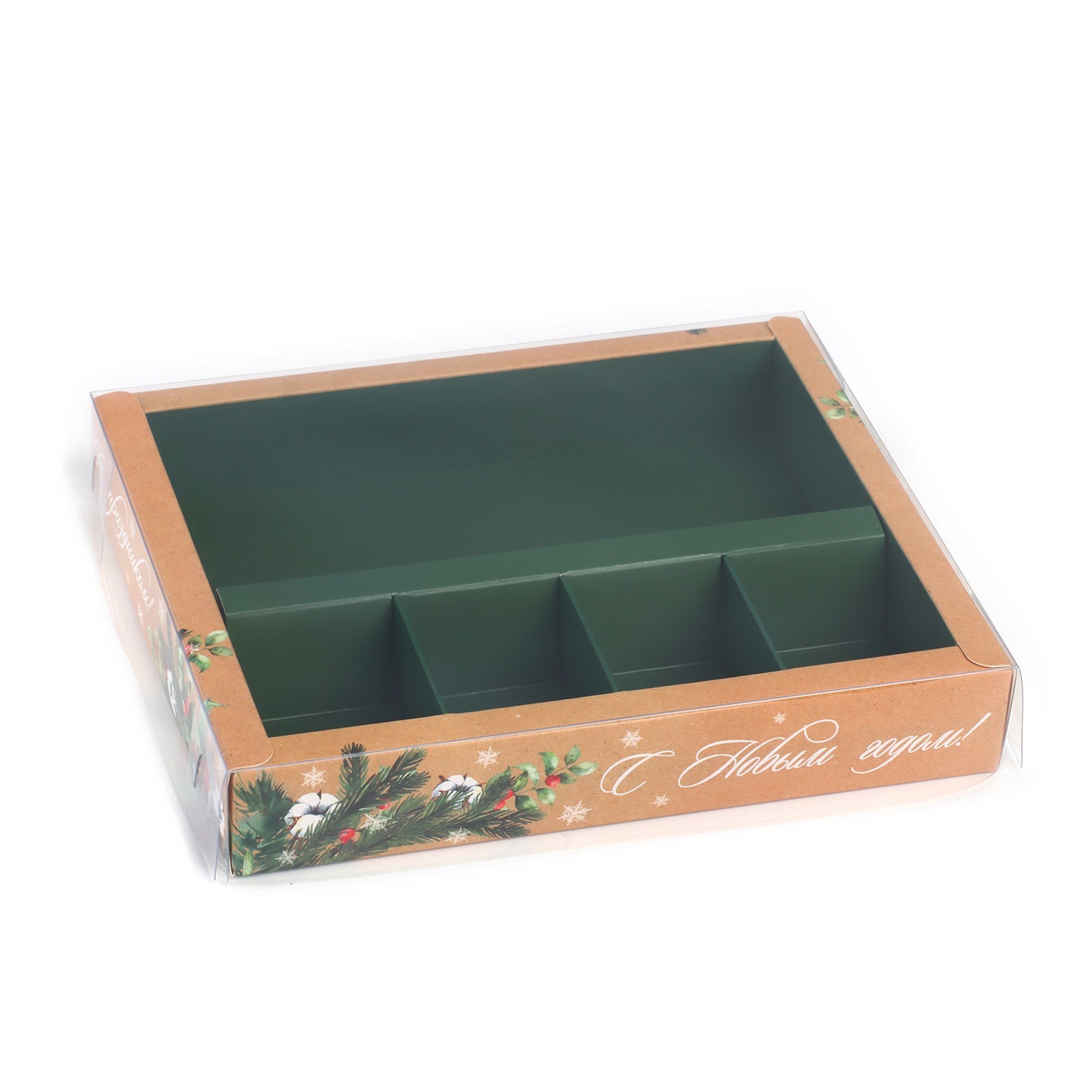 Коробка под 4 конфеты и шоколад с ячейками «с новым годом!» 18 х 15 х 3 см. Цвет:Зелёный|Форма:Прямоугольная|Плотность, г/м :250|Длина, см:18.8|Ширина, см:15.7|Высота, см:3|Количество ячеек:4|Тематика:Новогодняя|Символ года:Нет|Тематика праздника:Новый год|Материал:Картон|Вид:Складные коробки|Размер:Средний (18-24 см)|Страна:Китай  развернуть описание ▼
