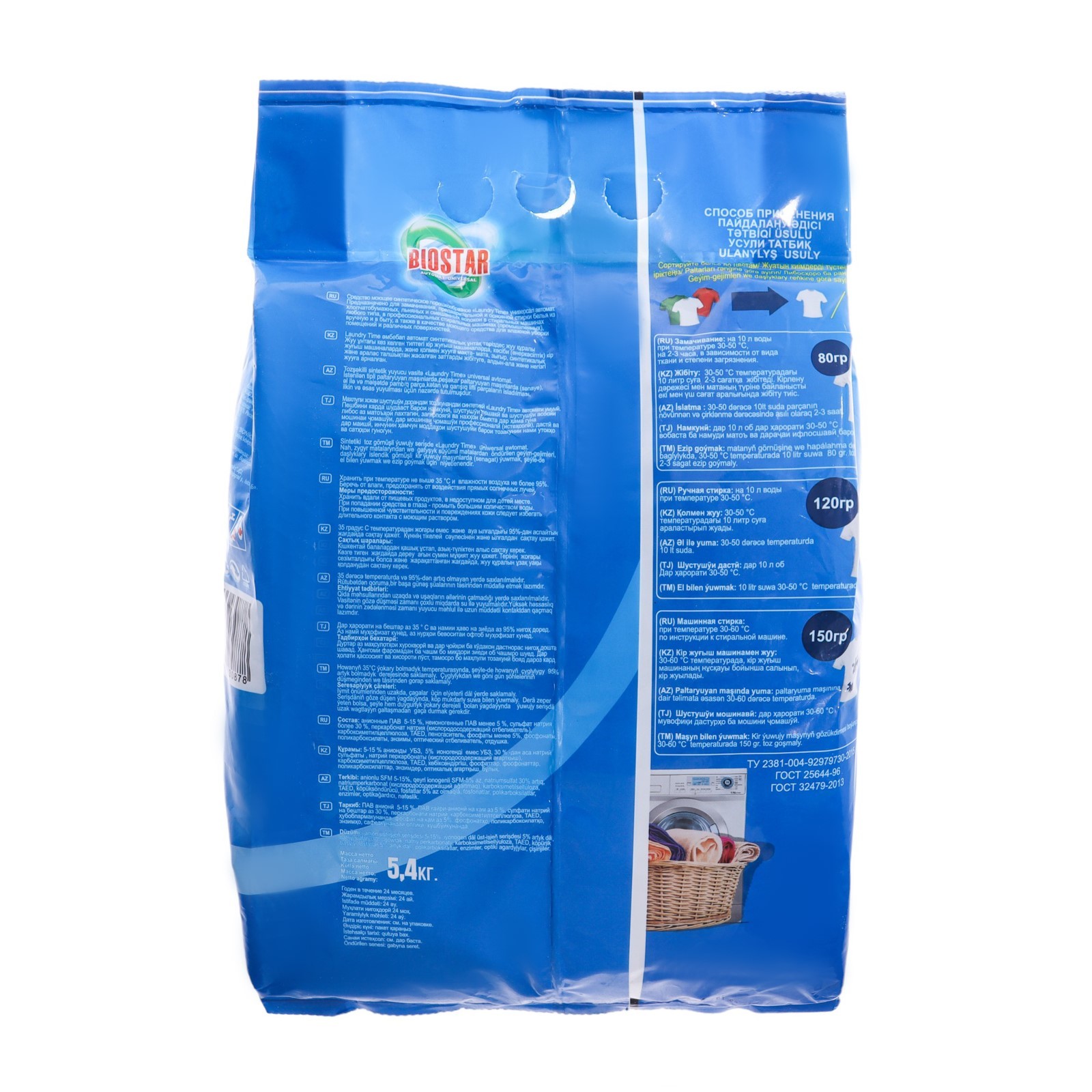 Стиральный порошок "biostar" автомат, 5,4 кг. Стиральный порошок BIOSTAR универсал автомат – активное порошкообразное синтетическое моющее средство. Предназначено для замачивания и стирки изделий из хлопчатобумажных, льняных, искусственных и смешанных волокон в стиральных машинах любого типа и ручной стирки. Формула порошка позволяет не только удалять самые трудновыводимые и застарелые пятна, но и отстирать въевшуюся грязь. Вес, кг: 5.4 Назначение: Для всех видов тканей Вид стирки: Для всех видов стирки Температурное ограничение: Нет  развернуть описание ▼
