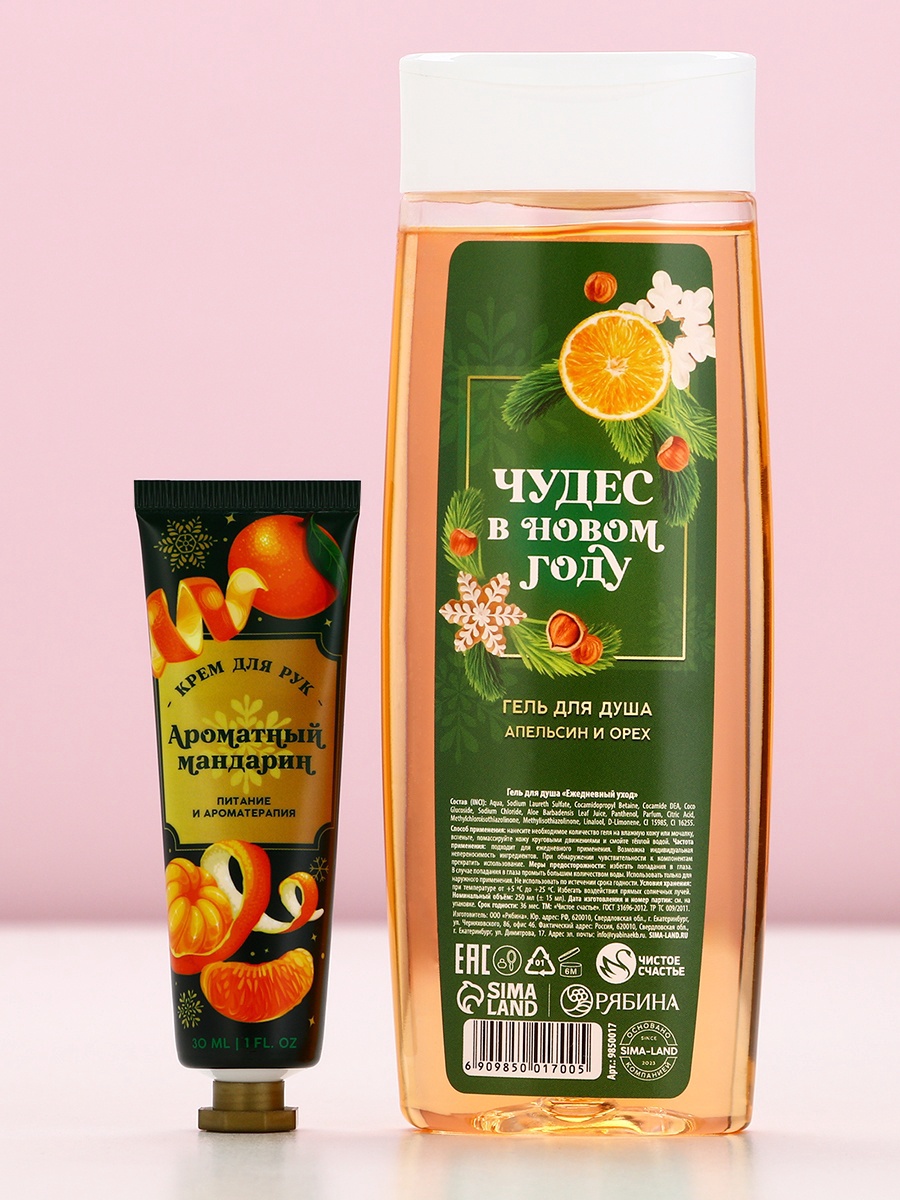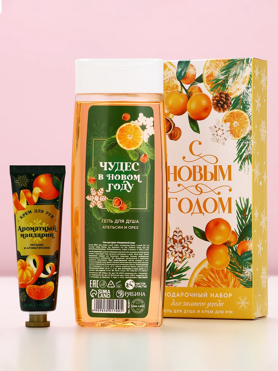 Подарочный набор женский «с новым годом», гель для душа 250 мл и крем для рук 30 мл, чистое счастье. Набор:Да|Цвет:Оранжевый|Для кого:Для женщины|В наборе, шт.:2|Объём, мл:30|Объём, мл:250|Тематика:Новогодняя|Вид упаковки:Подарочная коробка|Символ года:Нет|Тематика праздника:Новый год|Адресат:Без адресата|Возраст:Взрослый|Аромат:Орех|Аромат:Апельсин|Аромат:Мандарин|Составляющие набора:Крем для рук|Составляющие набора:Гель для душа|Темпер. ограничение НЕ НИЖЕ :+5|Темпер. ограничение НЕ ВЫШЕ :+25|Возраст:Для взрослых|Назначение:Очищение, детокс|Назначение:Увлажнение|Форма выпуска:Флакон без дозатора|Страна:Россия  развернуть описание ▼