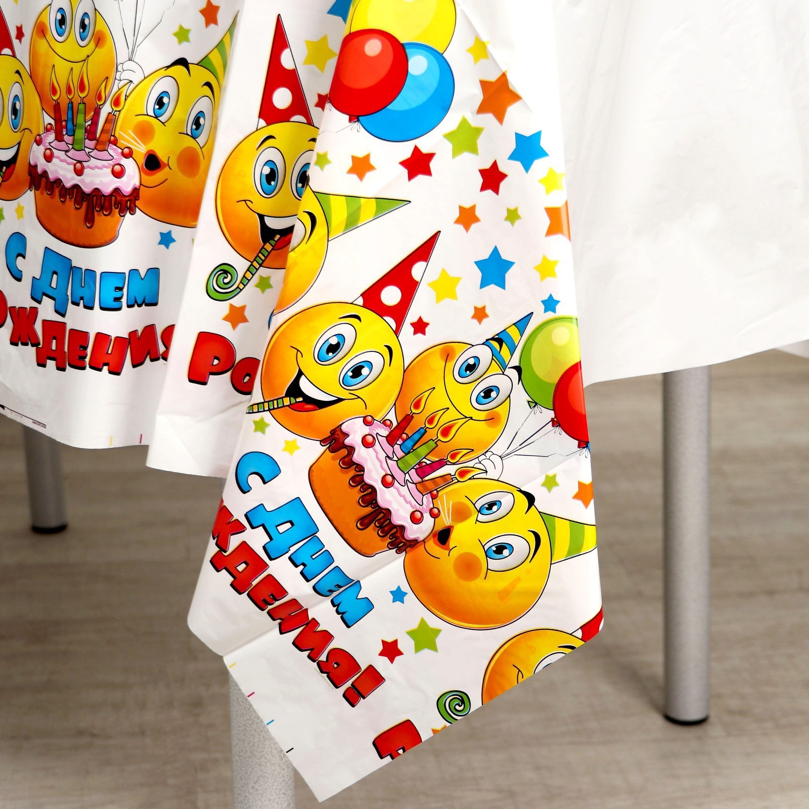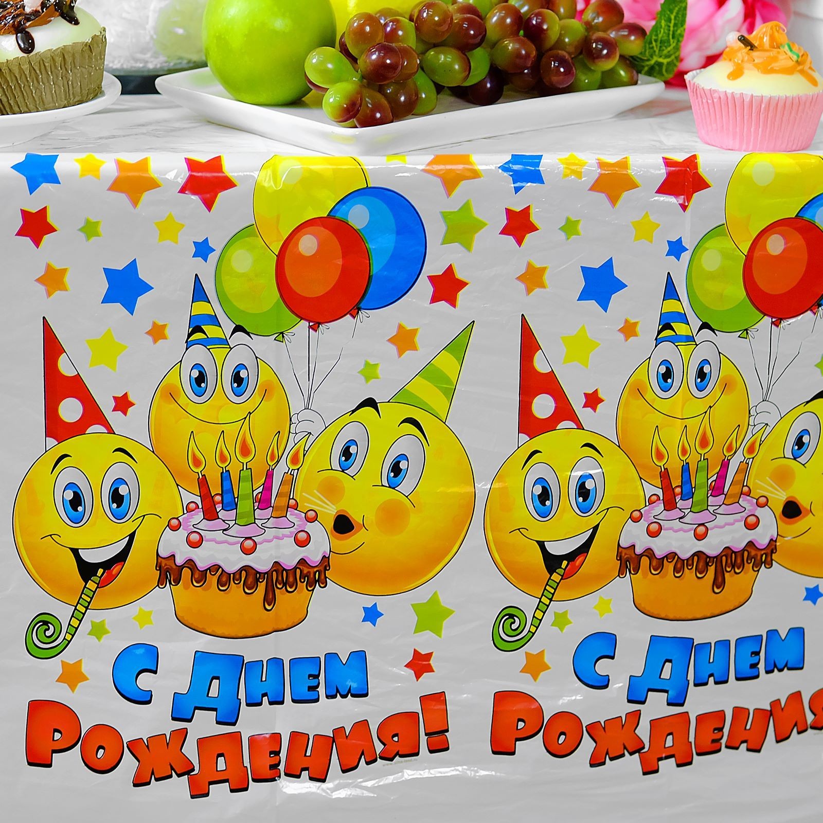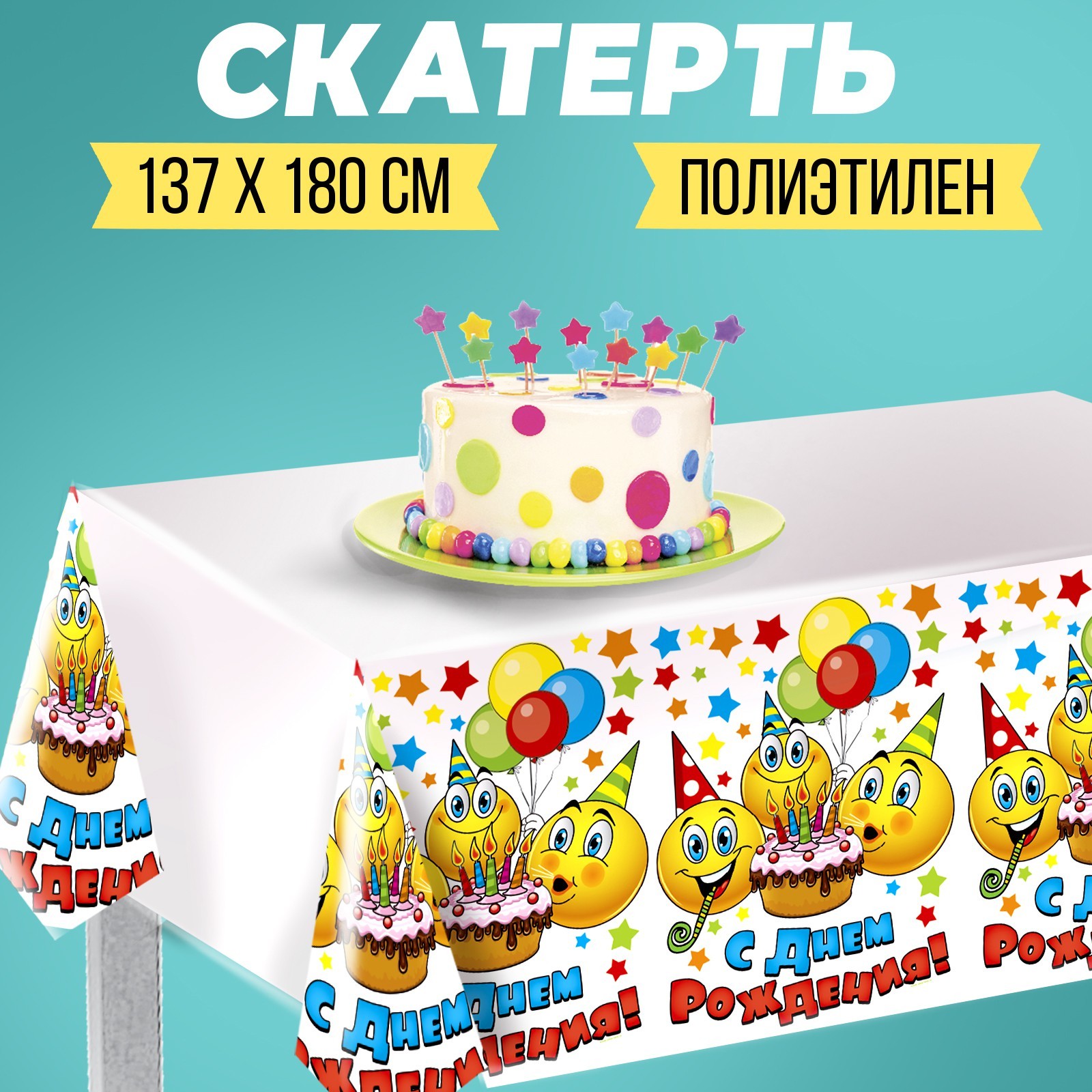 Скатерть одноразовая «с днём рождения», смайлы и тортик, 180х137 см