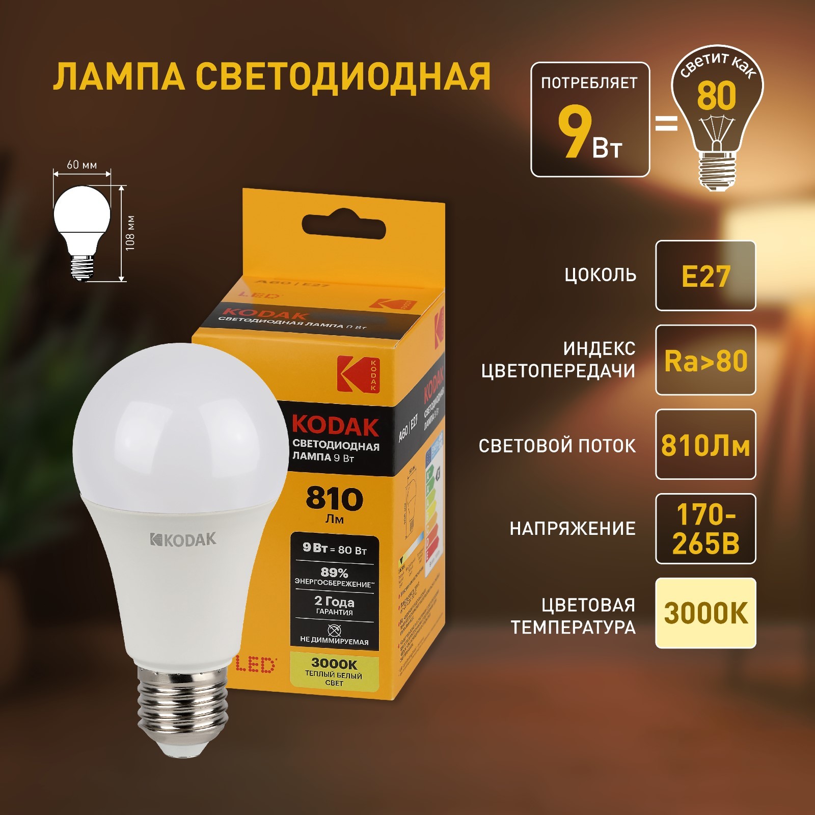 Лампа светодиодная Kodak «груша», 9 вт, E27, 810 лм, 3000к, свечение тёплое белое