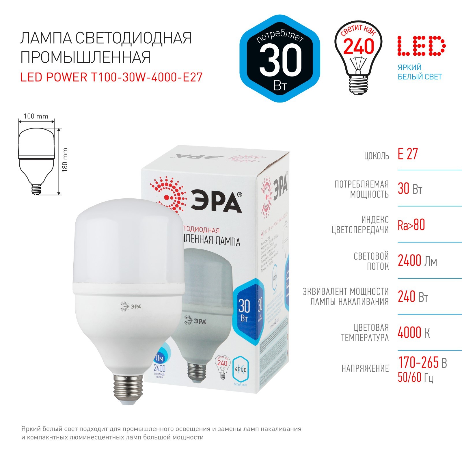Лампа светодиодная эра Power Power, 30 вт, е27, 2400 лм, 4000к, свечение белое