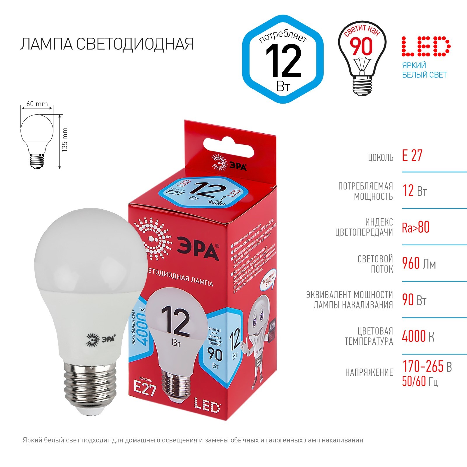 Лампа светодиодная эра Red Line «груша», 12 вт, е27, 960 лм, 4000к, свечение белое