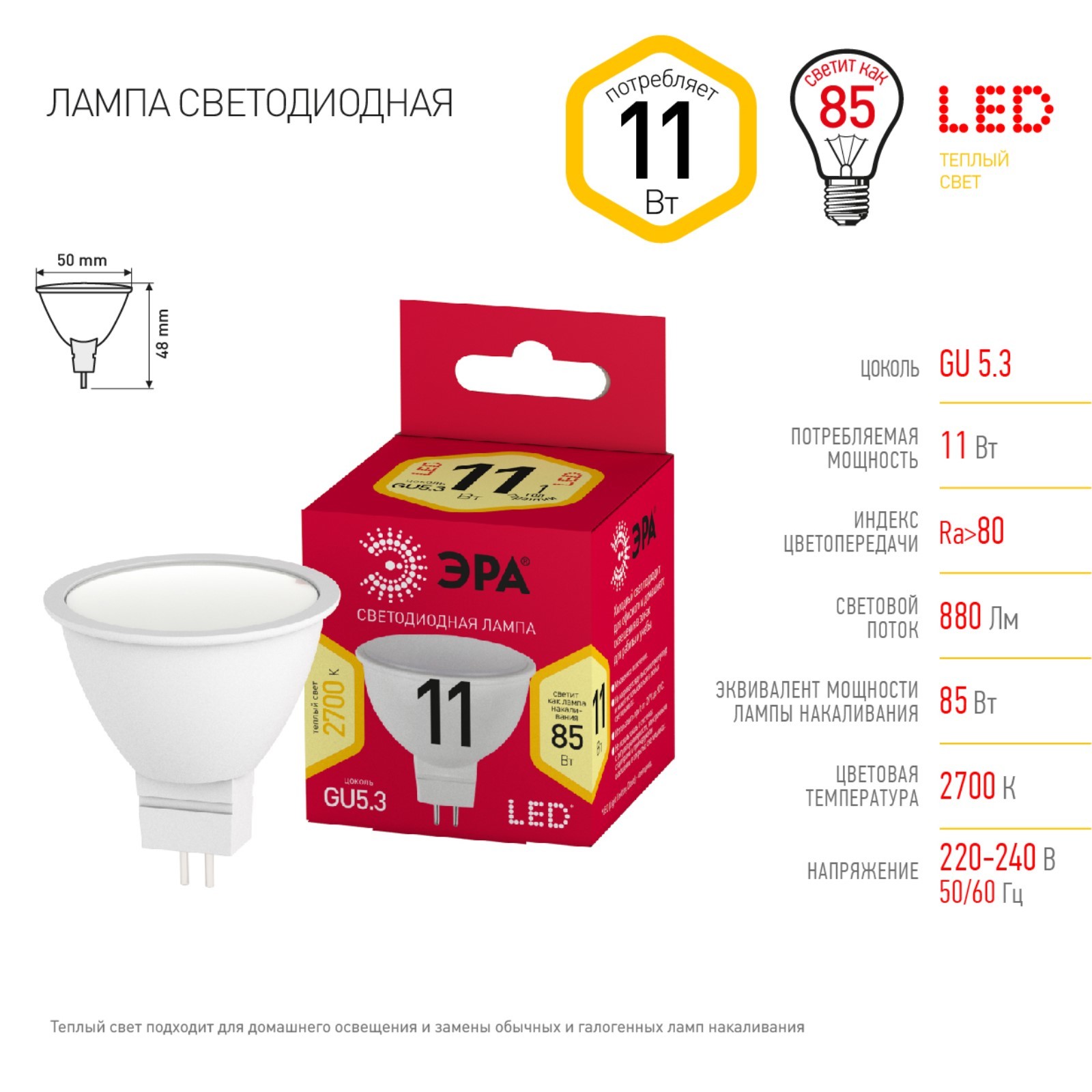 Лампа светодиодная эра Red Line «софит», 11 вт, Gu5.3, 880 лм, 2700к, свечение тёплое белое