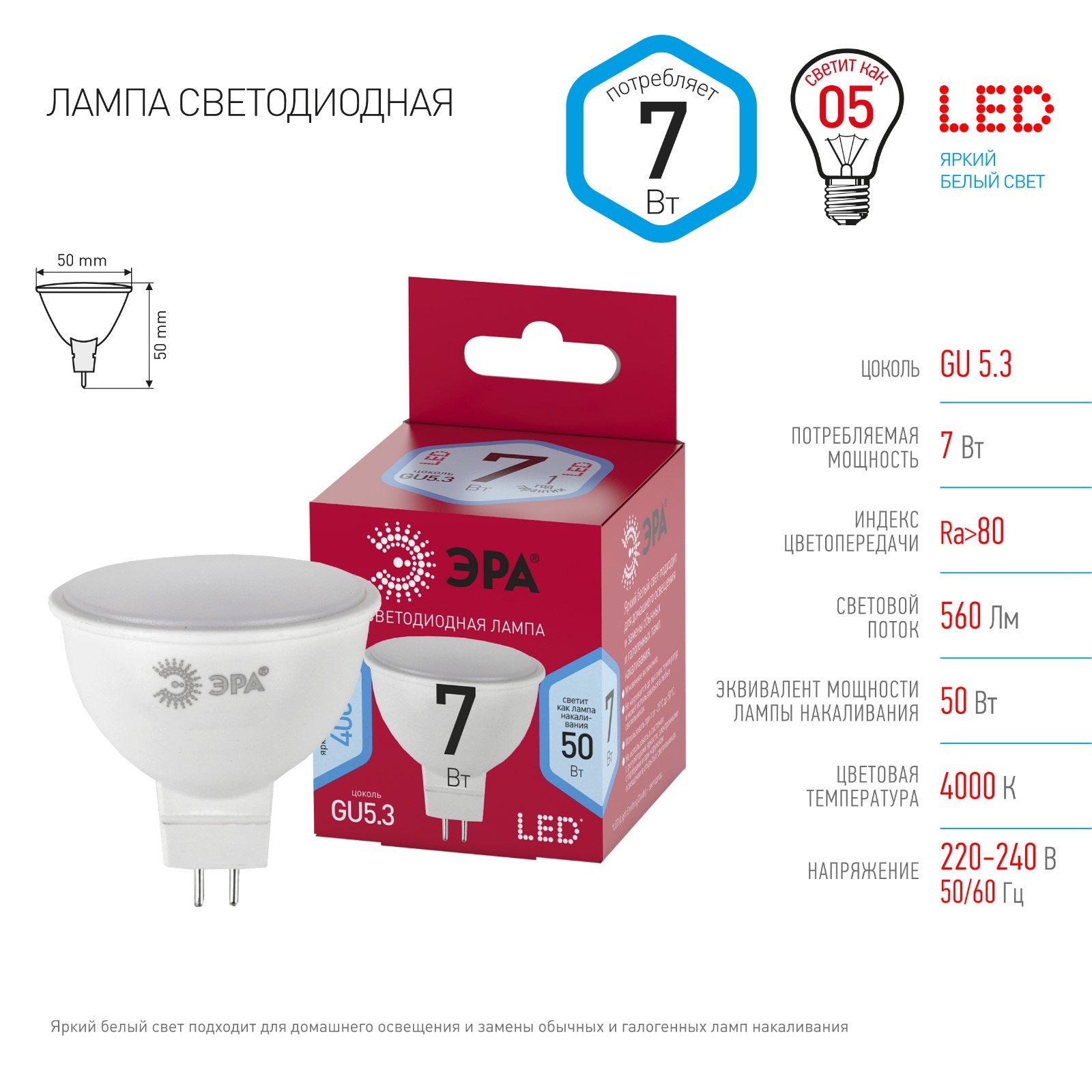 Лампа светодиодная эра red line «софит», 7 вт, gu5.3, 560 лм, 4000к, свечение белое. Бытовая LED-лампа ЭРА из бюджетной серии обеспечивает яркое и равномерное освещение, позволяя сэкономить до 90% электроэнергии по сравнению с традиционными лампами накаливания при одинаковой светоотдаче. Излучает теплый свет с желтоватым отливом, создавая эффективную атмосферу для отдыха и уюта в помещении. Подходит для использования в потолочных, настенных и настольных светильниках, а также в люстрах и бра. Включается без задержек и не выделяет избыточного тепла. Цвет свечения: Белый Вид лампы: Светодиодная Цоколь: GU5.3 (G5.3) Диаметр, мм: 50 Мощность, Вт: 7 Напряжение, В: 220 Напряжение, В: 240 Световой поток, лм: 560 Материал основания: Металл Цветовая температура: 4000К Форма лампы: Софитная Индекс цветопередачи: RA > 80 Диммируемая: Нет Тип источника освещения: Лампа не в комплекте  развернуть описание ▼