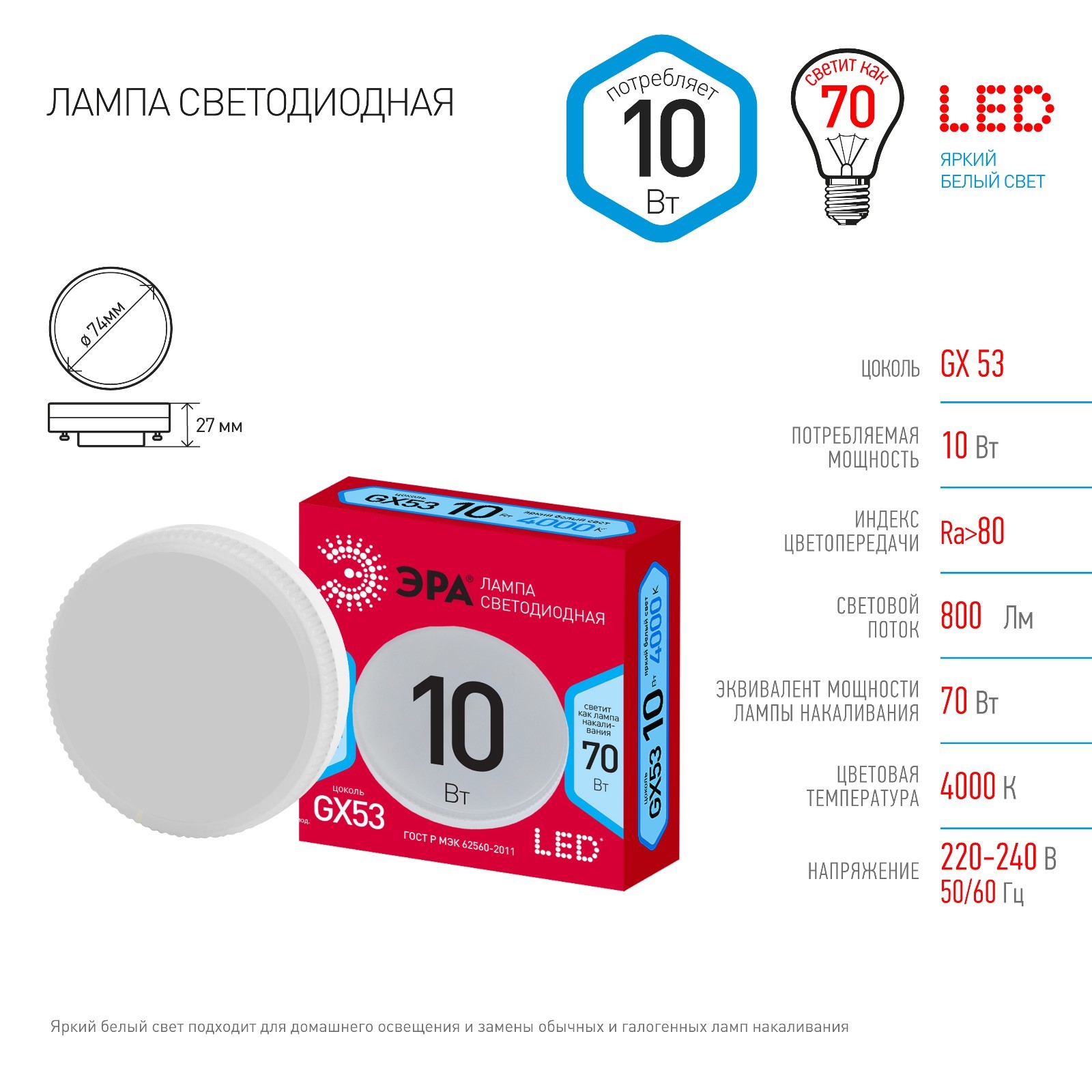 Лампа светодиодная эра red line «таблетка», 10 вт, gx53, 800 лм, 4000к, свечение белое. Эта LED лампа от ЭРА из бюджетной серии - это современный, высококачественный и доступный источник освещения. Она позволяет сэкономить до 90% электроэнергии по сравнению с традиционными лампами накаливания при том же уровне светового потока. Излучает теплый белый свет, максимально приближенный к естественному дневному свету. Подходит для повседневного использования в домашних условиях. Включается мгновенно, обеспечивает равномерное освещение. Подходит для использования в различных осветительных приборах, включая люстры, светильники, настольные лампы и бра. Цвет свечения: Белый Вид лампы: Светодиодная Цоколь: GX53 Диаметр, мм: 75 Мощность, Вт: 10 Напряжение, В: 220 Напряжение, В: 240 Световой поток, лм: 800 Материал основания: Металл Цветовая температура: 4000К Форма лампы: Таблетка Индекс цветопередачи: RA > 80 Диммируемая: Нет Тип источника освещения: Лампа не в комплекте  развернуть описание ▼