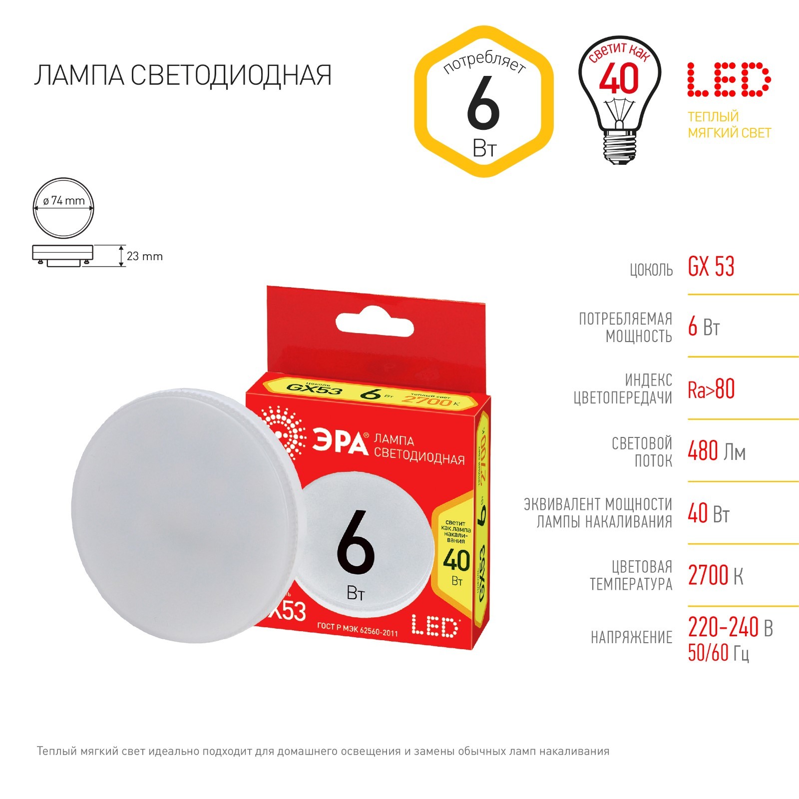 Лампа светодиодная эра Red Line «таблетка», 6 вт, Gx53, 480 лм, 2700к, свечение тёплое белое