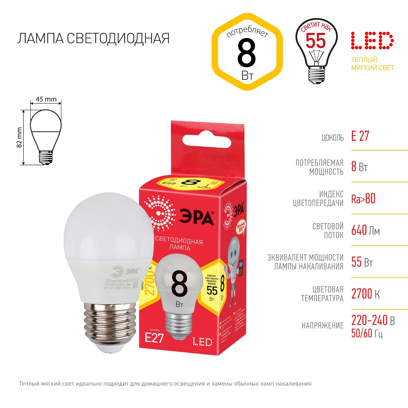 Лампа светодиодная эра Red Line «шар», 8 вт, е27, 640 лм, 2700к, свечение тёплое белое