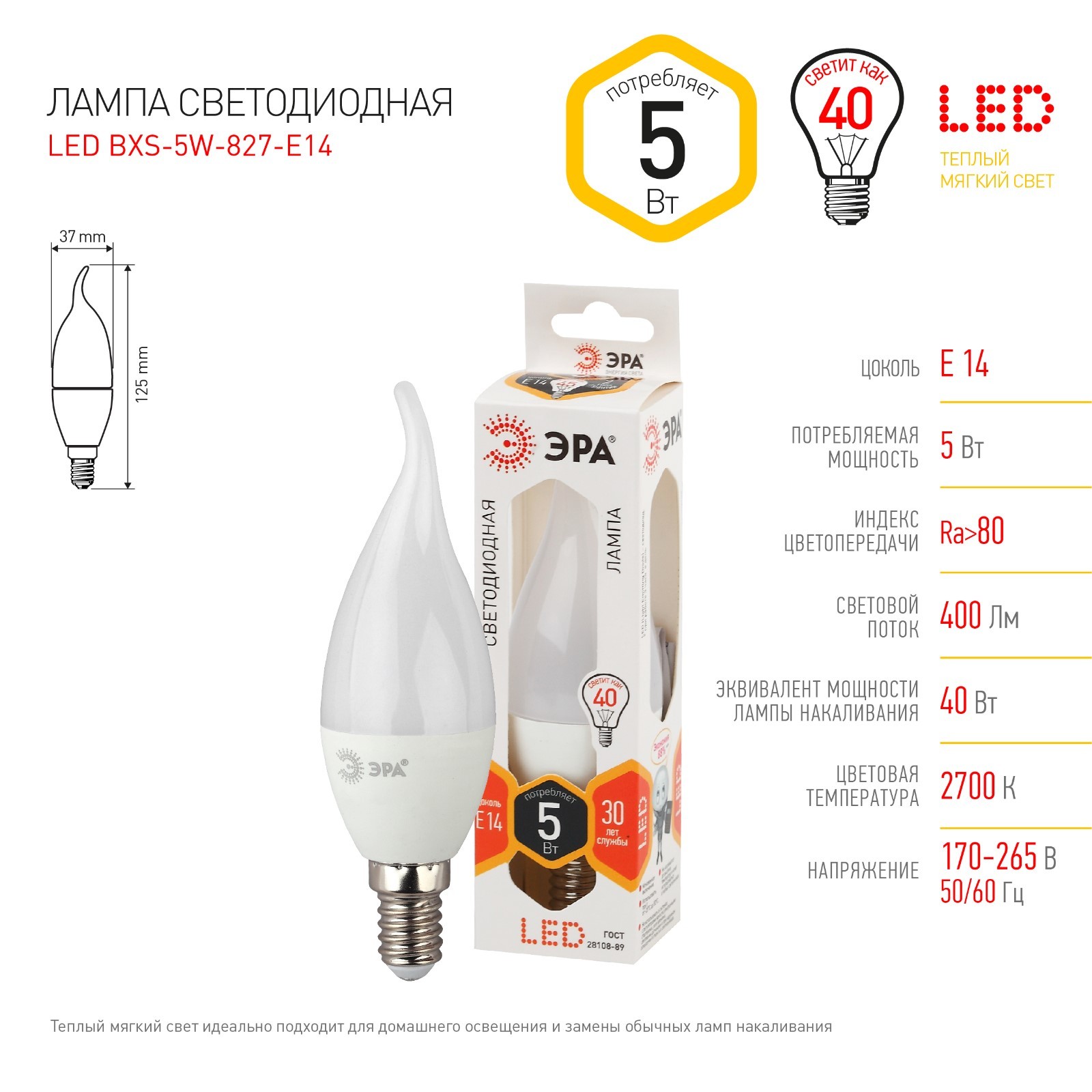 Лампа светодиодная эра Standard «свеча на ветру», 5 вт, е14, 400 лм, 2700к, свечение тёплое белое