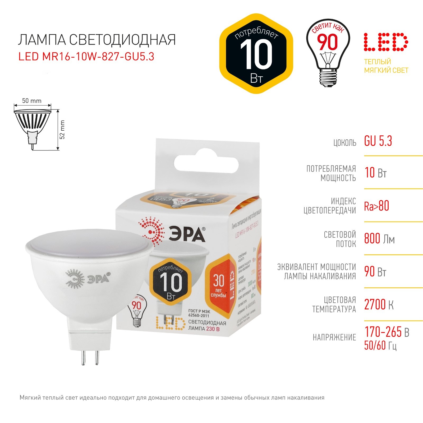 Лампа светодиодная эра Standard «софит», 10 вт, Gu5.3, 800 лм, 2700к, свечение тёплое белое