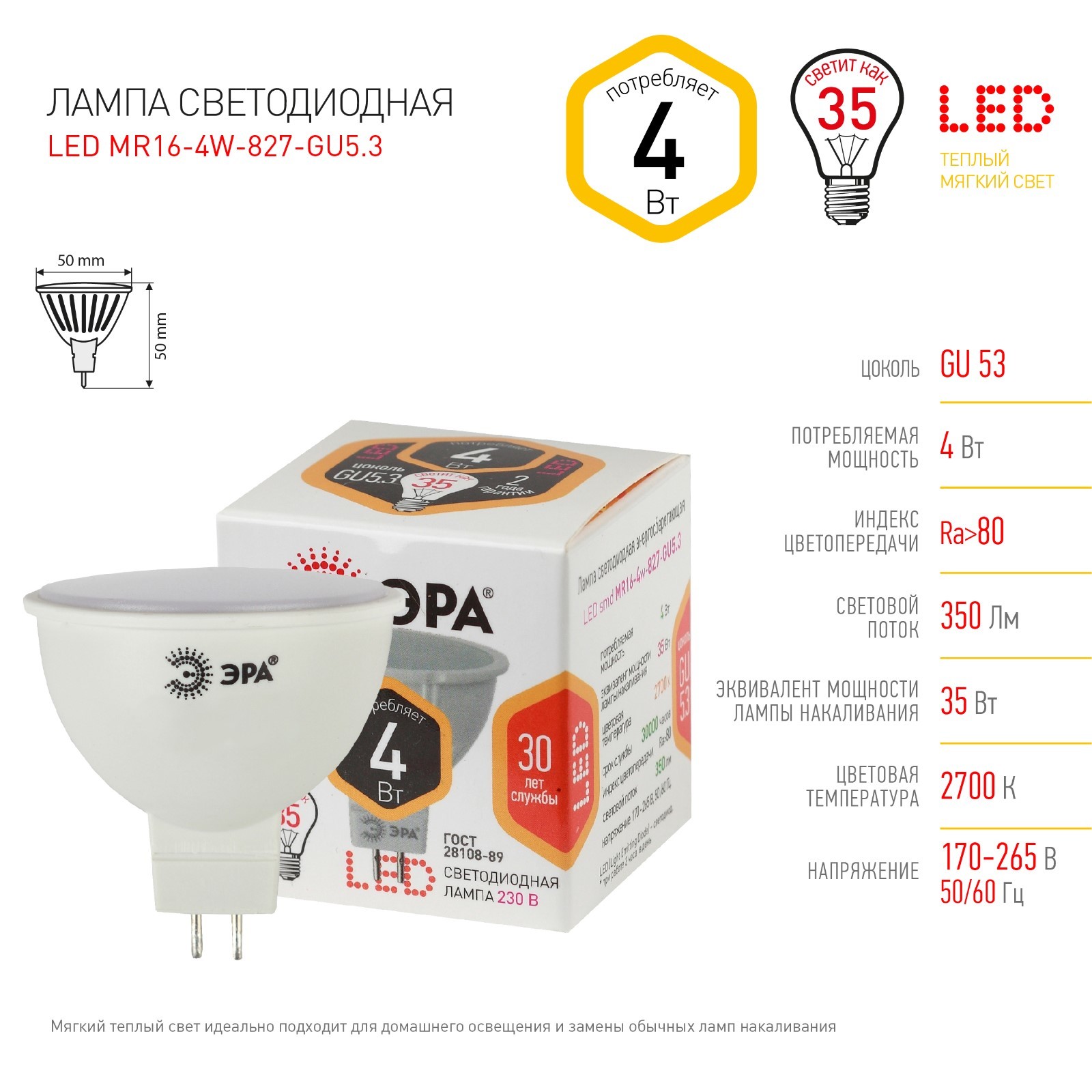 Лампа светодиодная эра Standard «софит», 4 вт, Gu5.3, 320 лм, 2700к, свечение тёплое белое