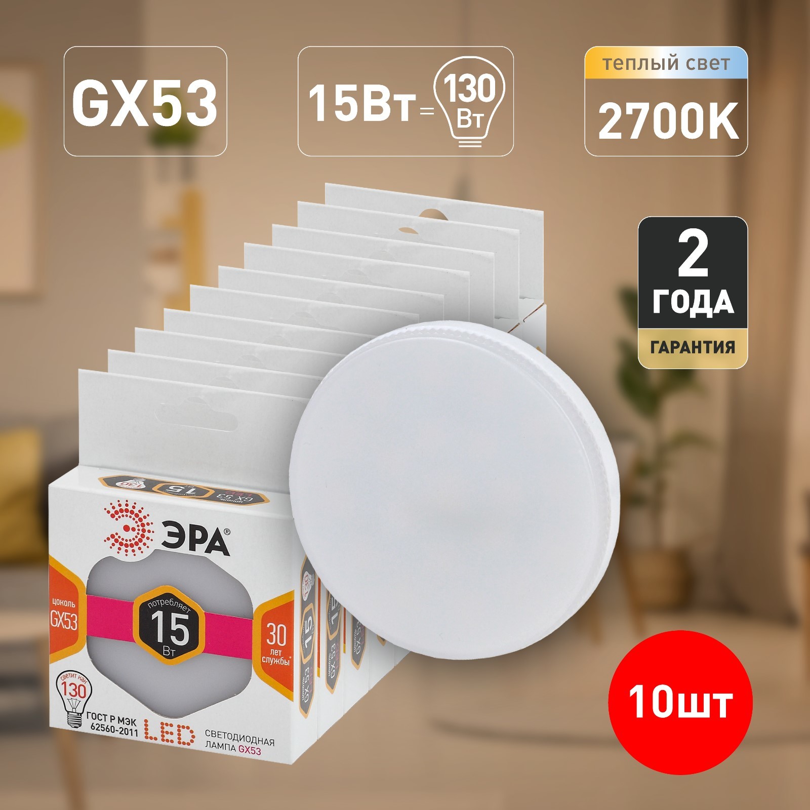 Лампа светодиодная эра Standard «таблетка», 15 вт, Gx53, 1200 лм, 2700к, свечение тёплое белое