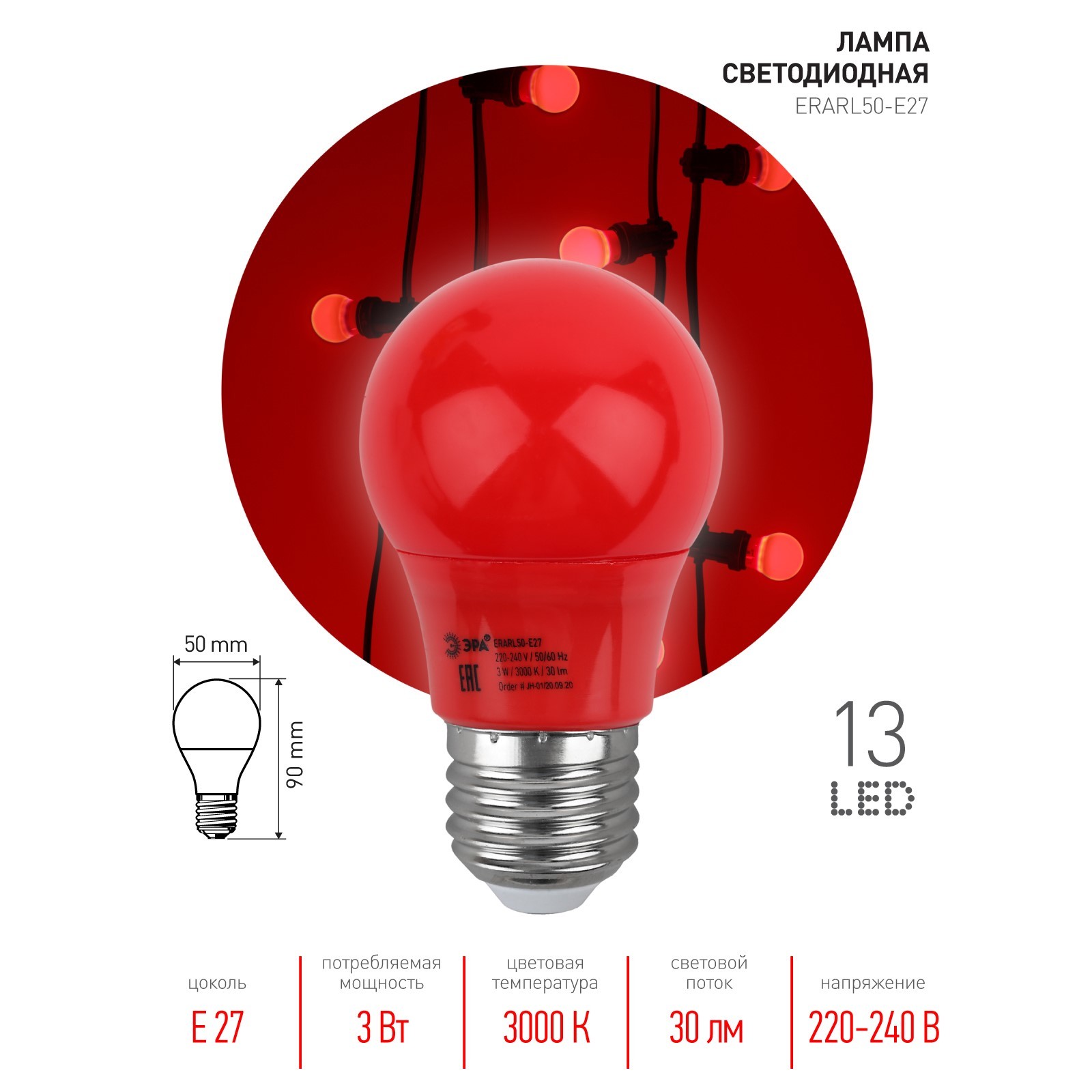 Лампа светодиодная эра белт «груша», 3 вт, е27, 30 лм, 3000к, свечение тёплое белое. Декоративная LED-лампа «Белт-лайт» ЭРА с цоколем Е27 и колбой в форме груши (А50) зеленого цвета и мощностью 3 Вт идеально подходит для уличных гирлянд-конструкторов. Она предоставляет возможность создания уникального праздничного освещения, а гирлянда-конструктор ЭРА «Белт-лайт» дает свободу в выборе длины освещения, цвета ламп и расстояния между ними. Лампы «Белт-лайт» доступны в различных цветах, включая прозрачные и матовые белые. Они изготовлены из легкого ударопрочного пластика, что делает их удобными для транспортировки, использования и хранения. Цоколь изготовлен из алюминия. Эти лампы универсальны и могут использоваться с любыми светотехническими устройствами, оснащенными патроном Е27. Они идеально подходят для декорирования фасадов зданий, оформления витрин и создания атмосферного освещения на открытом воздухе, помогая реализовывать смелые дизайнерские решения. Цвет свечения: Тёплый белый Вид лампы: Энергосберегающая Вид лампы: Накаливания Вид лампы: Светодиодная Цоколь: E27 Диаметр, мм: 50 Мощность, Вт: 3 Световой поток, лм: 30 Напряжение, В: 220 Напряжение, В: 240 Материал основания: Алюминий Материал основания: Пластик Цветовая температура: 3000К Форма лампы: Груша Индекс цветопередачи: RA > 80 Диммируемая: Нет Тип источника освещения: Лампа не в комплекте  развернуть описание ▼