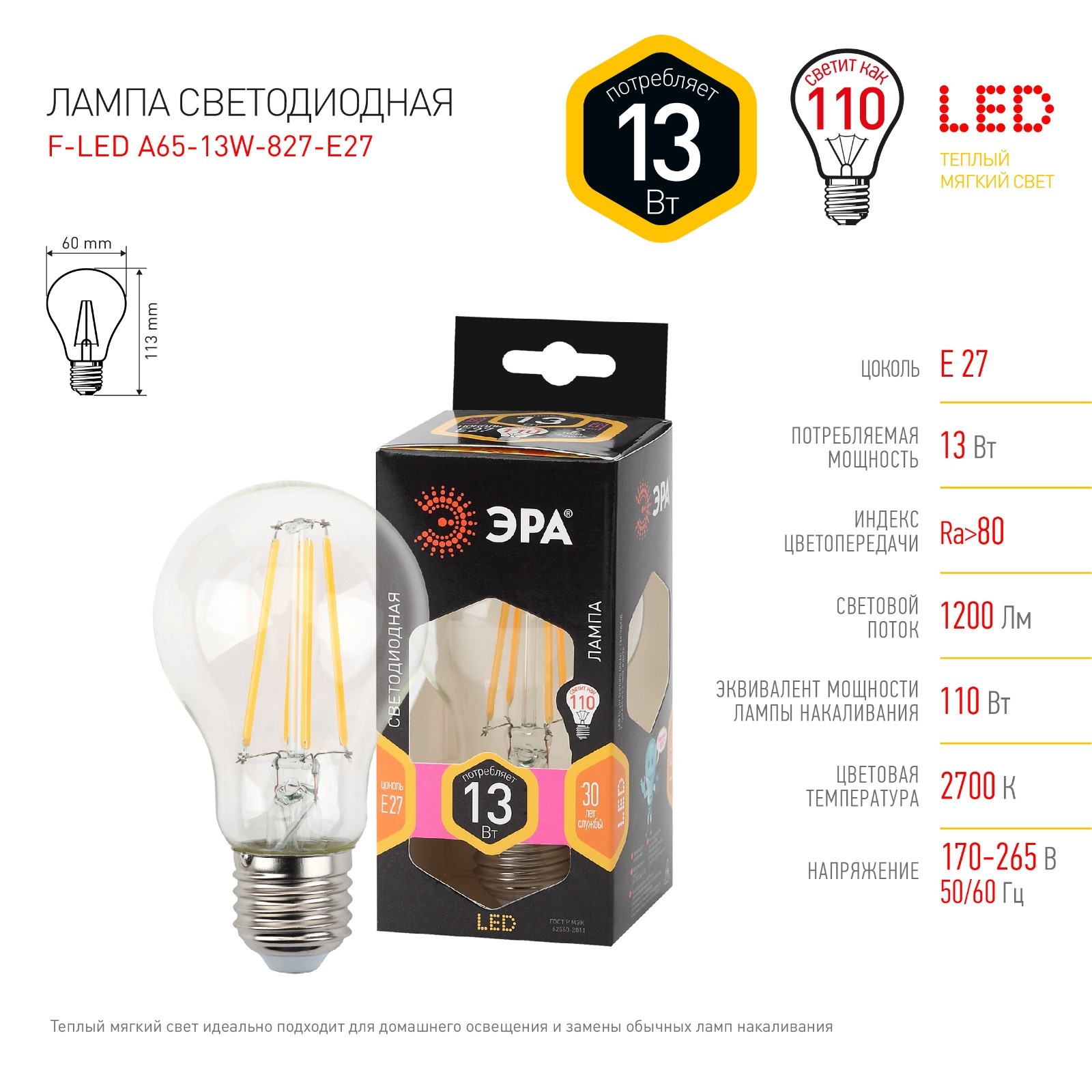 Лампа филаментная эра «груша», 13 вт, е27, 1690 лм, 2700к, свечение тёплое белое