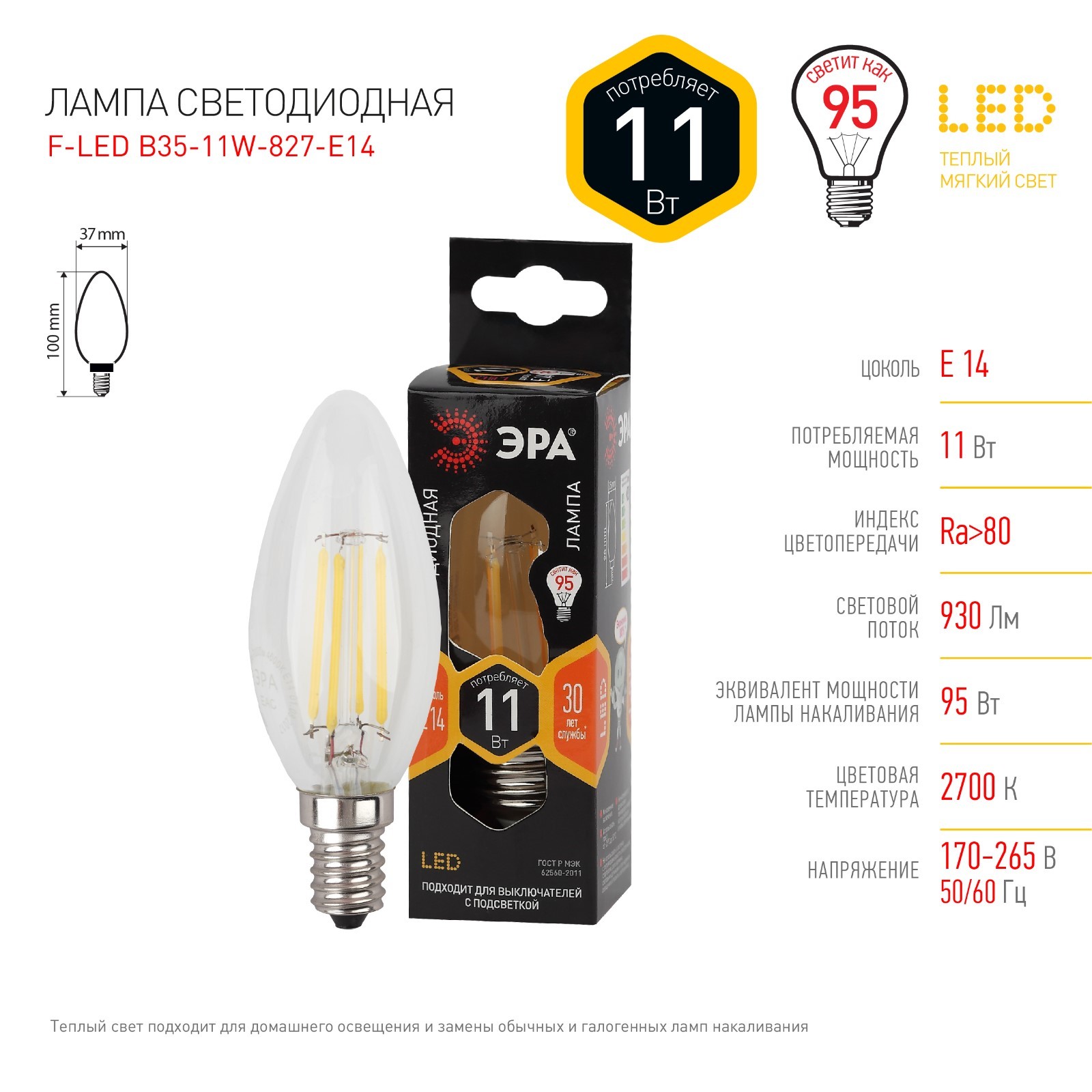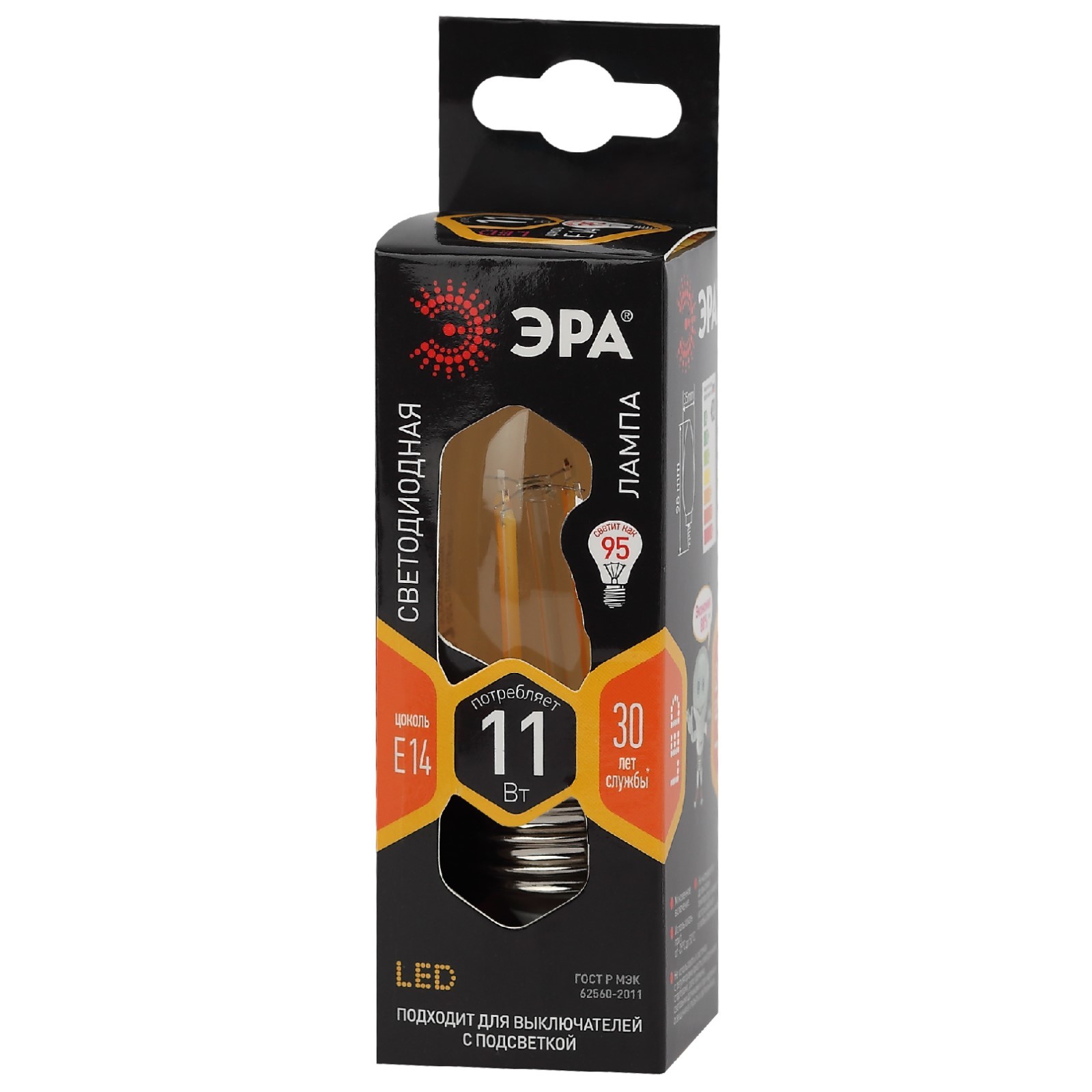 Лампа филаментная эра «свеча», 11 вт, е14, 1430 лм, 2700к, свечение тёплое белое