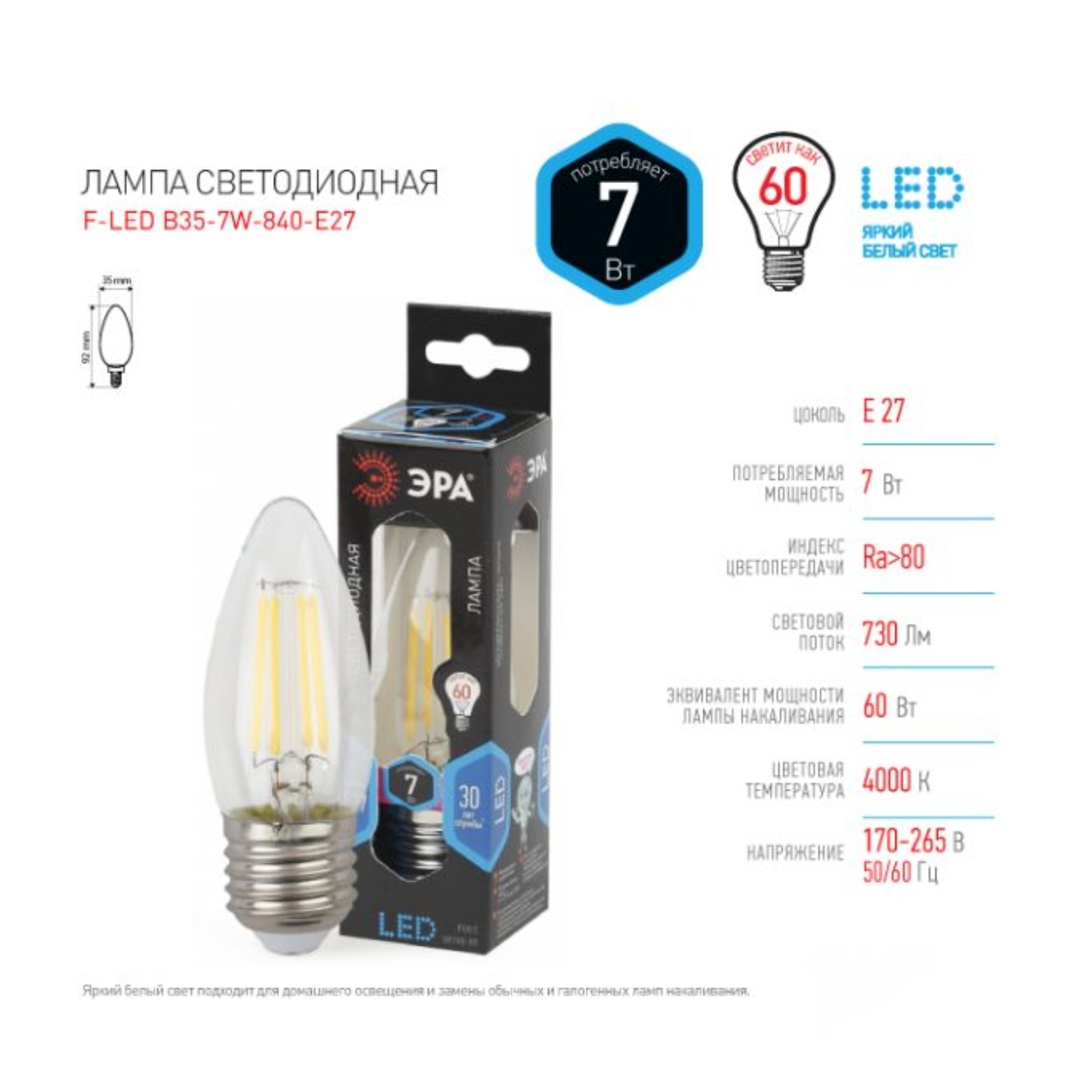 Лампа филаментная эра «свеча», 7 вт, е27, 910 лм, 4000к, свечение белое