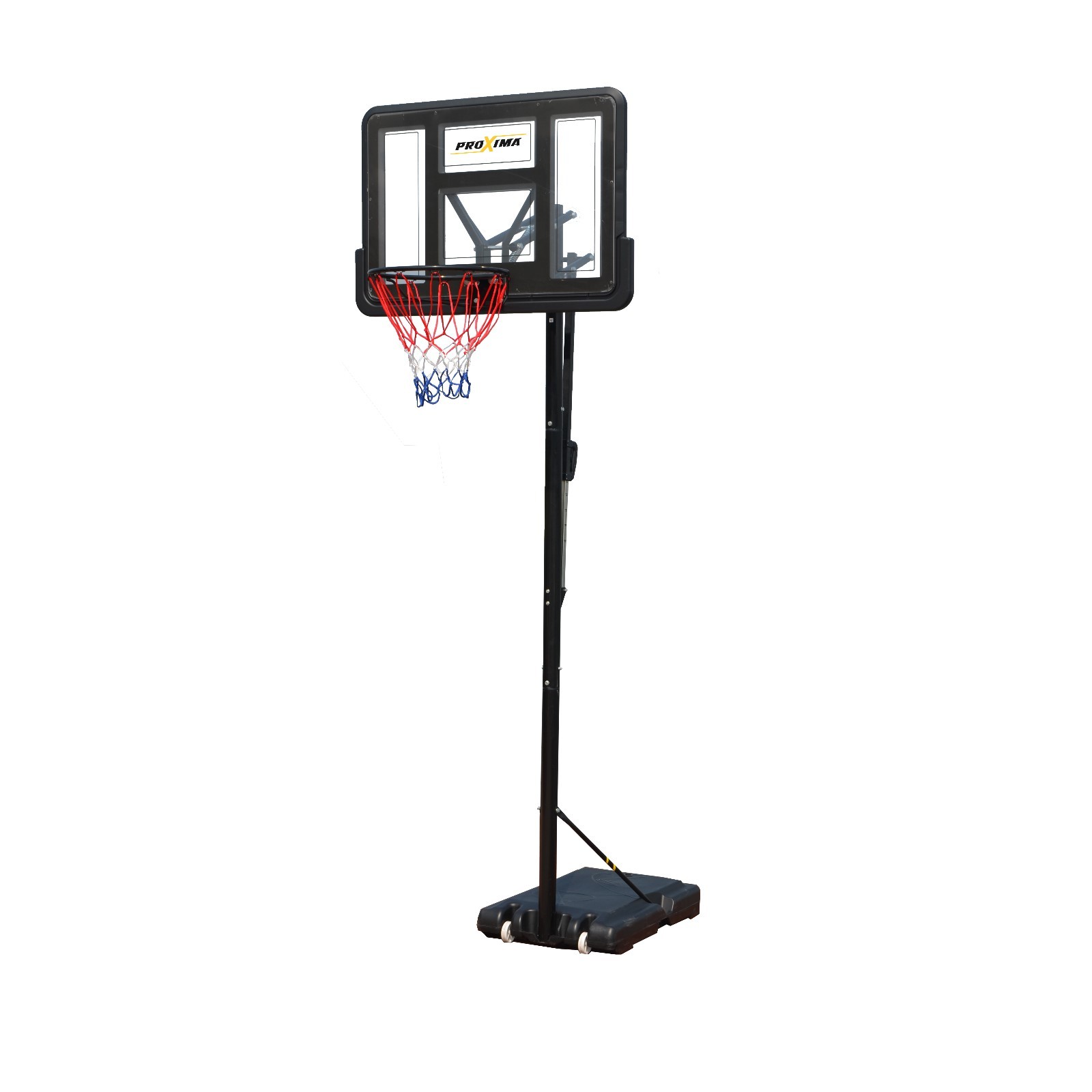 Мобильная баскетбольная стойка proxima 44", акрил, s003-20. Баскетбольная мобильная стойка Proxima 44", подходит для оборудования уличных спортивных площадок и для закрытых спортивных залов. Материалы, применяемые для изготовления стойки, устойчивы к различным атмосферным явлениям и обладают повышенной износоустойчивостью. Идеально-спроектированная и прочная конструкция баскетбольной стойки обеспечит её устойчивость даже при самых сильных нагрузках. Прямоугольный щит стойки выполнен из высокопрочного прозрачного поликарбоната, укреплённого рамой из прочного полиэтилена. К щиту надёжно крепится стальное кольцо диаметром 45 см. Кольцо укомплектовано сеткой, устойчивой к различным погодным явлениям. Простая система регулировки высоты щита позволяет легко изменить и надежно зафиксировать ее в пределах от 150 до 305 см. Стойка имеет в своем основании водоналивную платформу объемом до 65 литров. Для максимальной устойчивости основание баскетбольной стойки можно заполнить песком. Два колеса в передней части базы позволяют перемещать стойку одному взрослому человеку. Диаметр, мм: 450 Материал: Акрил  развернуть описание ▼