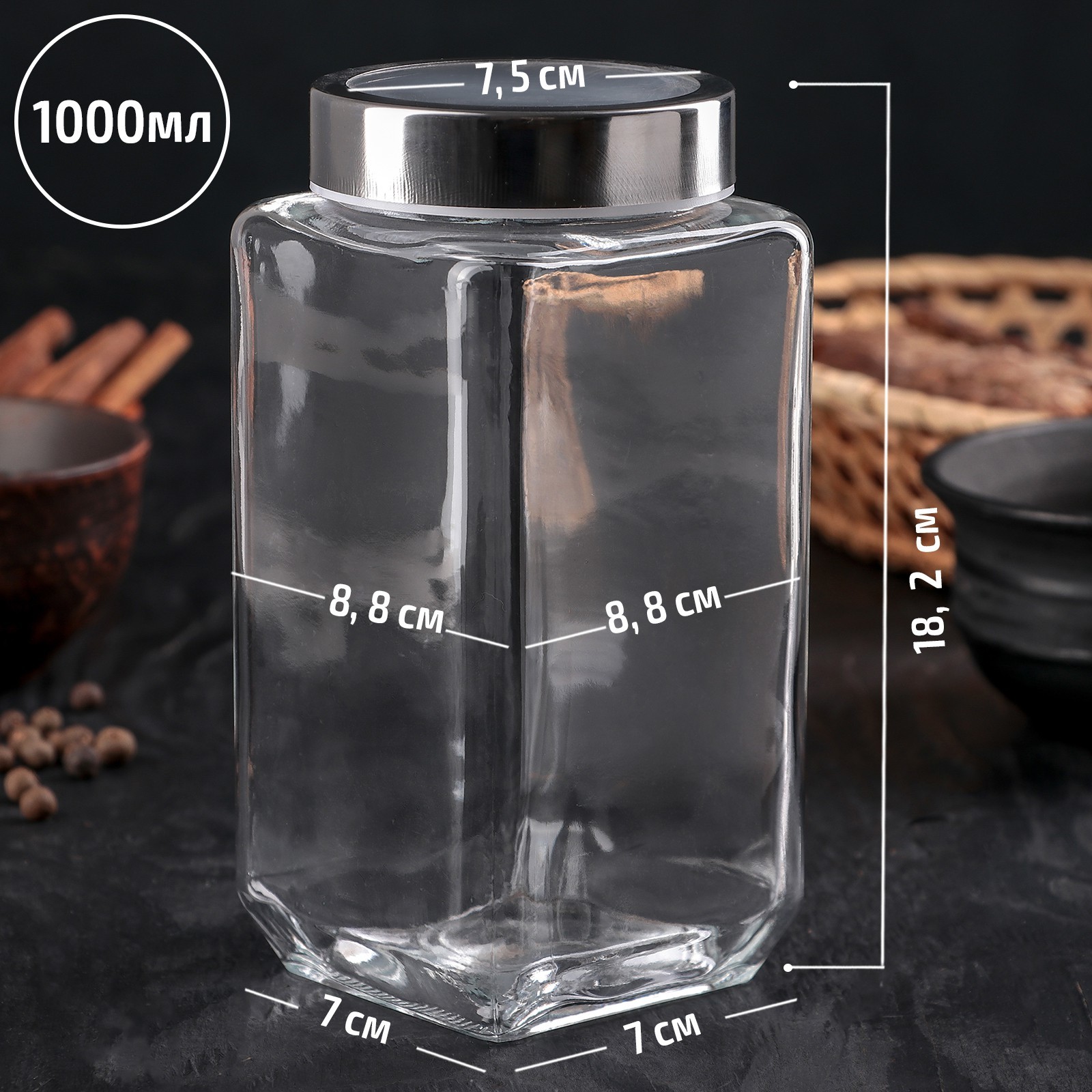 Банка стеклянная для сыпучих продуктов с металлической крышкой доляна «призма», 1 л, 9x18,5 см