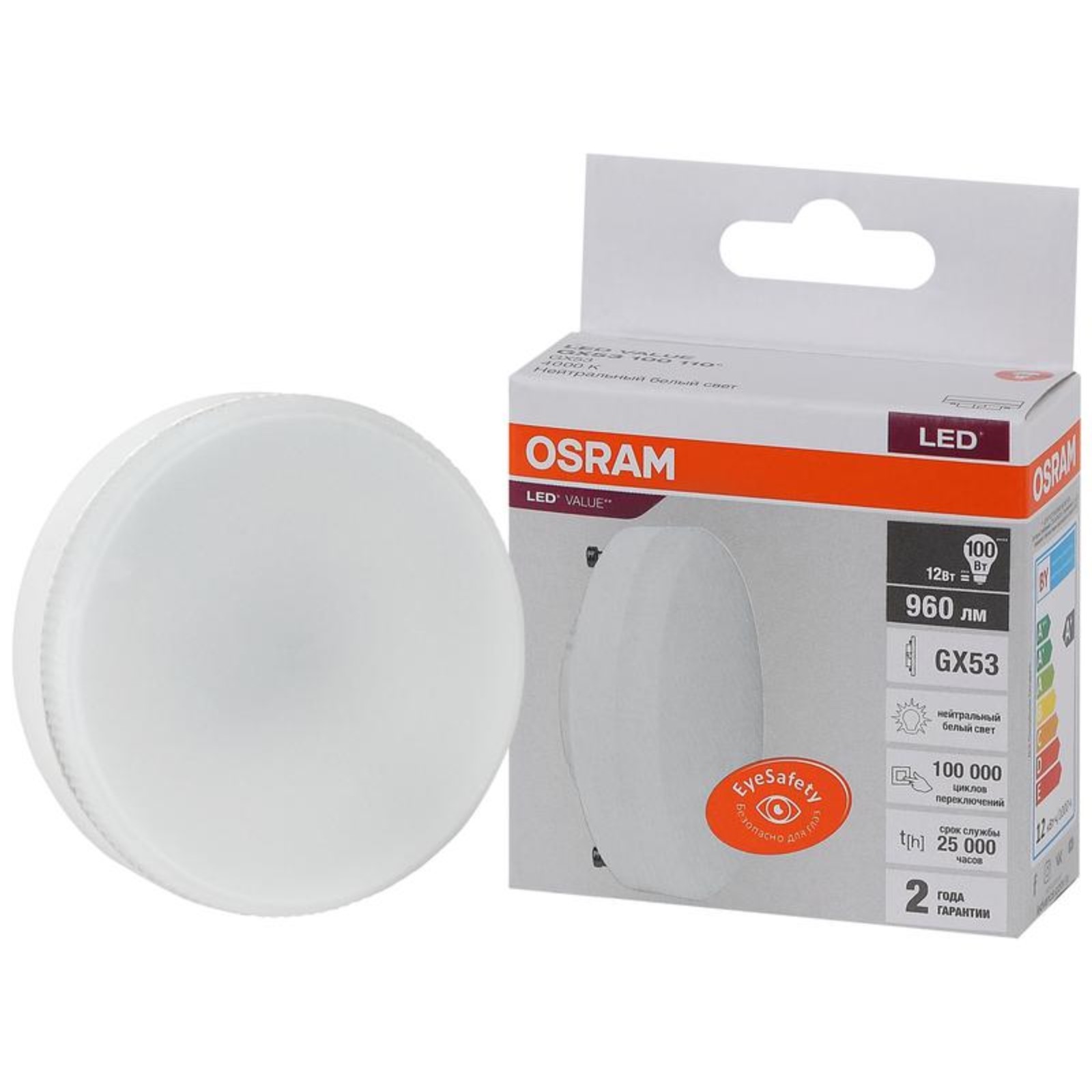 Лампа светодиодная ledvance, gx53, 12 вт, 960 лм, 4000 к, свечение белое. Светодиодные лампы OSRAM - разумная замена традиционным лампам накаливания или галогенным лампам. Светодиодные лампы OSRAM снижают затраты на освещение до 90% при сохранении привычного уровня освещенности. Эта лампа OSRAM серии LED Value выполнена в форме колбы GX с цоколем GX53. Материал колбы - пластик, исполнение - матовое. Световой поток 960 люмен, что соответствует лампе накаливания на 100 Вт. Такие лампы обычно используют для потолков; обязательно проверьте совместимость со светильником. Эта лампа излучает нейтральный белый свет, угол пучка - узкий. Качество света на высоте: низкие пульсации защищают глаза, а высокий индекс цветопередачи позволяет видеть мир в его истинном цвете. Кроме того, лампы OSRAM полностью безопасны для здоровья, поскольку в них нет опасных материалов по европейскому стандарту RoHS, а также они не производят вредных электромагнитных излучений, что подтверждено ЭМС (сертификат электромагнитной совместимости). Лампа проработает долго: срок службы - 25000 часов, 2 года гарантии. Цвет свечения: Белый Вид лампы: Светодиодная Цвет: Белый Цоколь: GX53 Длина, мм: 28 Мощность, Вт: 12 Напряжение, В: 220 Напряжение, В: 240 Световой поток, лм: 960 Степень защиты: IP20 Цветовая температура: 4000К Форма лампы: Таблетка Индекс цветопередачи: RA > 80 Диммируемая: Нет Класс энергоэффективности: A+  развернуть описание ▼