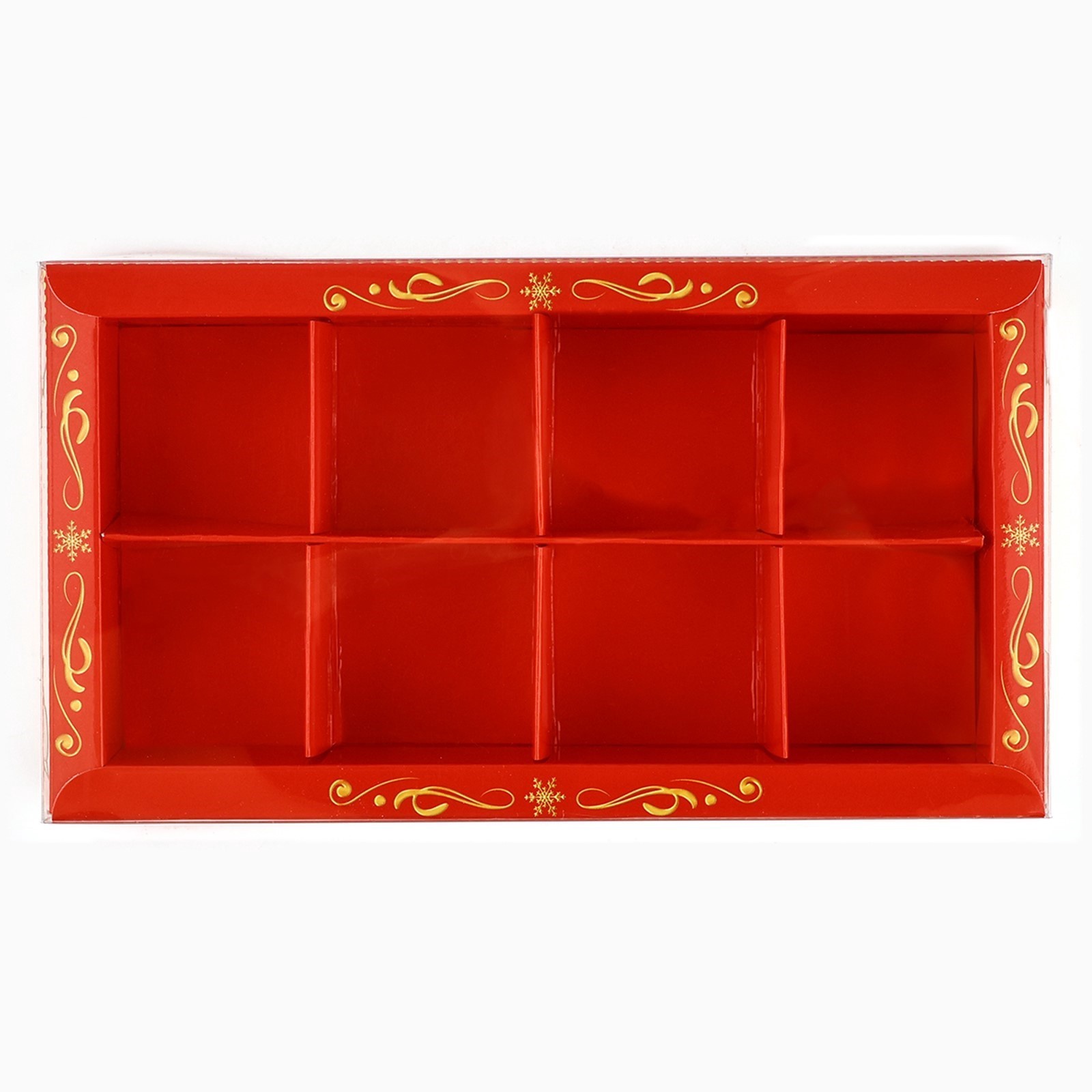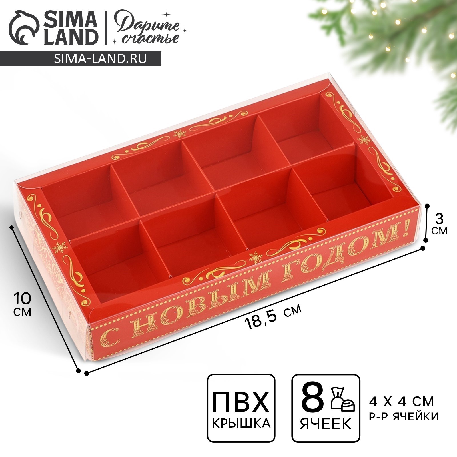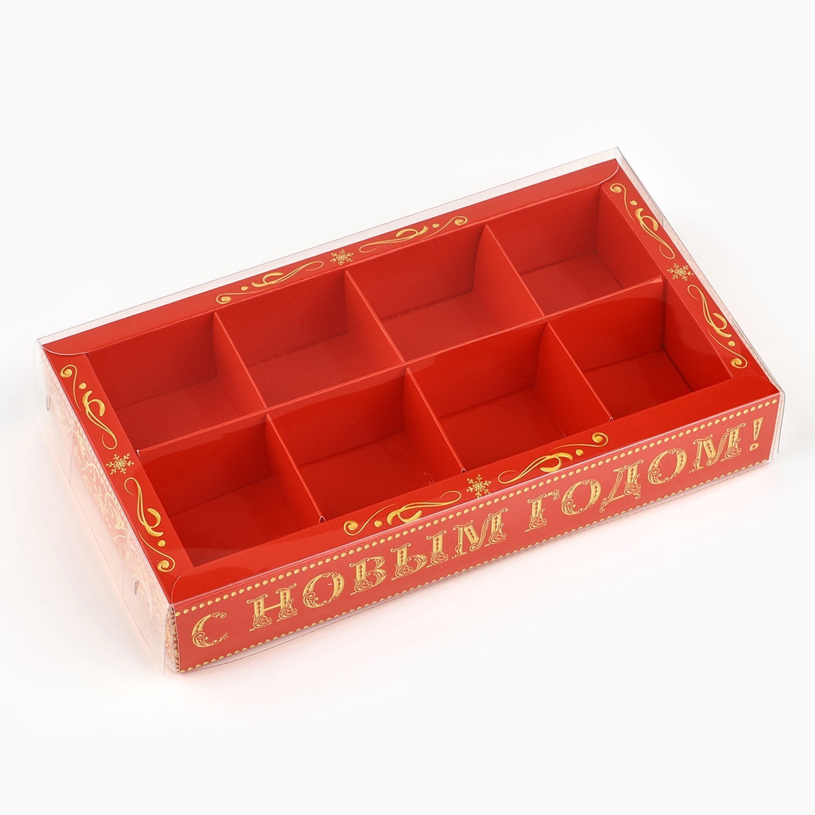 Коробка под 8 конфет с ячейками «с новым годом!», 10 х 18.5 х 3 см. Цвет:Красный|Форма:Прямоугольная|Плотность, г/м :250|Длина, см:18.5|Ширина, см:10|Высота, см:3|Количество ячеек:8|Тематика:Новогодняя|Символ года:Нет|Тематика праздника:Новый год|Материал:Картон|Вид:Складные коробки|Размер:Средний (18-24 см)|Страна:Китай  развернуть описание ▼