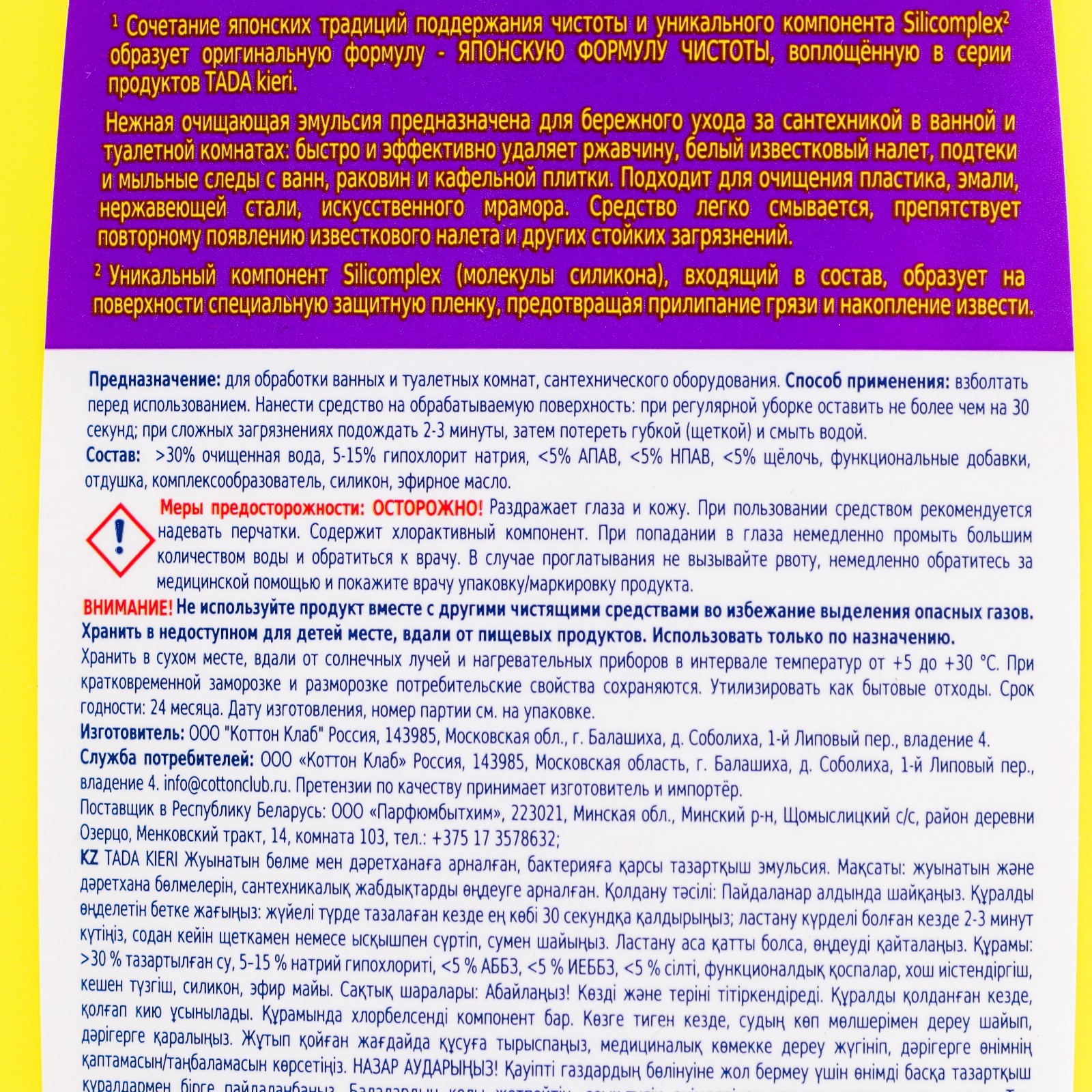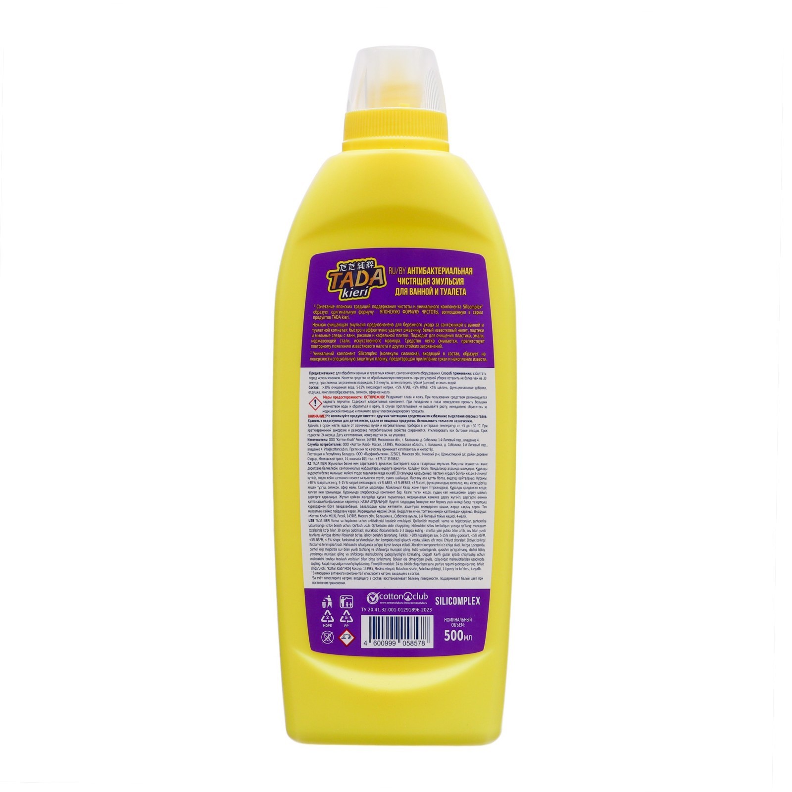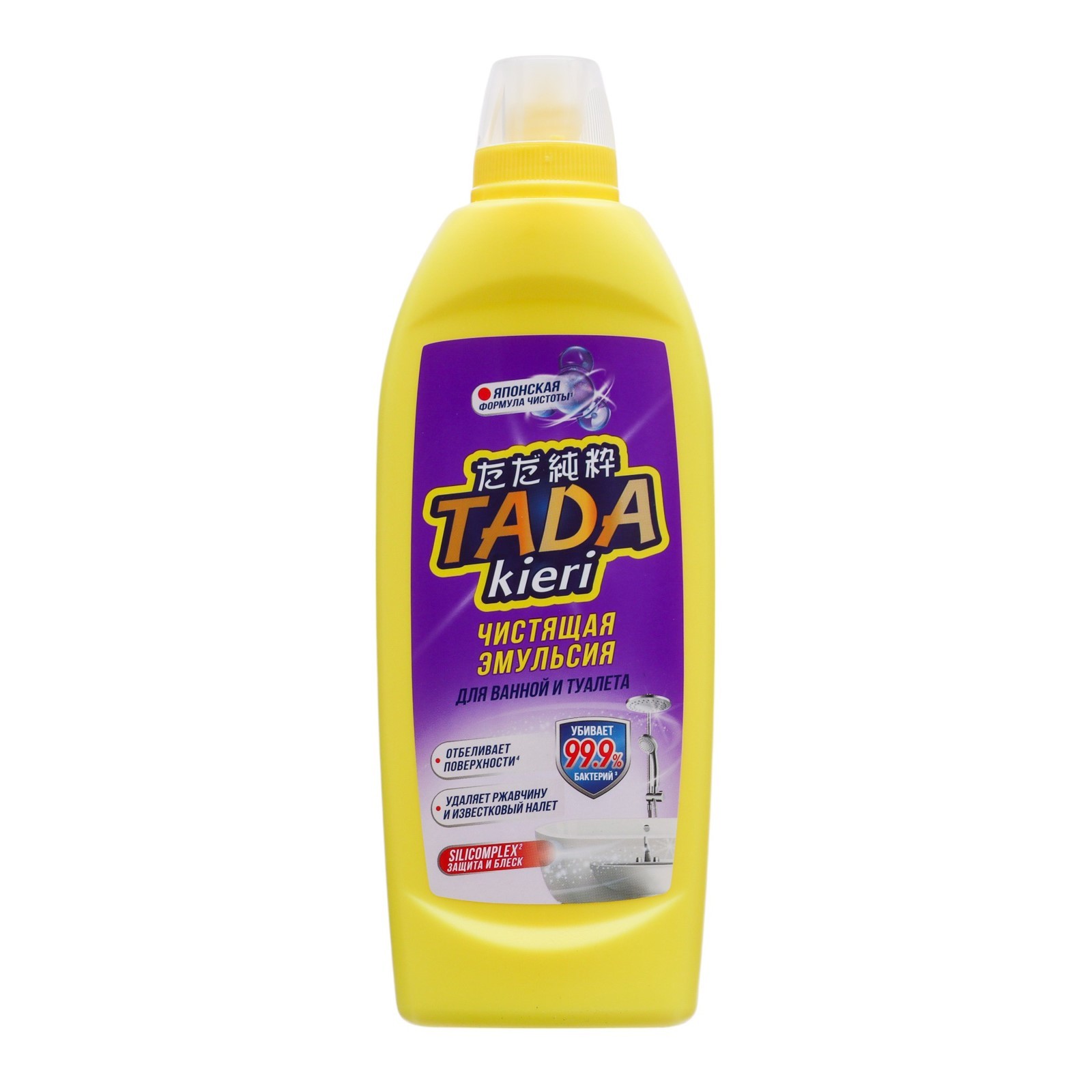 Антибактериальная эмульсия для ванны и туалета tada kieri , 500 мл. Предназначена для бережного ухода за сантехникой в ванной и туалетной комнатах: быстро и эффективно удаляет грязь с ванн, раковин и кафельной плитки. Подходит для очищения пластика, эмали, нержавеющей стали, искусственного мрамора. Убивает 99, 9% бактерий. Удаляет ржавчину, белый известковый налет, подтеки и мыльные разводы. Защищает поверхности и им придает блеск. Обеспечивает стойкий эффект отбеливания. Состав:>30% очищенная вода, 5-15% гипохлорит натрия, <5% АПАВ, <5% НПАВ, <5% щёлочь, функциональные добавки, отдушка, комплексообразователь, силикон, эфирное масло. Объём, мл: 500 Температурное ограничение: Нет  развернуть описание ▼