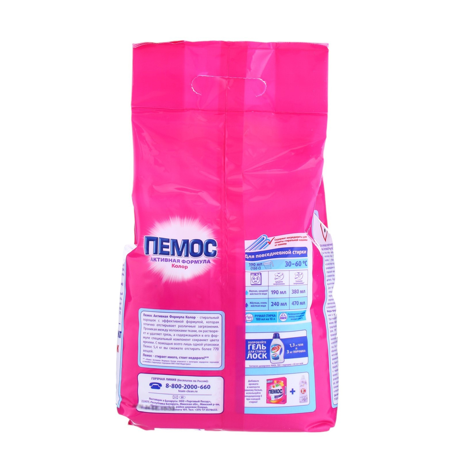 Стиральный порошок пемос color для цветного белья, 5,4 кг. Стиральный порошок Пемос Color для цветного белья - это высокоэффективное средство для стирки, специально разработанное для сохранения яркости и насыщенности цветов ваших вещей. Порошок прекрасно справляется с различными видами загрязнений, обеспечивая глубокую очистку ткани. Благодаря своей формуле, он предотвращает перенос красителей между волокнами ткани, что позволяет сохранить первоначальный вид одежды на длительное время. Стиральный порошок Пемос Color идеально подходит для регулярного использования и экономичен в расходе. Упаковка весом 5, 4 кг позволит вам провести множество стирок, не беспокоясь о пополнении запасов средства. Вес, кг: 5.4 Назначение: Для цветных тканей Вид стирки: Для всех видов стирки Температурное ограничение: Нет  развернуть описание ▼