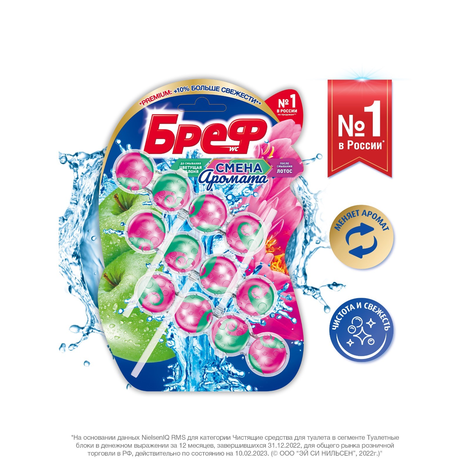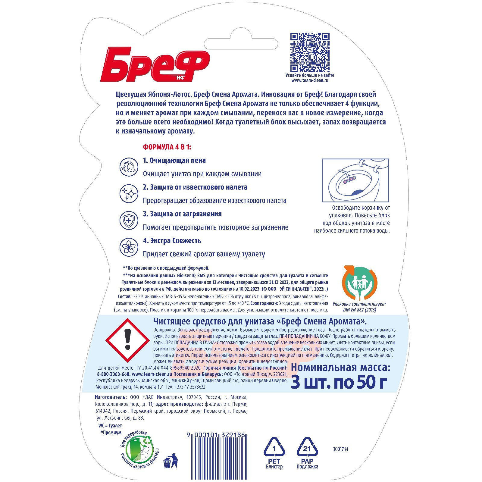 Блок для унитаза Bref смена аромата "яблоня-лотос", 3 шт х 50 гр