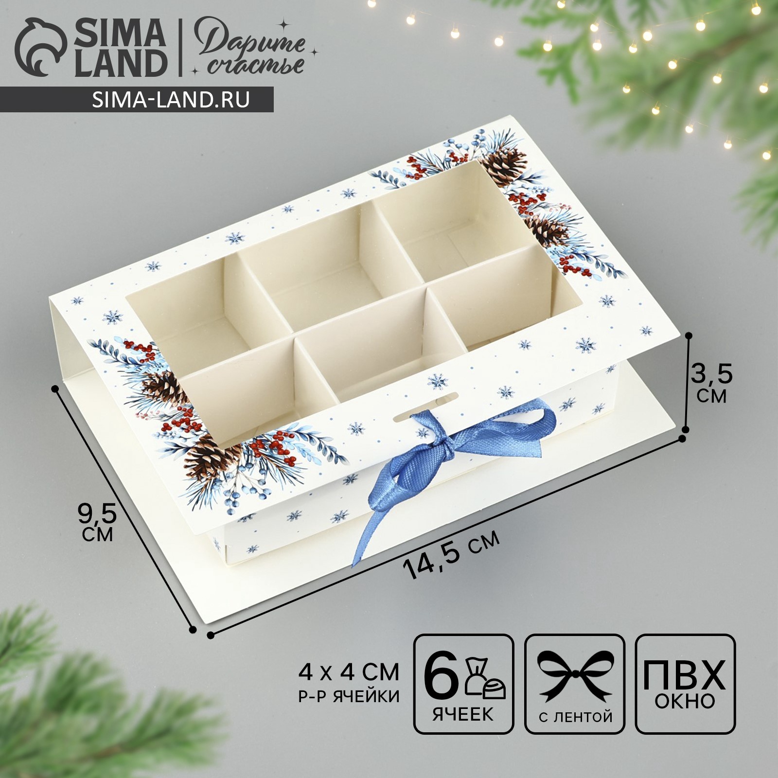 Коробка под 6 конфет с ячейками «с новым годом!» 14.5 х 9.5 х 3.5 см. Вид упаковки:Для конфет|Цвет:Белый|Форма:Прямоугольная|Плотность, г/м :250|Длина, см:14.5|Ширина, см:9.5|Высота, см:3.5|Количество ячеек:6|Тематика:Новогодняя|Символ года:Нет|Тематика праздника:Новый год|Материал:Пластик|Материал:Картон|Вид:Складные коробки|Размер:Малый (11-17 см)|Страна:Китай  развернуть описание ▼