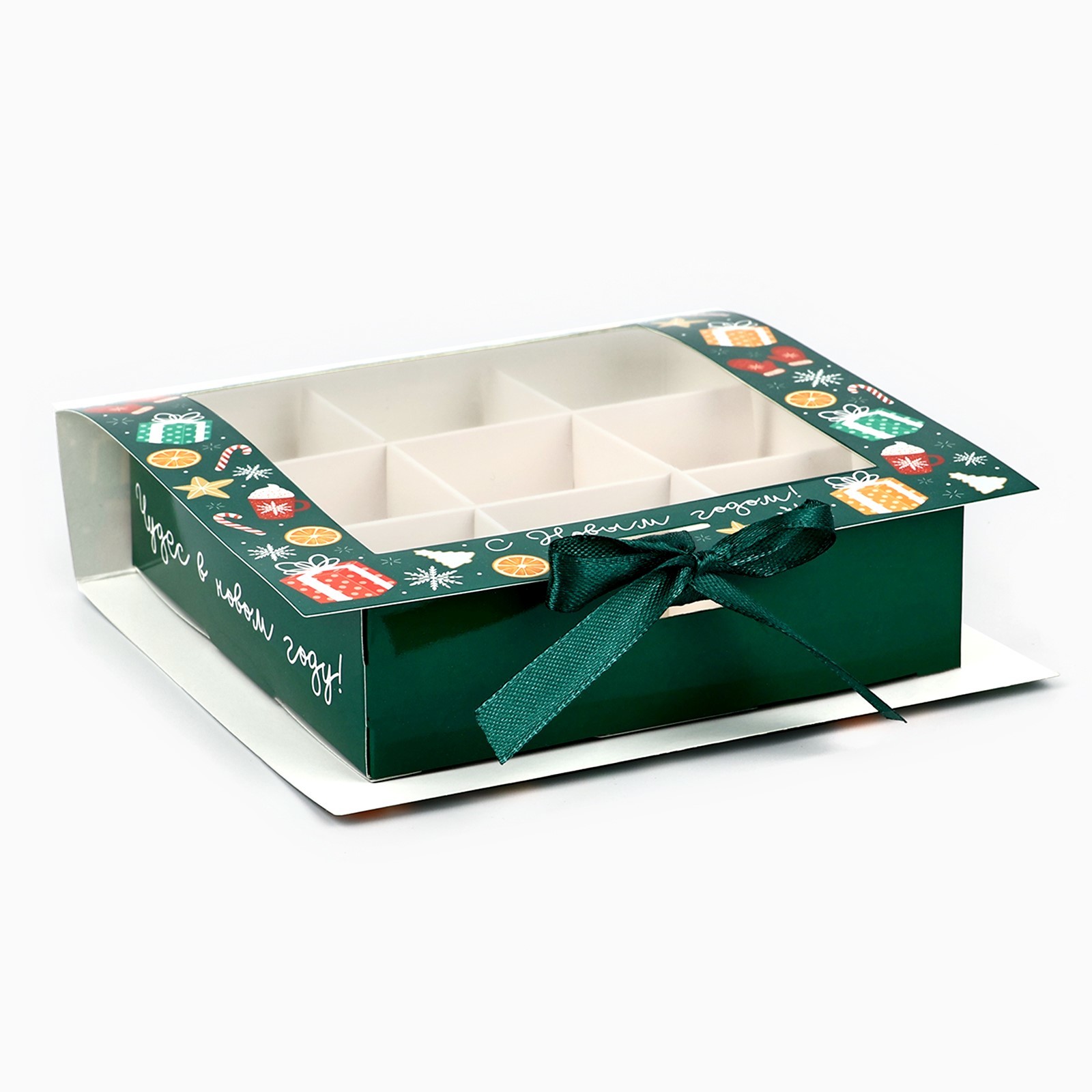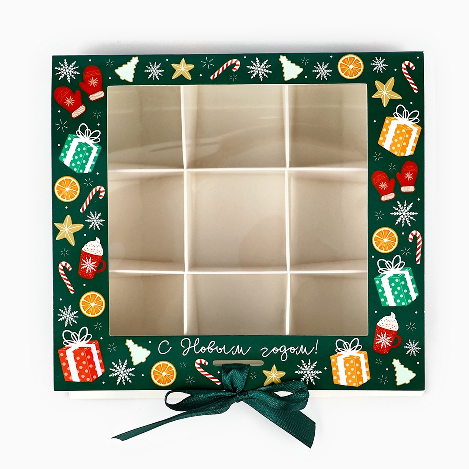 Коробка под 9 конфет с ячейками «с новым годом!» 14.5 х 13.5 х 3.5 см. Вид упаковки:Для конфет|Цвет:Зелёный|Для кого:Унисекс|Форма:Квадратная|Плотность, г/м :250|Длина, см:14.5|Ширина, см:13.5|Высота, см:3.5|Количество ячеек:9|Тематика:Новогодняя|Символ года:Нет|Тематика праздника:Новый год|Материал:Картон|Материал:Пластик|Вид:Складные коробки|Размер:Малый (11-17 см)|Страна:Китай  развернуть описание ▼