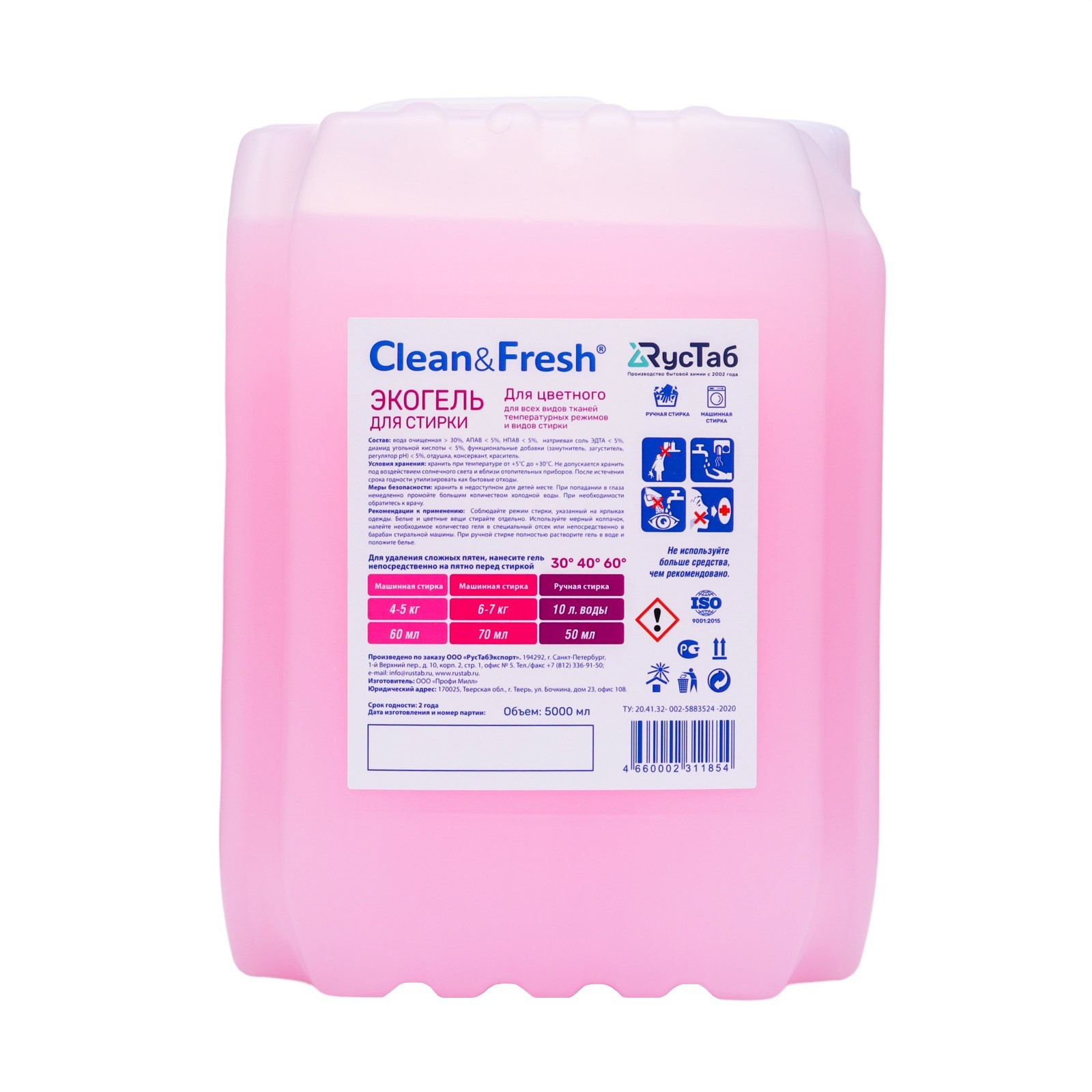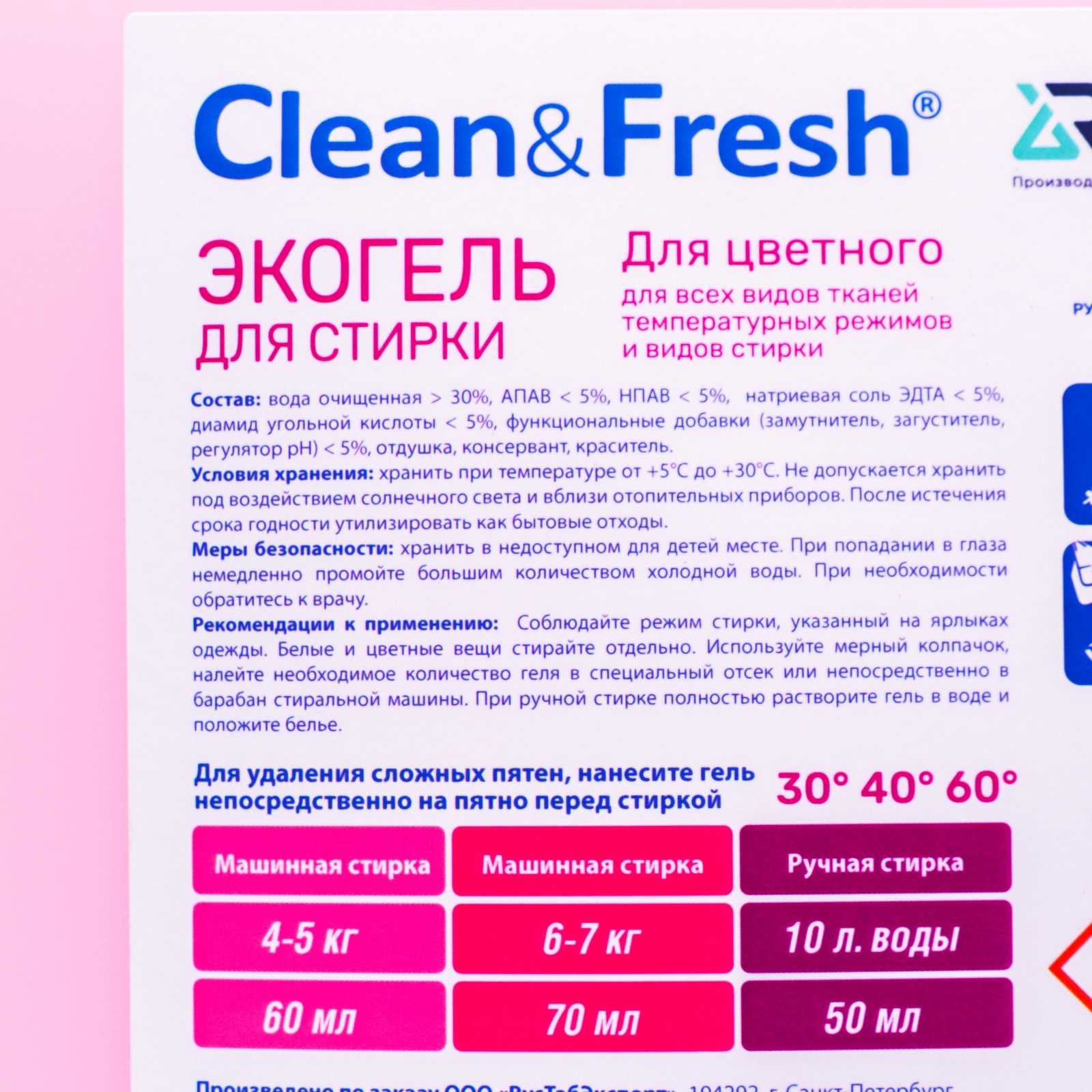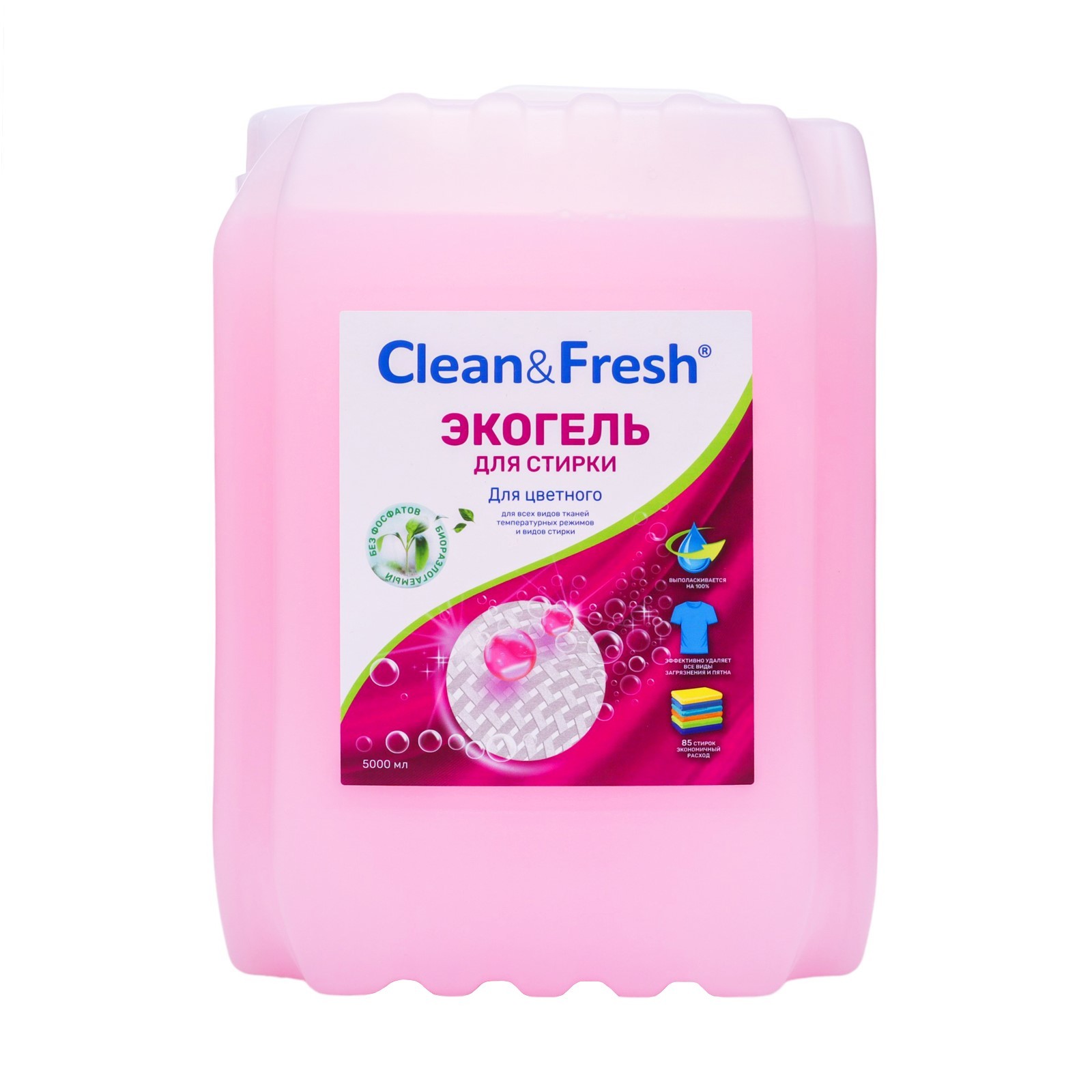 Гель для стирки "clean&fresh" для цветного белья, 5 л. Гель для стирки "Clean&Fresh" для цветного белья - это высокоэффективное средство, предназначенное для стирки цветных тканей. Гель выпускается в упаковке объемом 5 литров, что делает его экономичным и удобным в использовании. Гель "Clean&Fresh" обладает рядом преимуществ. Во-первых, он эффективно удаляет загрязнения, сохраняя при этом яркость и насыщенность цветов. Во-вторых, гель бережно относится к тканям, предотвращая их выцветание и износ. В-третьих, он обладает приятным ароматом, который остается на белье после стирки. Средство подходит для стирки различных типов тканей, включая хлопок, лен, синтетику и смешанные ткани. Гель "Clean&Fresh" можно использовать как в стиральных машинах, так и при ручной стирке. Способ применения геля "Clean&Fresh" прост: необходимо добавить нужное количество средства в отсек для стирального порошка или прямо в барабан стиральной машины. Рекомендуемая дозировка зависит от степени загрязнения белья и жесткости воды. Гель для стирки "Clean&Fresh" для цветного белья - это отличный выбор для тех, кто ценит качество и эффективность стирки, а также заботится о сохранении яркости и насыщенности цветов своих вещей. Состав: вода очищенная >30%, АПАВ < 5%, НПАВ < 5%, ингибитор переноса красителей < 5%, натриевая соль ЭДТА < 5%, диамид кислоты < 5%, функциональные добавки (замутнитель, загуститель, регулятор pH) < 5%, отдушка, консервант, краситель. Вес, г/Объём, мл: 5000 Форма выпуска: Гель Назначение: Для цветных тканей Температурное ограничение: Нет  развернуть описание ▼