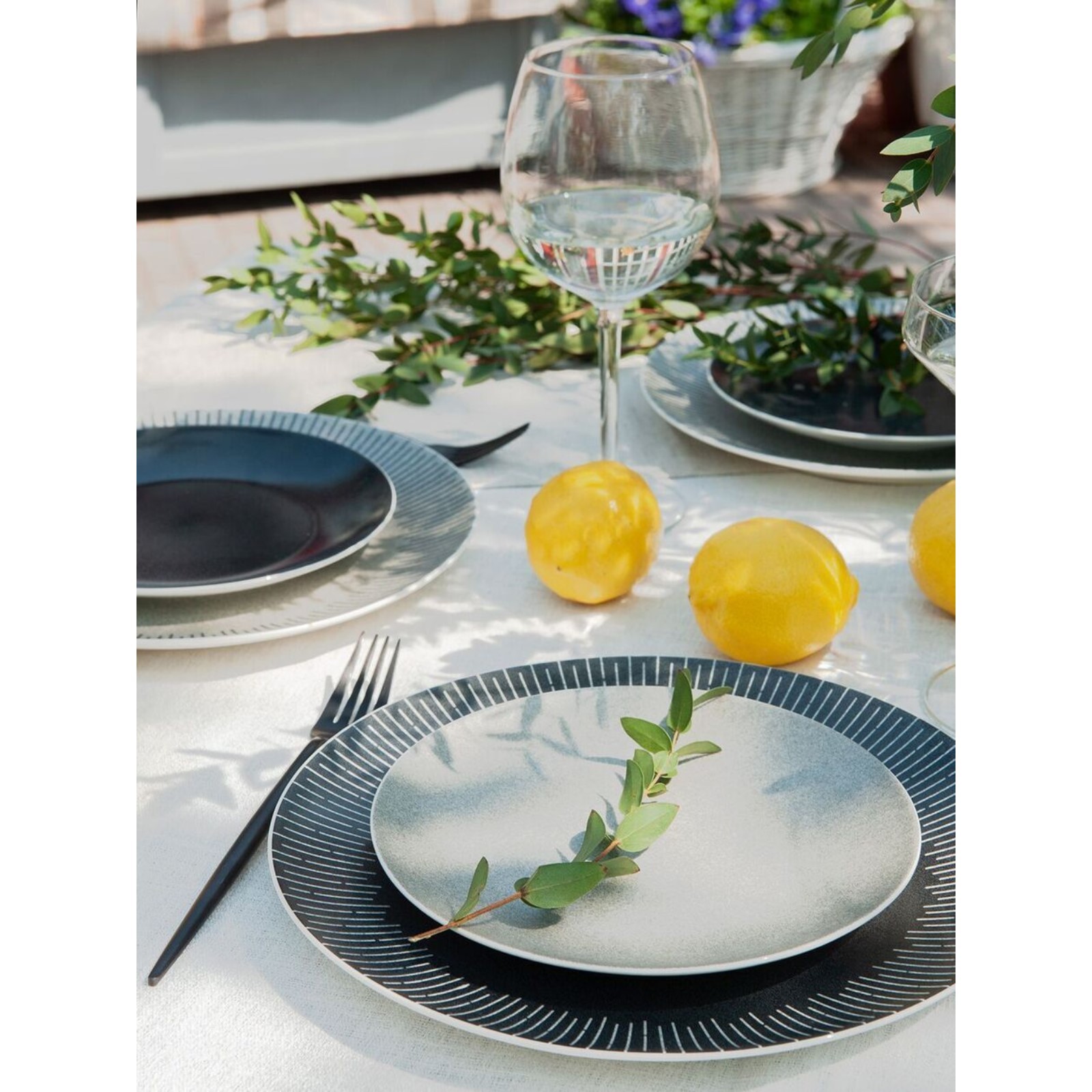 Коллекция ыполнена в тёмных оттенках, близких к графитовому цвету. Цвет этот неоднородный, а выполнен в виде скопления графичных точек, точь-в-точь каменная поверхность. Тарелка декорирована графичными линиями.