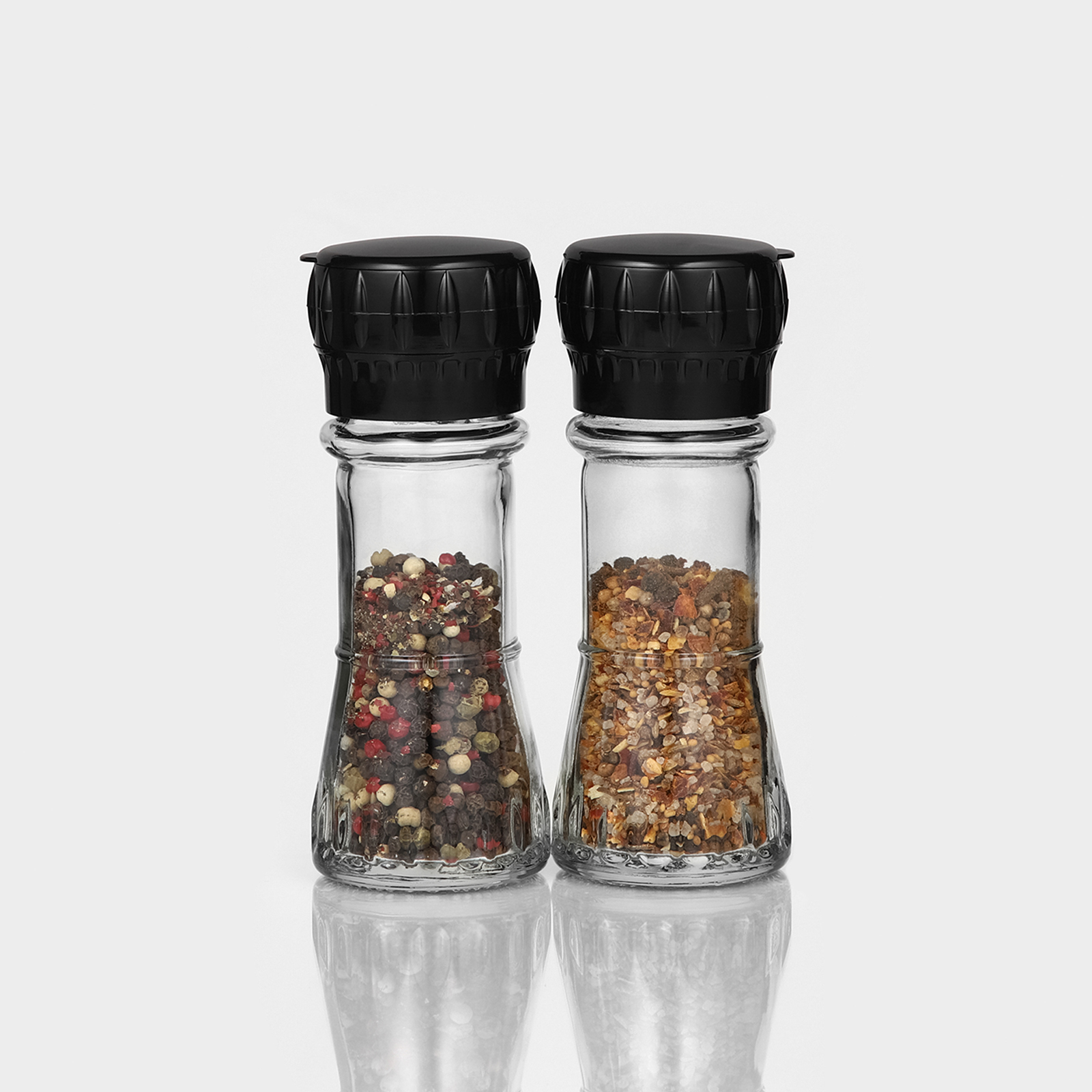 Набор стеклянных мельниц, 80 мл, 2 шт, цвет чёрный. Мельница для специй - это удобный и практичный инструмент на кухне. Преимущества мельницы:Вкус и аромат у свежесмолотых специй ярче и тоньше, чем у полежавших, и это легко проверить. Время хранения без потери качеств. Раздробленный перец даже в хорошей упаковке теряет ощутимую часть вкуса в первую неделю. Если купить пакетик кардамона, выпущенный сегодня, вряд ли получится потратить его за неделю. Гибкость в использовании. В мельницу можно заправить нужный набор специй и контролировать степень помола. Например, собрать смесь перцев из тех вариантов, которые любите. На стейк молоть покрупнее, а в суп — помельче, или наоборот. Как пользоваться:Положите необходимое количество специй внутрь изделия и начинайте вращать ручку. Совсем скоро вы получите желаемый результат! Цвет: Чёрный В наборе, шт.: 2 tnved: 8210000000 Температурное ограничение: Нет  развернуть описание ▼