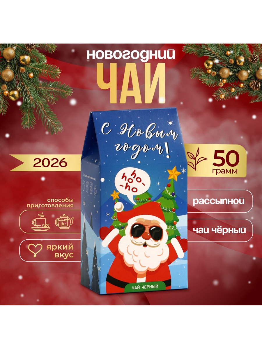 Новогодний подарочный чай «с новым годом», 50 г. Чай Хо-Хо-Хо — это ароматное наслаждение, созданное специально для новогодних праздников! Упакованный в стильную и эффектную пакетировку, этот чай весом 50 г станет изюминкой любого новогоднего стола и порадует всех любителей теплых напитков. С первых секунд заваривания Хо-Хо-Хо окутывает вас волшебным ароматом. Этот уникальный черный чай создает атмосферу уюта и тепла зимних вечеров, наполняя дом сиянием и радостью праздничного настроения. Каждая чашка этого чая идеально дополнит ваши новогодние угощения и станет отличным компаньоном к сладостям, а также дружеским встречам с близкими. Поделитесь этой незабываемой чайной традицией и создайте особую атмосферу в кругу родных, наслаждаясь каждым глотком. Хо-Хо-Хо — это не просто чай, это приглашение в мир сказки и волшебства, которое будет сопровождать вас в течение всего праздника и за его пределами. Позвольте себе окунуться в магию зимы с чашкой этого чудесного чая! Набор:Нет|Вес нетто, г:50|Фасовка:Весовой|Вид чая:Чёрный|Символ года:Нет|Тематика праздника:Новый год|Вкус:Без вкуса|Подарочный чай :Да|Добавки чая:Без добавок|Вид упаковки :В картонной коробке|Страна:Россия  развернуть описание ▼