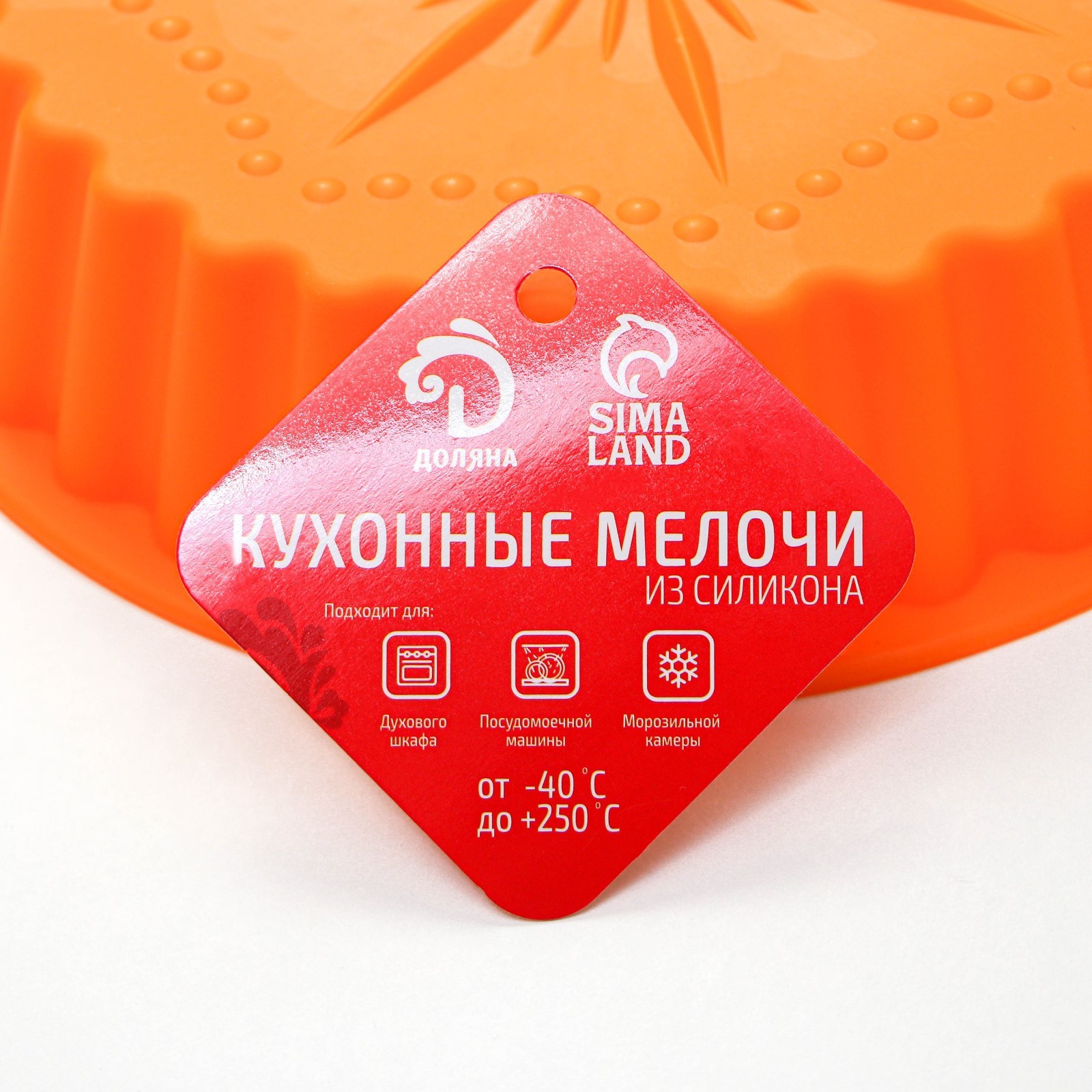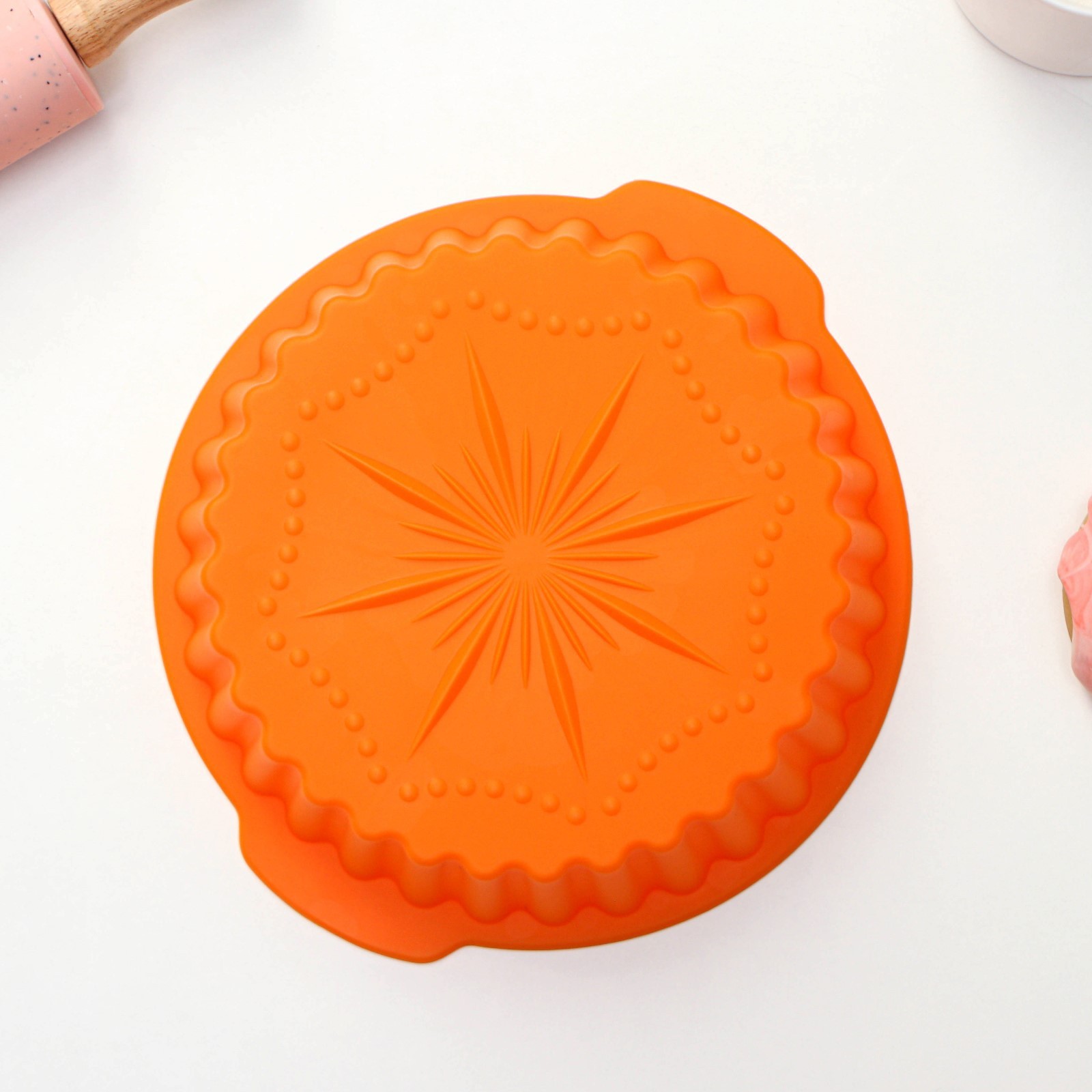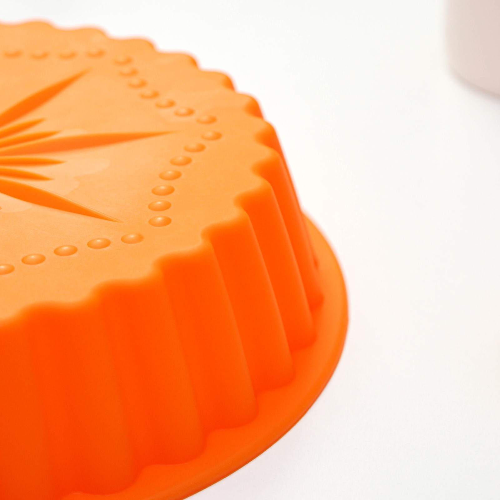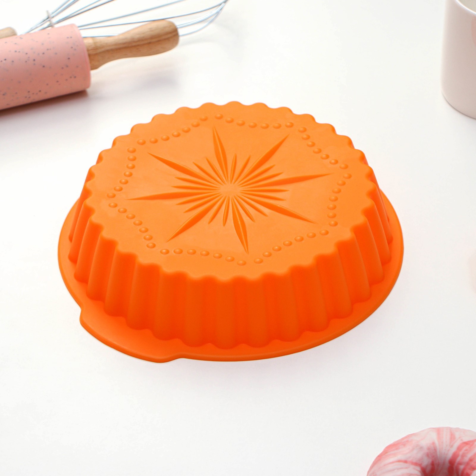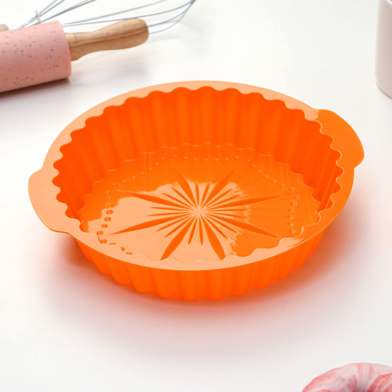 Форма силиконовая для выпечки доляна «рифлёный круг. звезда», d=20 см, с ручками, цвет микс. Цвет: Оранжевый Форма: Круглая Диаметр, см: 20 Фасовка, шт.: 1 Количество ячеек: 1 Крышка: Нет Материал: Силикон Тип покрытия: Без покрытия Ячейки: Нет Наличие палочек для форм: Нет Тип формы: Для коржей Тип формы: Для пирогов Разъёмная форма: Нет Съёмное дно: Нет Можно мыть в посудомоечной машине: Да  развернуть описание ▼