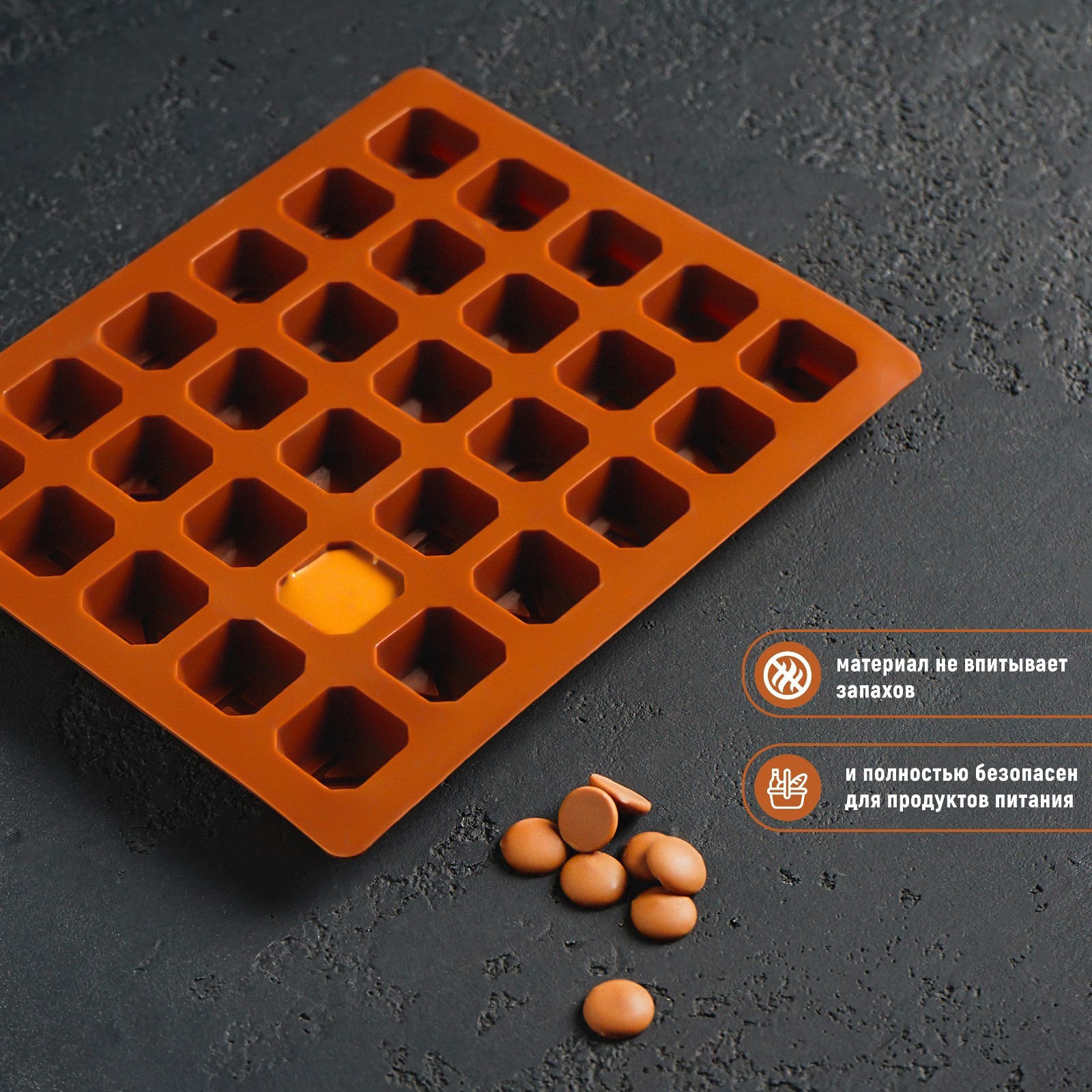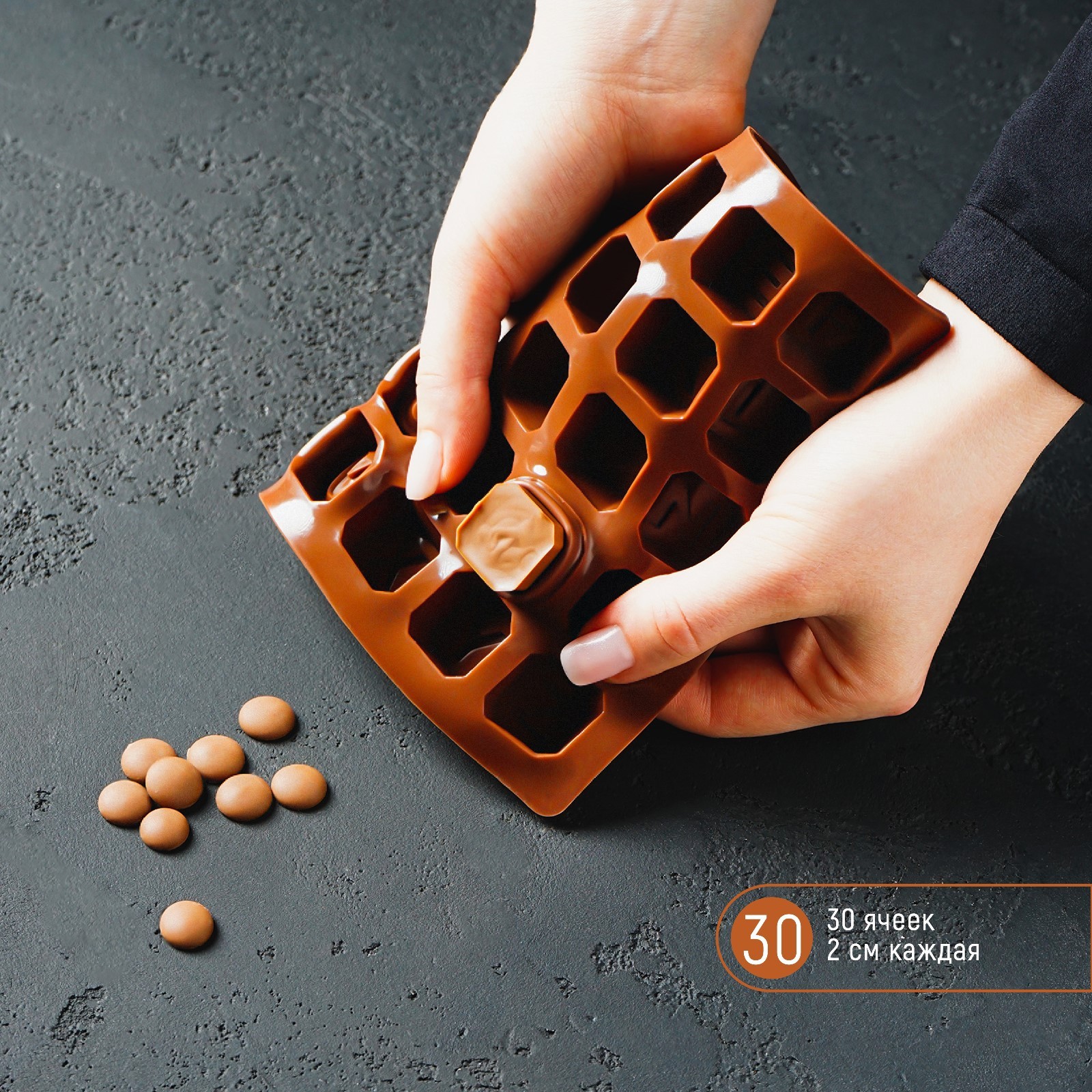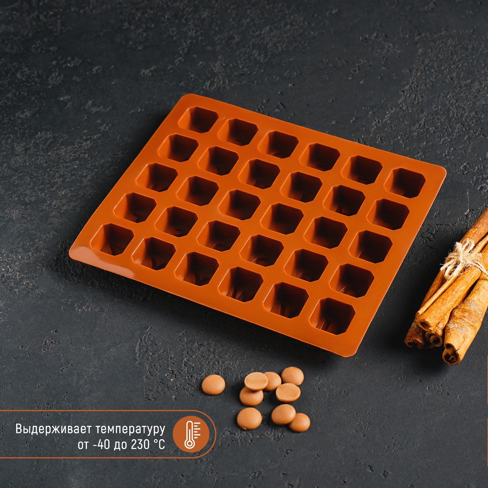 Форма силиконовая для украшений доляна «английский алфавит», 17x14 см, 30 ячеек, цвет коричневый. Силиконовые формы для кондитерских украшений помогут оригинально декорировать десерт или выпечку! Приготовить миниатюрные украшения гораздо проще, чем кажется. Наполните силиконовую ёмкость расплавленным шоколадом, мастикой, карамелью и поместите в морозильную камеру. Вскоре у вас будут оригинальные сладости, которые сделают запоминающимся любой праздничный стол! Достоинства: содержимое не прилипает к стенкам изделия;силикон выдерживает температуру от -40 до 230 °С;материал не впитывает запахов и полностью безопасен для продуктов питания;форма легко отмывается. Создавайте неповторимые кулинарные шедевры вместе с формой «Английский алфавит»! Цвет: Коричневый Цвет: МИКС Форма: Квадратная Количество ячеек: 30 Крышка: Нет Материал: Силикон Тип покрытия: Без покрытия Ячейки: Да Наличие палочек для форм: Нет Разъёмная форма: Нет Съёмное дно: Нет Тематика: Цифры, буквы Можно мыть в посудомоечной машине: Нет  развернуть описание ▼