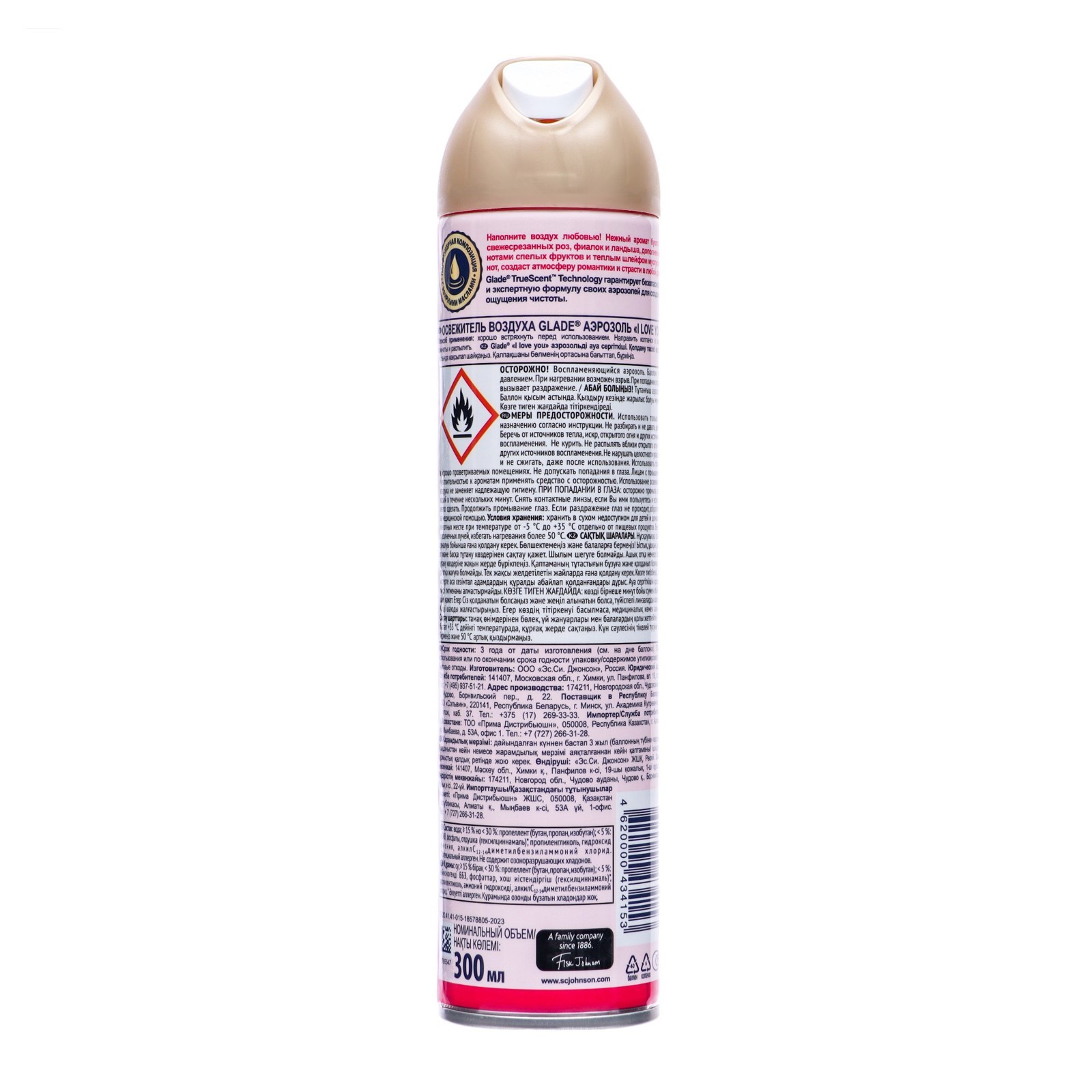 Освежитель воздуха glade "i love you", 300 мл. Освежитель воздуха Glade "I LOVE YOU" - это продукт, предназначенный для создания приятной атмосферы в помещении. Он выпускается в бутылке объемом 300 мл. Освежитель воздуха Glade "I LOVE YOU" обладает приятным ароматом, который помогает устранить неприятные запахи и создать уютную атмосферу в доме. Он идеально подходит для использования в гостиной, спальне или ванной комнате. Освежитель воздуха Glade "I LOVE YOU" прост в использовании. Для его применения необходимо снять крышку и нажать на кнопку распылителя. После этого аромат быстро распространится по помещению, создавая приятную атмосферу. Освежитель воздуха Glade "I LOVE YOU" безопасен для использования, так как не содержит вредных веществ. Он не вызывает аллергических реакций и не вредит здоровью. В целом, освежитель воздуха Glade "I LOVE YOU" - это отличный выбор для тех, кто хочет создать приятную атмосферу в своем доме. Он обладает приятным ароматом, прост в использовании и безопасен для здоровья. Объём, мл: 300 Аромат: Цветы Форма выпуска: Аэрозоль Принцип работы: Ручной Вид распыления: Влажное : 0 Температурное ограничение: Нет Тип: Освежитель воздуха  развернуть описание ▼