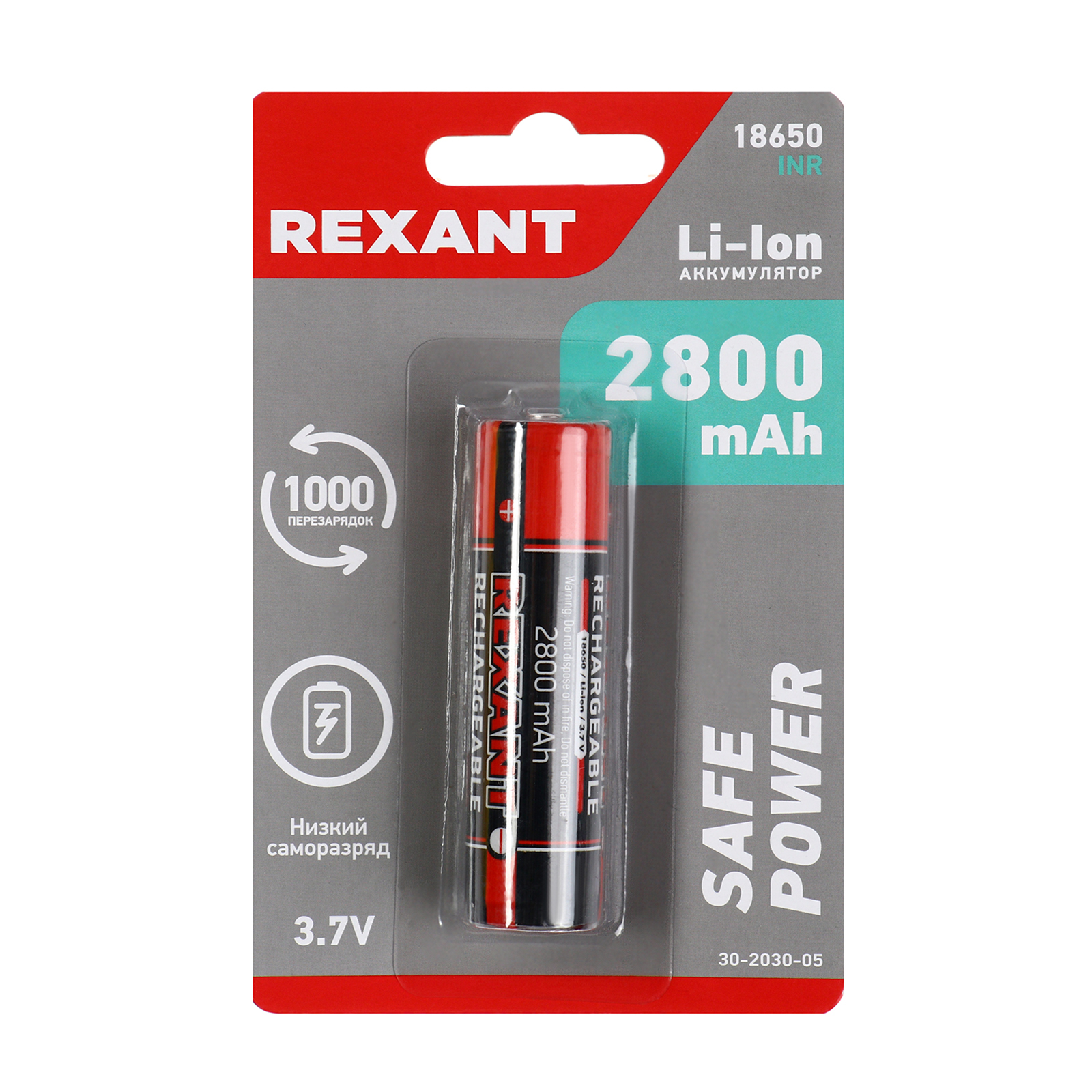 Аккумулятор Rexant, 18650 Unprotected, Li-ion, 2800 мач, 3.7 в, 1 шт., блистер