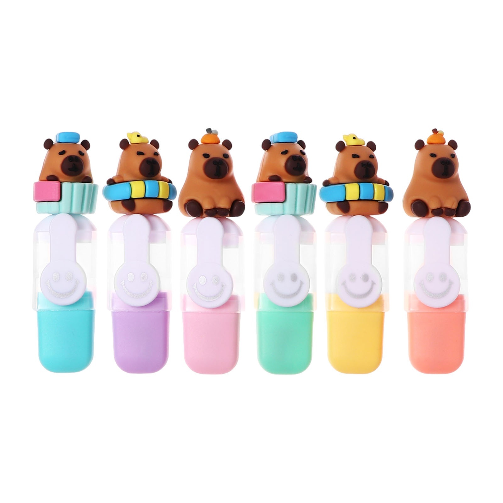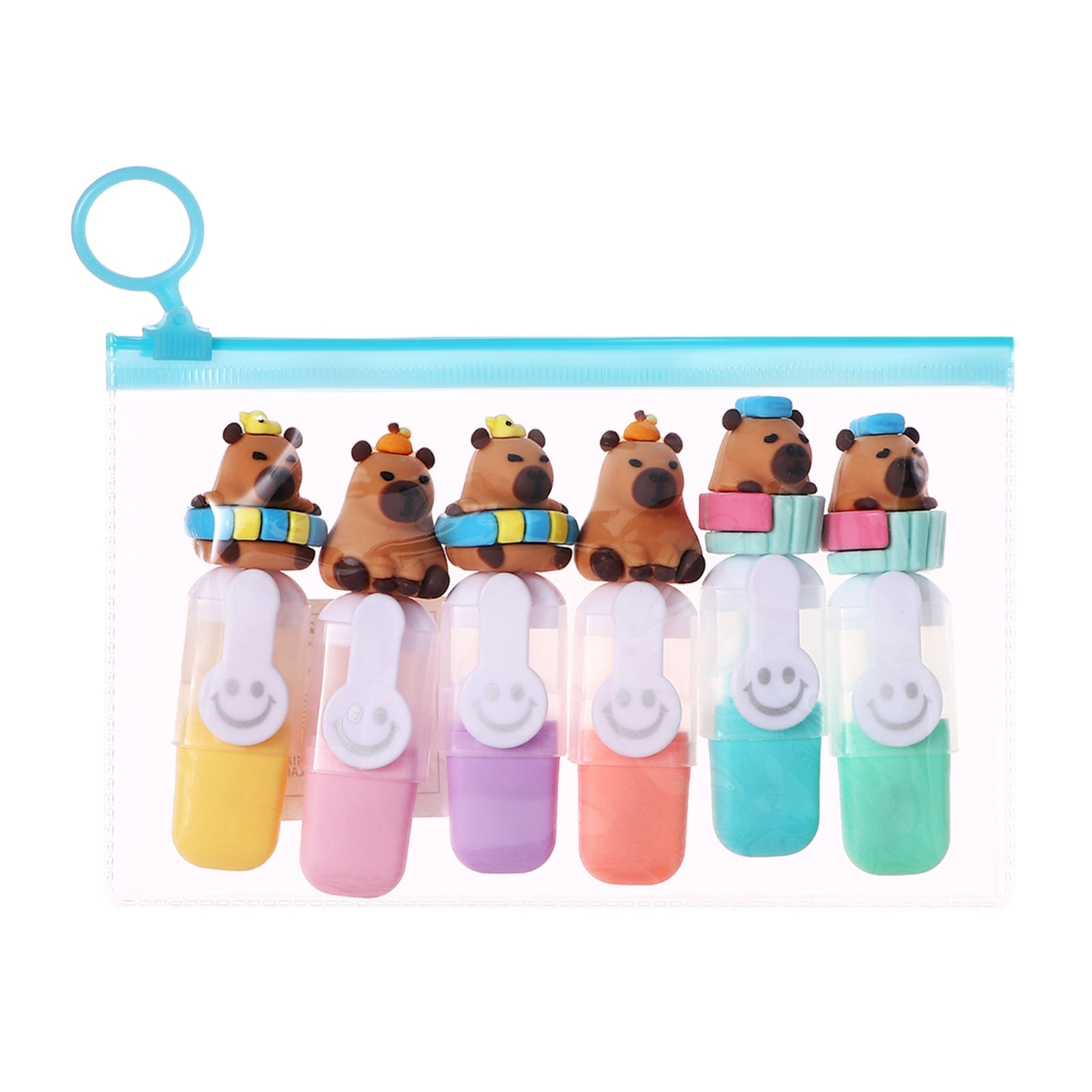 Набор маркеров-текстовыделителей, 6 штук, 6 цветов, в пенале, на молнии, «капибары». Тип:Водный|Тип наконечника:Скошенный|Диаметр пишущего узла, мм:0.1|Диаметр пишущего узла, мм:0.5|Назначение:Для бумаги|Диаметр пишущего узла, мм:0.1 - 0.5|Набор:Да|Количество цветов:6|Особенности цвета:Полупрозрачный|Цвет:МИКС|Европодвес:Нет|Особенности:Без особенностей|Штрихкод на единице товара:Да|Страна:Китай  развернуть описание ▼