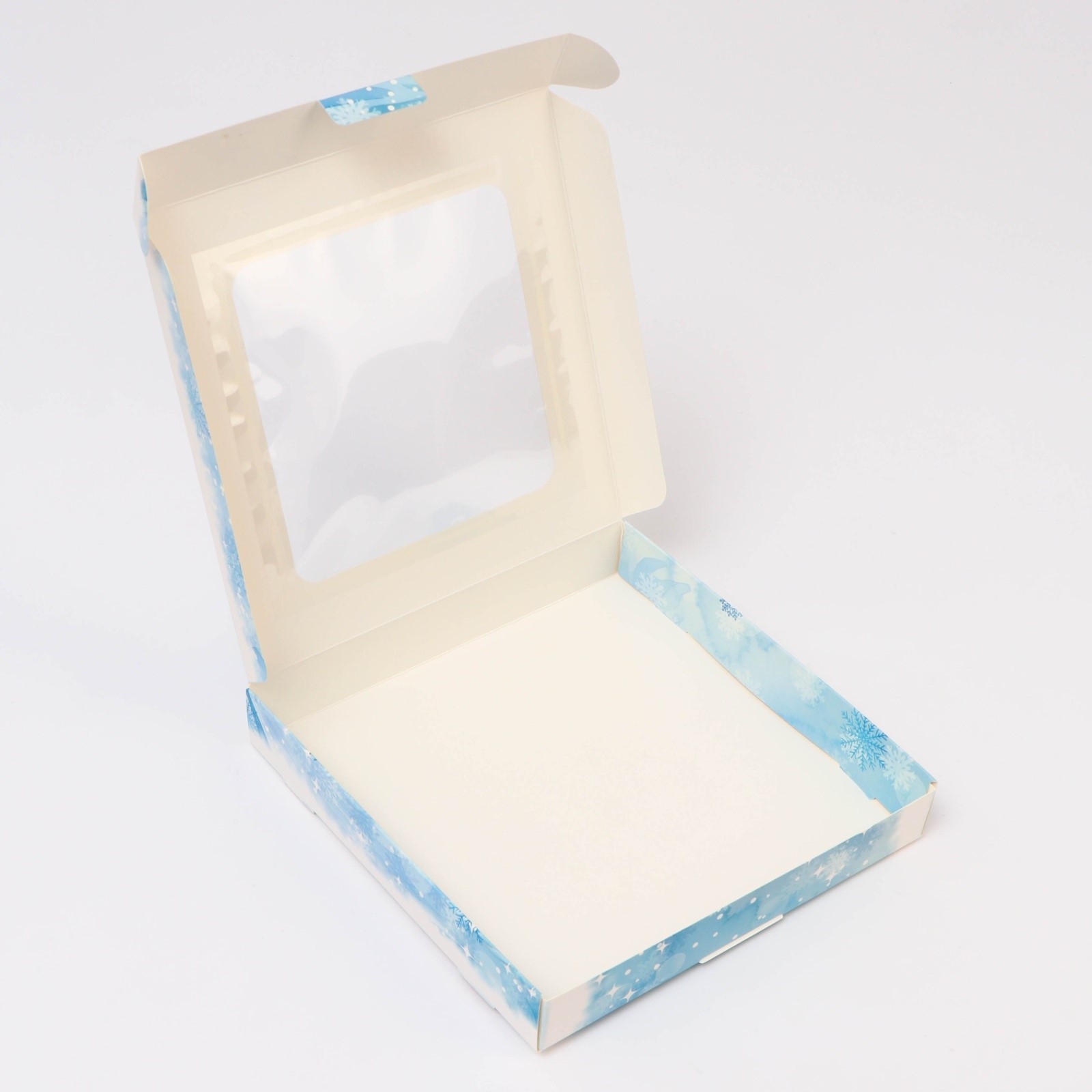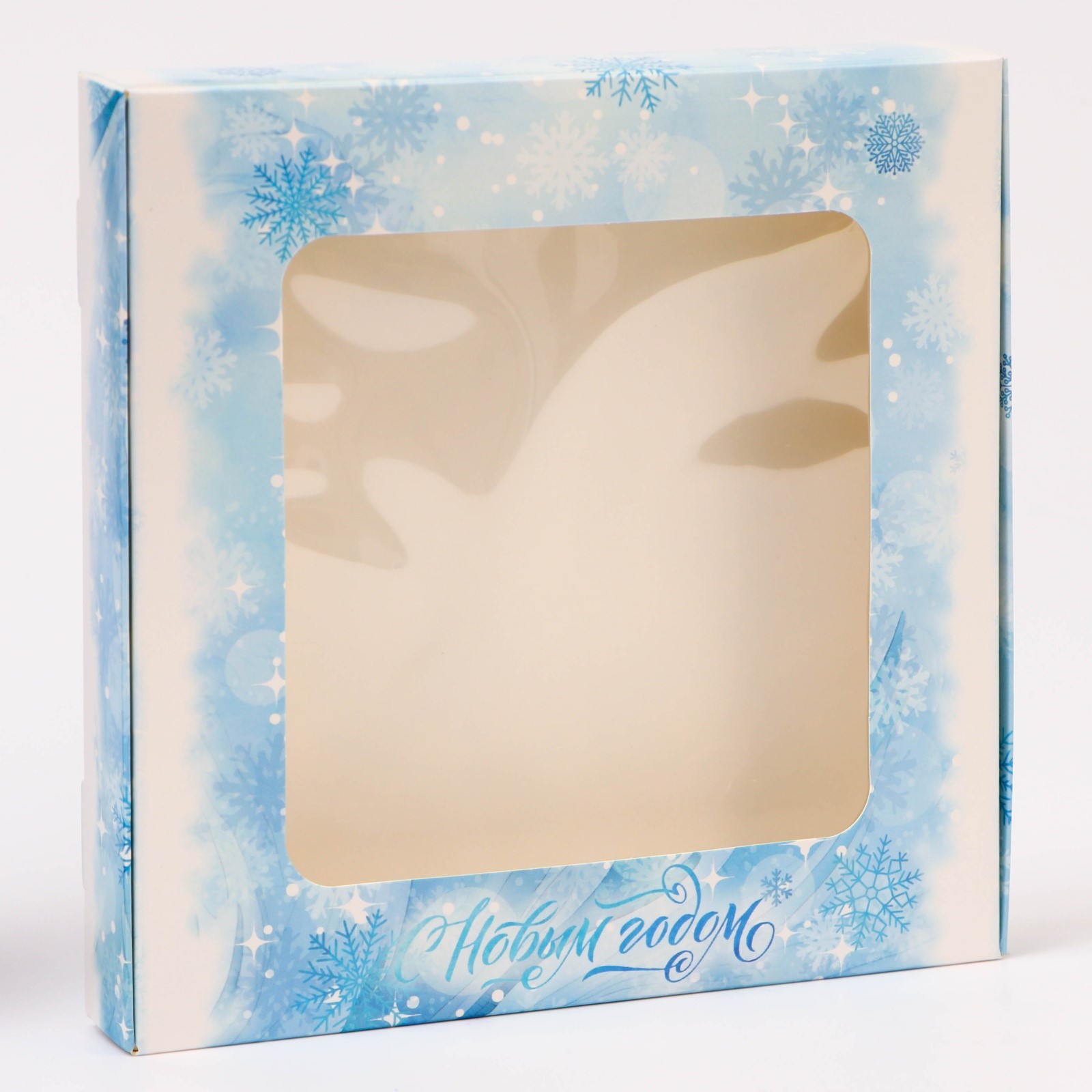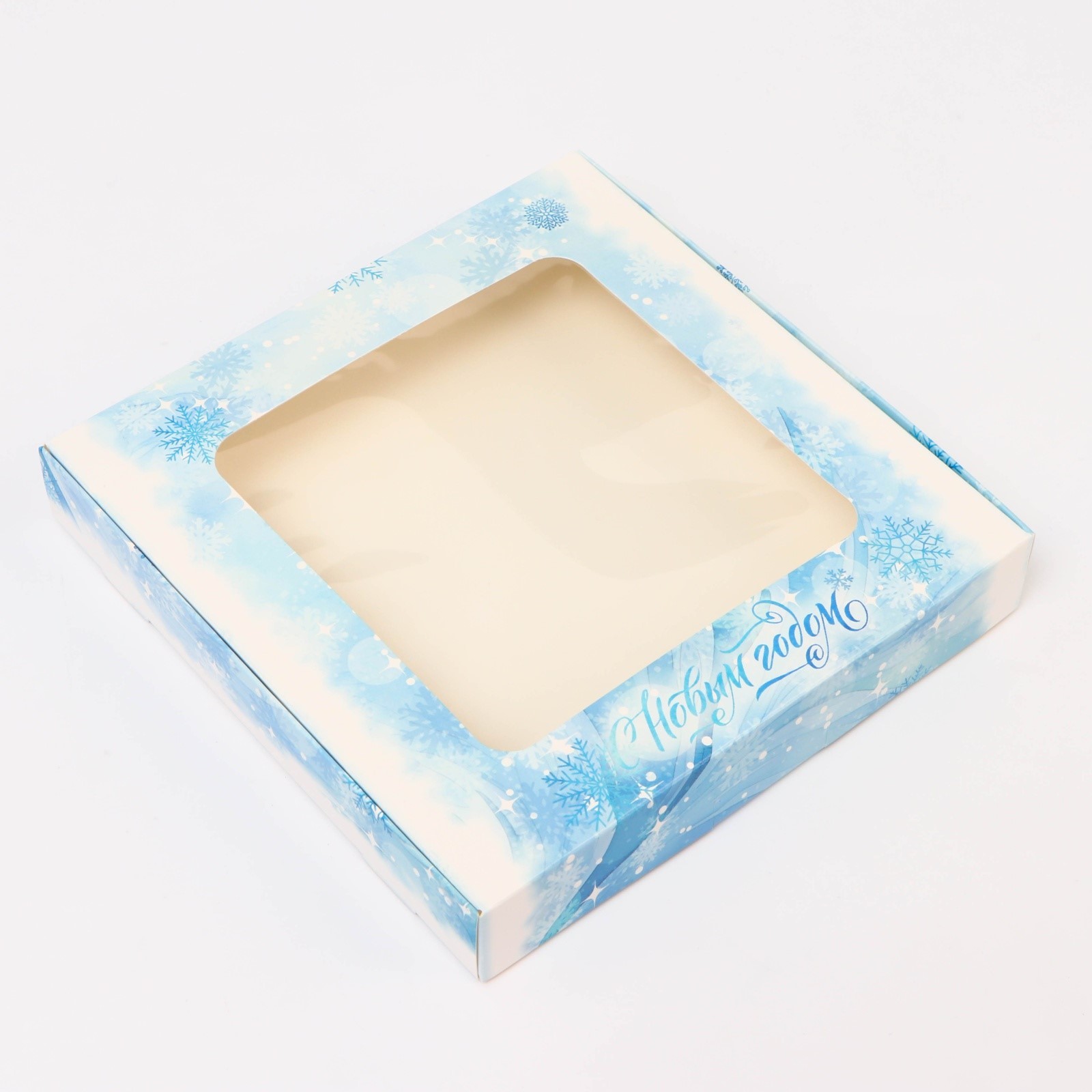 Коробка новогодняя подарочная складная с окном «с новым годом», 19 19 3 см. Подарочная сборная коробка с окном в новогоднем дизайне — это идеальная упаковка для кондитерских изделий, подарков и сувениров в праздничный сезон. Размеры и конструкция коробки позволяют удобно разместить различные виды сладостей, мелкие подарки или уникальные сувениры, обеспечивая их надежную защиту и привлекательное представление. Коробка изготовлена из прочного картона, а прозрачное окно на крышке позволяет эффектно продемонстрировать содержимое, сохраняя его свежесть и целостность. Яркий новогодний дизайн, включающий снежинки, елочные украшения и рождественские элементы, создаёт атмосферу праздника и волшебства. Сборная конструкция упрощает сборку и хранение коробок, а её элегантный внешний вид добавляет праздничного настроения и делает упаковку особенно запоминающейся. Эта коробка станет отличным выбором для упаковки подарков, угощений или сувениров, добавляя изысканности и радости в каждый момент праздника. Цвет:Голубой|Форма:Квадратная|Плотность, г/м :270|Длина, см:19|Ширина, см:3|Высота, см:19|Тематика:Новогодняя|Тематика:Рождественская|Символ года:Нет|Тематика праздника:Новый год|Материал:Картон|Вид:Складные коробки|Размер:Средний (18-24 см)|Окошко:Да|Крышка-дно:Нет|Страна:Китай  развернуть описание ▼