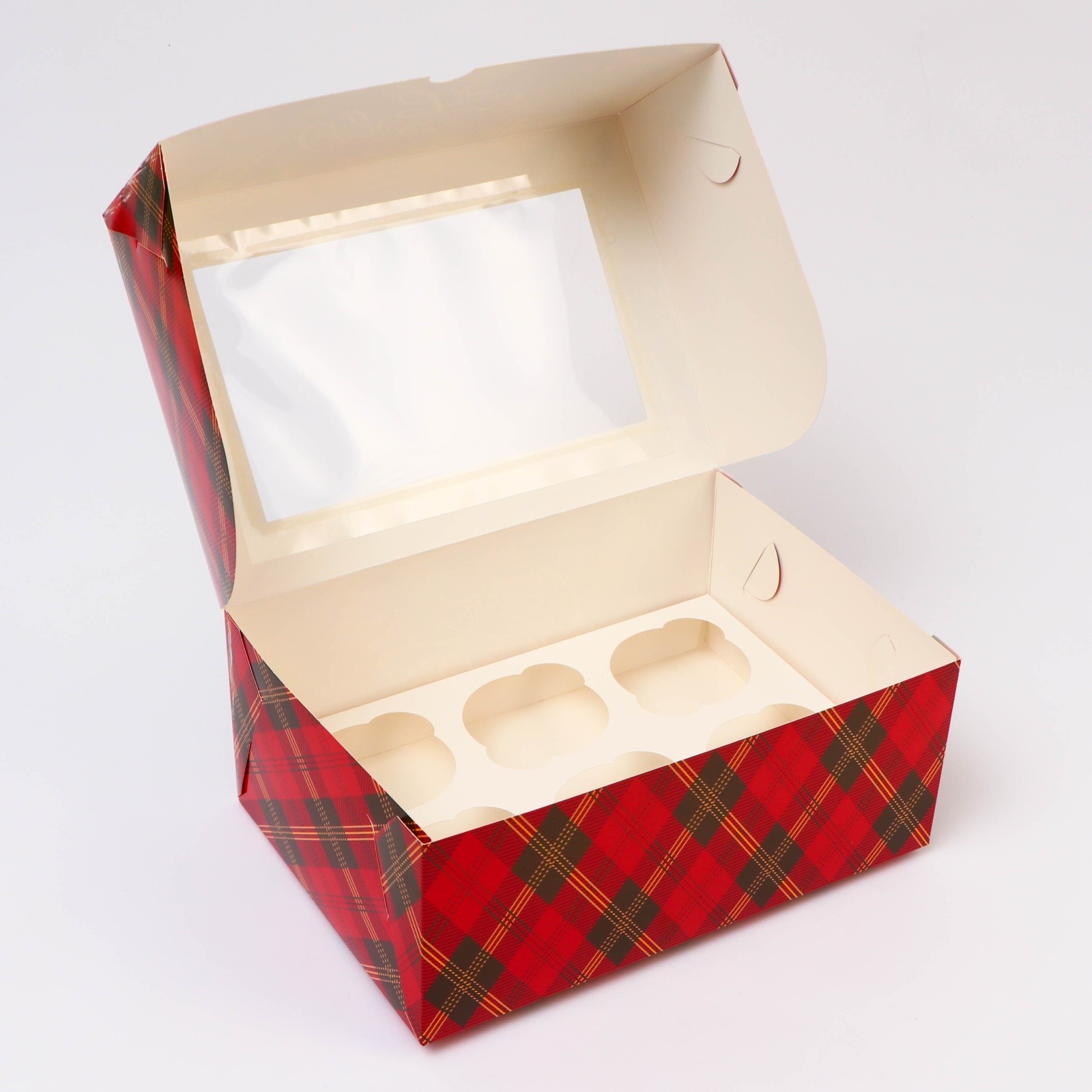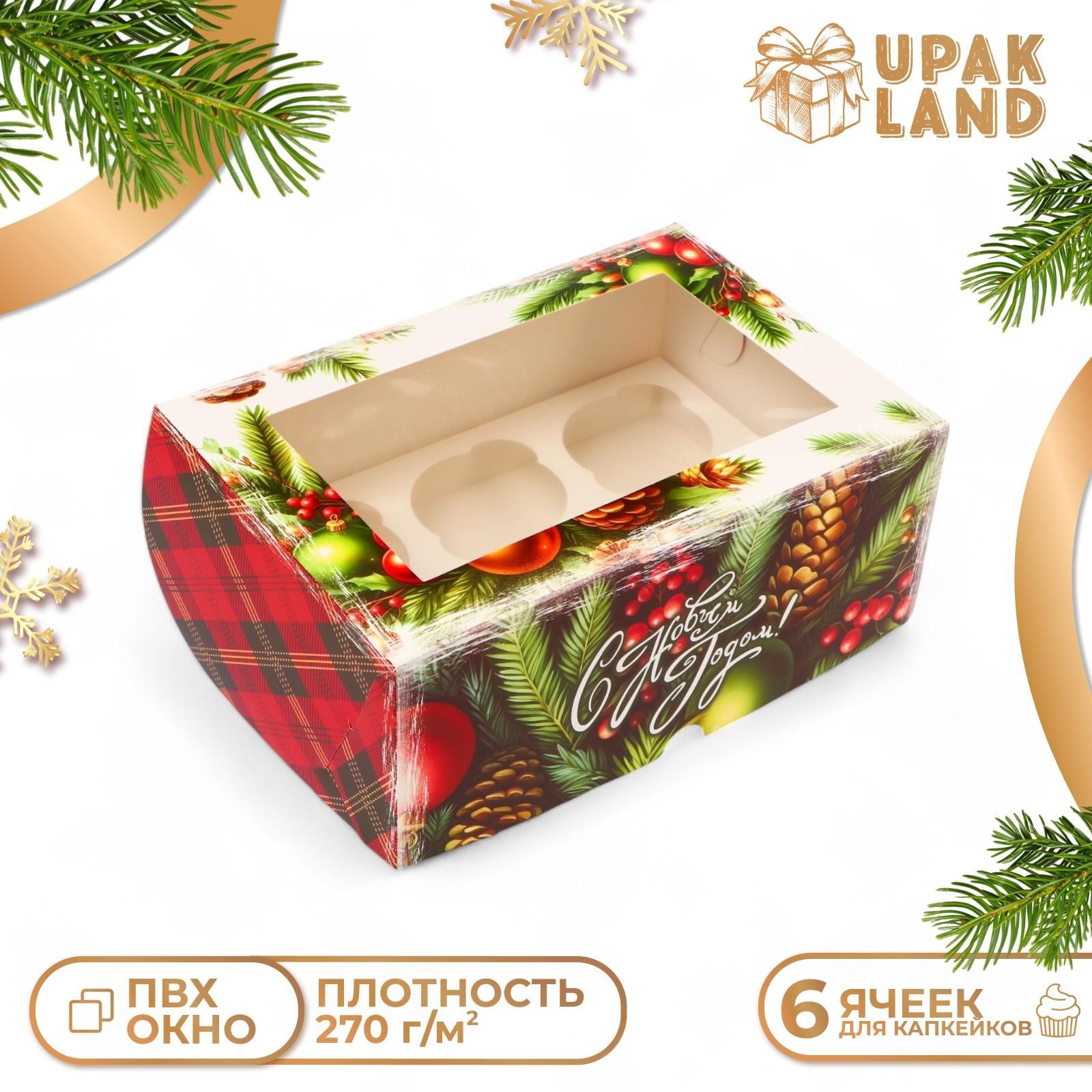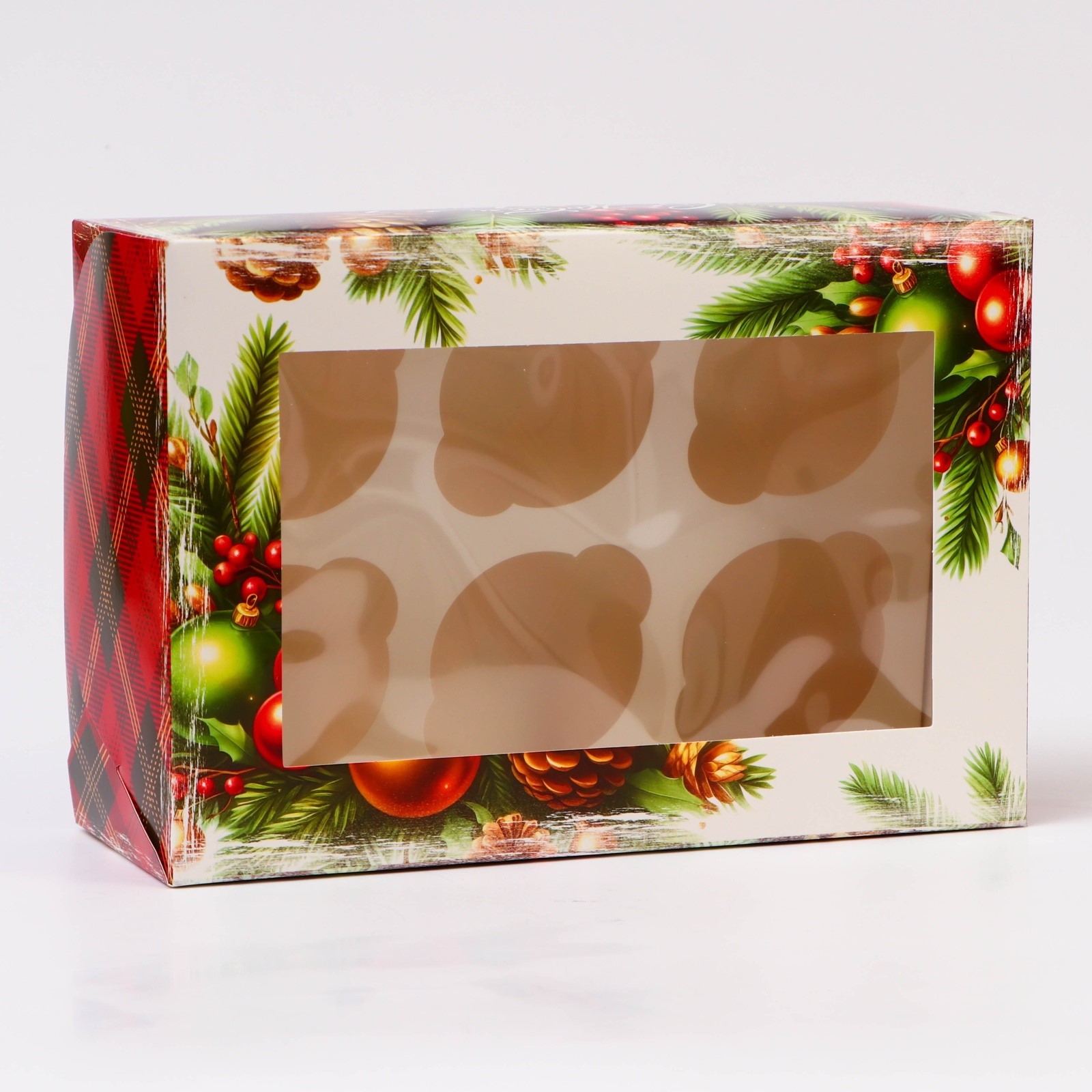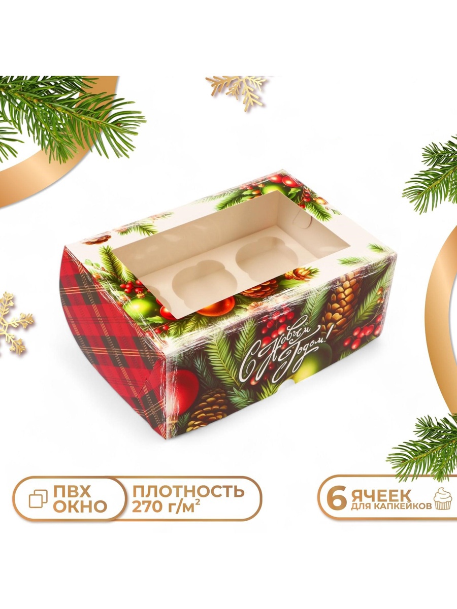 Коробка для 6 капкейков с окном «с новым годом», 25 17 10 см. Новогодняя коробка для капкейков — это праздничная упаковка, созданная для стильной и безопасной подачи ваших капкейков в зимний сезон. Коробка выполнена из прочного картона и украшена новогодним дизайном. Специальные вставки внутри коробки надежно фиксируют капкейки, защищая их от смещения и повреждений. Прозрачное окошко на крышке позволяет продемонстрировать яркие и красивые десерты, не открывая коробку. Компактные размеры и удобная конструкция делают упаковку удобной для транспортировки, а праздничное оформление превращает её в отличное дополнение к любому новогоднему подарку или столу. Такая коробка станет идеальным выбором для кафе, кондитерских и домашних пекарей, которые хотят создать праздничное настроение и удивить своих гостей или клиентов. Вид упаковки:Для капкейков|Вид упаковки:Универсальная|Цвет:Красный|Цвет:Разноцветный|Цвет:Белый|Форма:Прямоугольная|Плотность, г/м :270|Длина, см:25|Ширина, см:17|Высота, см:10|Вместимость, шт.:6|Тематика:Рождественская|Тематика:Новогодняя|Вид упаковки:Картонная упаковка|Вид упаковки:Подарочная коробка|Вид упаковки:Коробка картонная с PVC|Вид упаковки:Коробка картонная|Символ года:Нет|Тематика праздника:Рождество|Тематика праздника:Новый год|Материал:Картон|Материал:Пластик|Вид:Кондитерские коробки|Вид еды:Для пирожных|Вид еды:Для десертов|Вид:Складные коробки|Вид:Крафт коробки|Вид:Прямоугольные|Страна:Китай  развернуть описание ▼