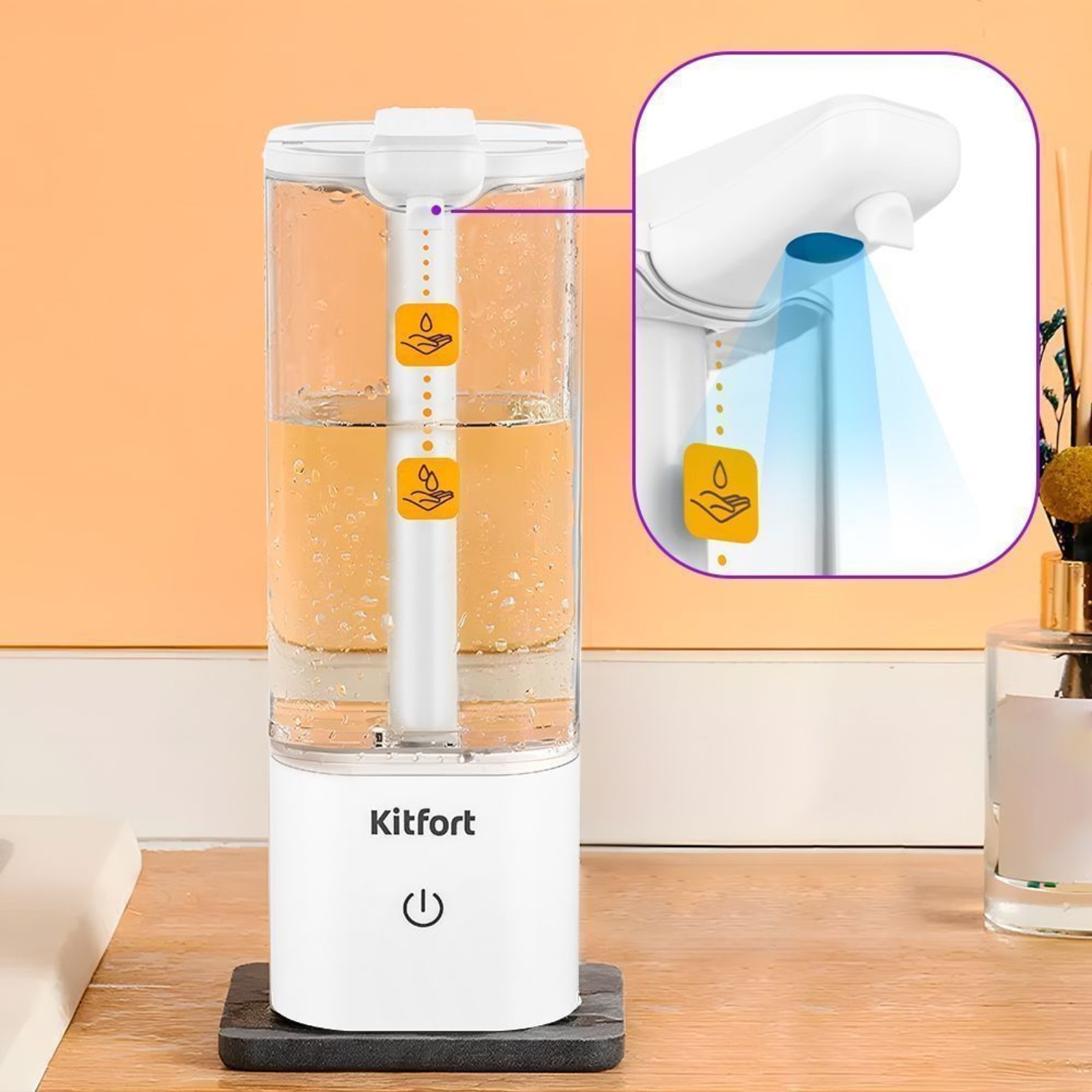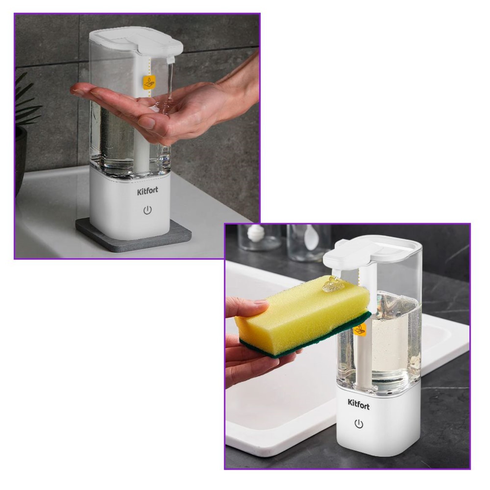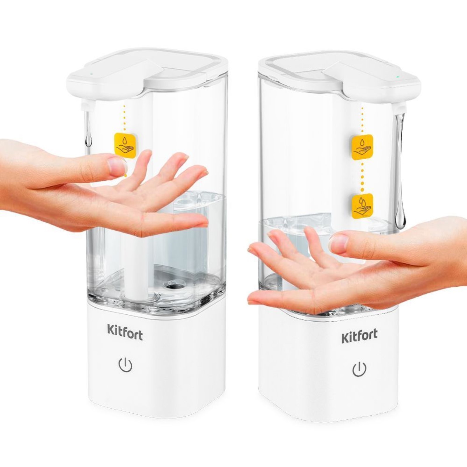 Сенсорный диспенсер для жидкого мыла kitfort кт-6064-1, 2.5 вт, 550 мл, белый. Сенсорный диспенсер КТ-6064 – устройство для порционной выдачи негустых средств. Прибор будет полезен в ванной комнате и на кухне. Его можно использовать для подачи жидкого мыла, средства для мытья посуды, геля для душа и других негустых средств. Инфракрасный сенсор расположен под носиком для подачи средства. Он реагирует на поднесение руки, губки для мытья посуды или другого предмета. Использование сенсорного диспенсера считается более гигиеничным, так как не требует контакта с поверхностью. У диспенсера 2 режима подачи средства. Если вы поднесёте руку ближе к носику прибора, диспенсер выдаст немного средства, а если расположить руку ниже, объём выдаваемого средства увеличится. Прозрачный резервуар позволяет отслеживать уровень жидкости в диспенсере. Ёмкость легко наполнять средством – необходимо просто снять крышку с резервуара и залить жидкость внутрь. Ёмкость диспенсера 550 мл. Устройство работает от 4 батареек типоразмера АА X 1, 5 В. Батарейки в комплект не входят. У прибора есть функция самоочистки, что поможет вам легко удалить остатки средства из дозирующего механизма. Также устройство оснащено защитой от водяных брызг, поэтому его можно устанавливать во влажном помещении. Тип питания: От батареек Цвет: Белый Цвет: Прозрачный Форма: Прямоугольная Мощность, Вт: 2.5 Объём, л: 0.55 Количество отсеков: 1 Объём, мл: 550 Материал: Пластик Вид установки: Настенный (навесной) Дисплей: Нет Назначение: Для жидкого мыла Бесконтактный: Да С ключом: Нет Способ заправки: Наливной Механизм управления: Сенсорный  развернуть описание ▼